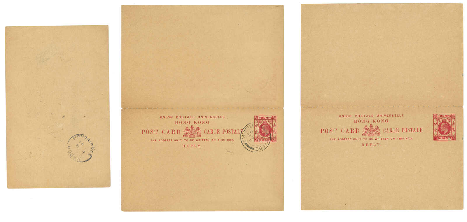 1903-1909 a group of 3 Hong Kong KEVII stationery cards, including 1c (Yang P19), 4c single card (Yang P22) and 4c double card (Yang P23), commerically used from Hong Kong, Chefoo and Shanghai BPO.