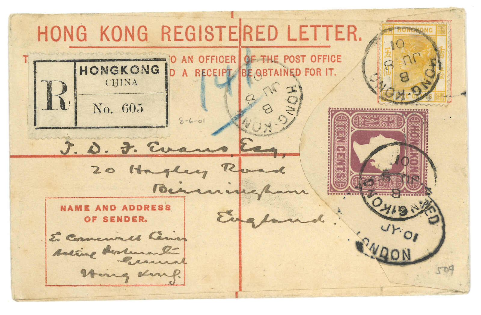 1901 (8 Jun) Hong Kong QV 10c registered stationery cover (size F 3-1/4 x 5-1/4 inch) to England, uprated by 5c, tied by Hong Kong index B cds, alongside with registered label. Transit London (Jul). Arrived Birmingham (7 Jul).