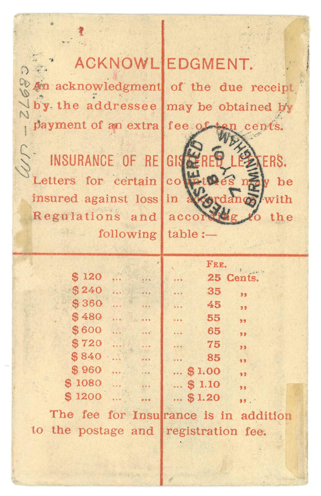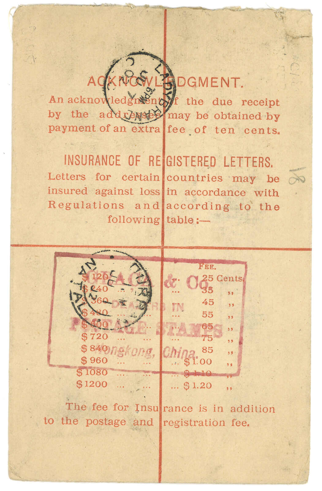 1901.6.8 香港維多利亞女皇像10仙掛號郵資封(size F 3-1/4 x 5-1/4 inch)寄英國,加貼5仙,銷香港B字日,旁貼掛號標籤。7月經倫敦。7.8抵伯明翰。加貼5仙故溢貼1仙。(Image