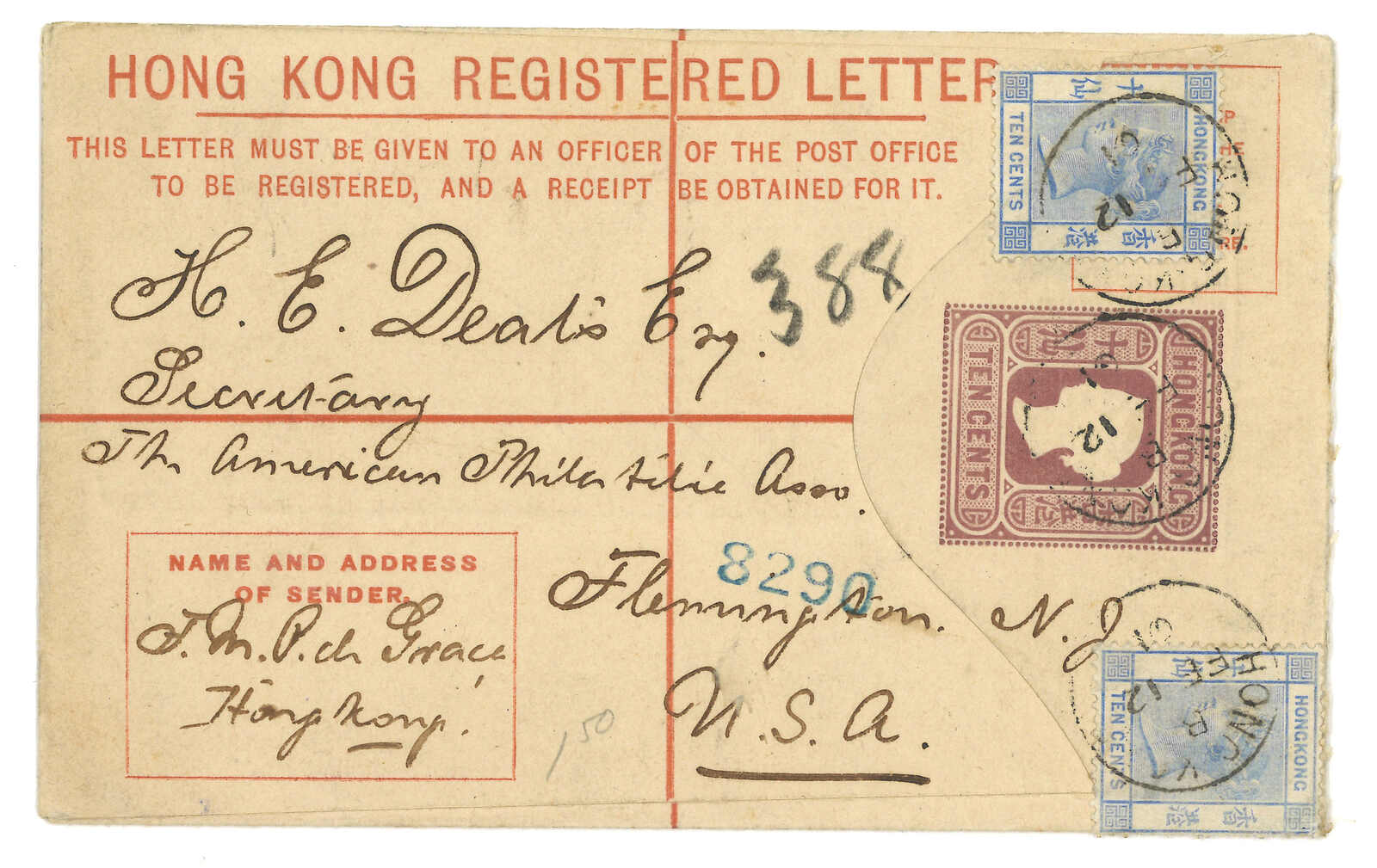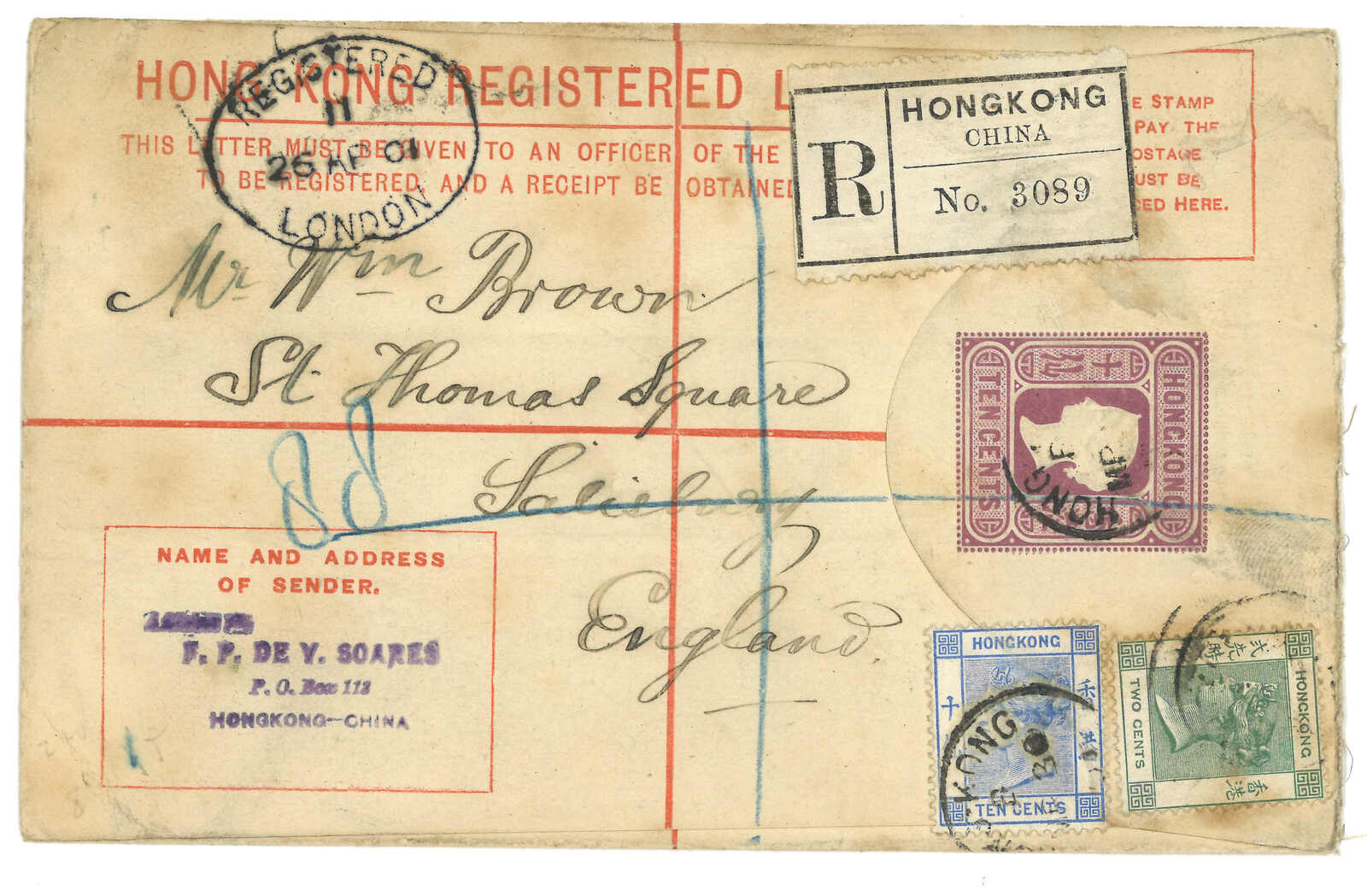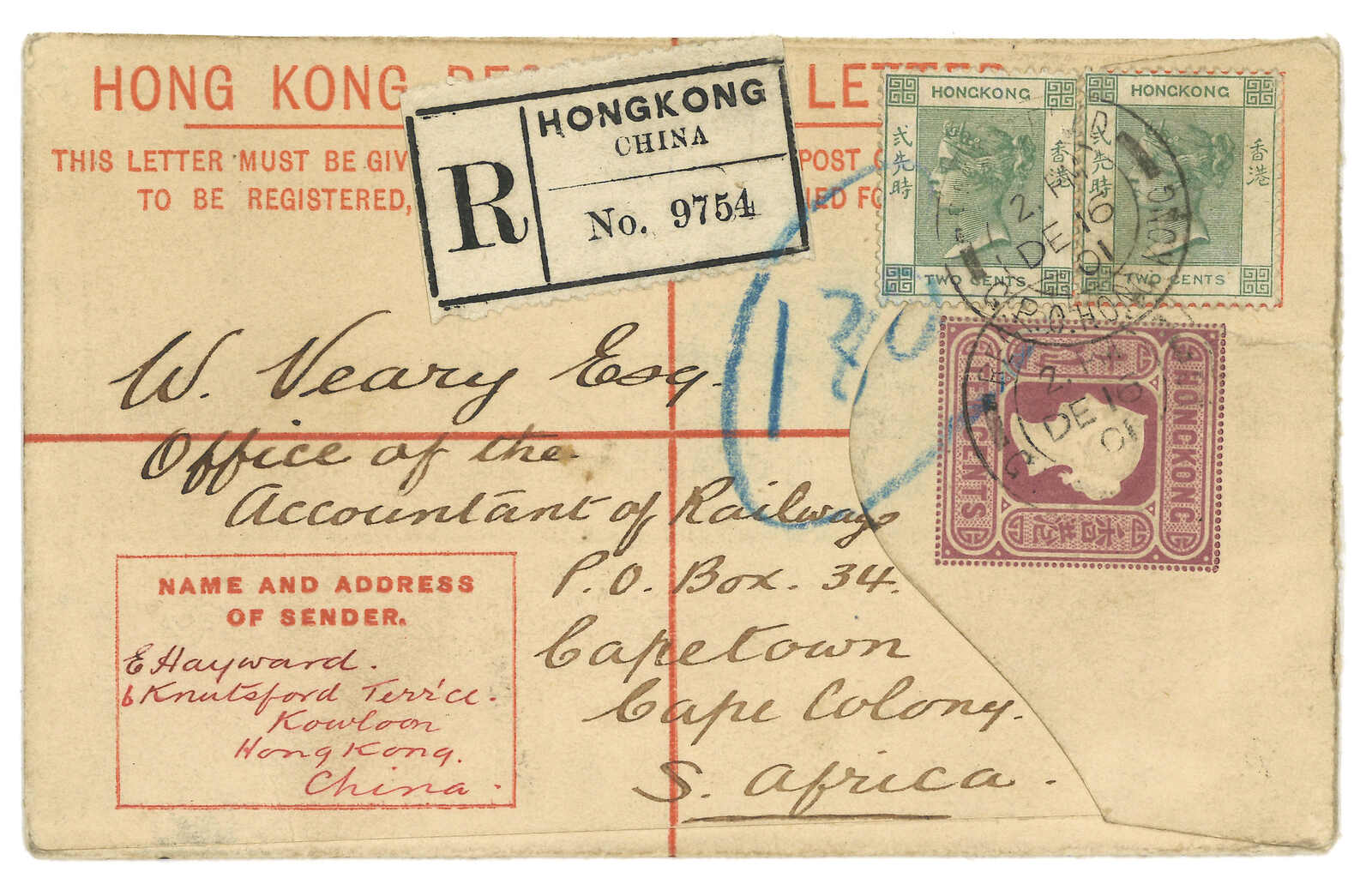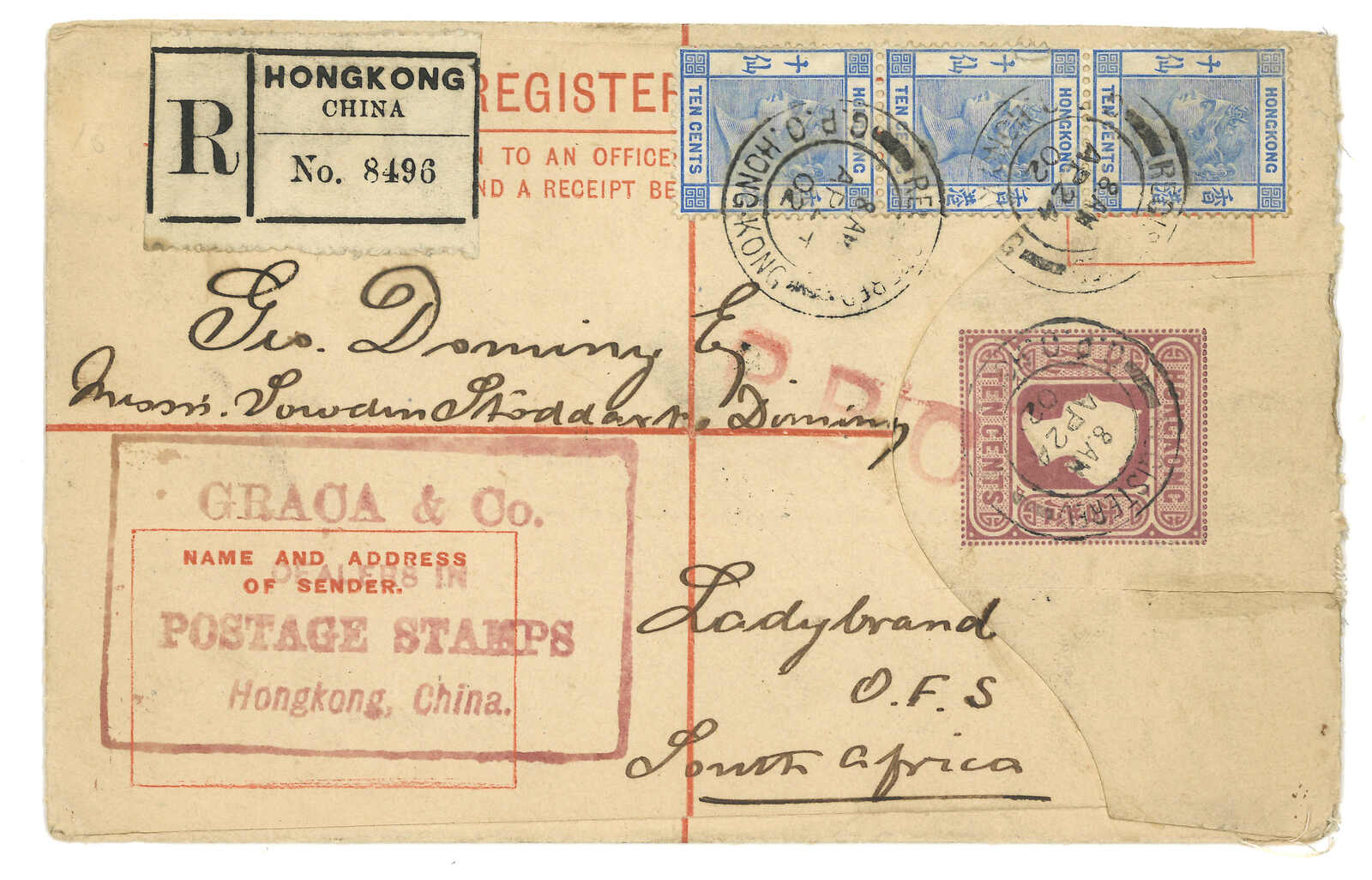 1902 (24 Apr) Hong Kong QV 10c registered stationery cover (size G 3-3/4 x 6 inch) to South Africa, uprated by 2x 10c, tied by Registered GPO cds, alongside with registered label. Arrived Ladybrand (7 Jun). Exceptional high