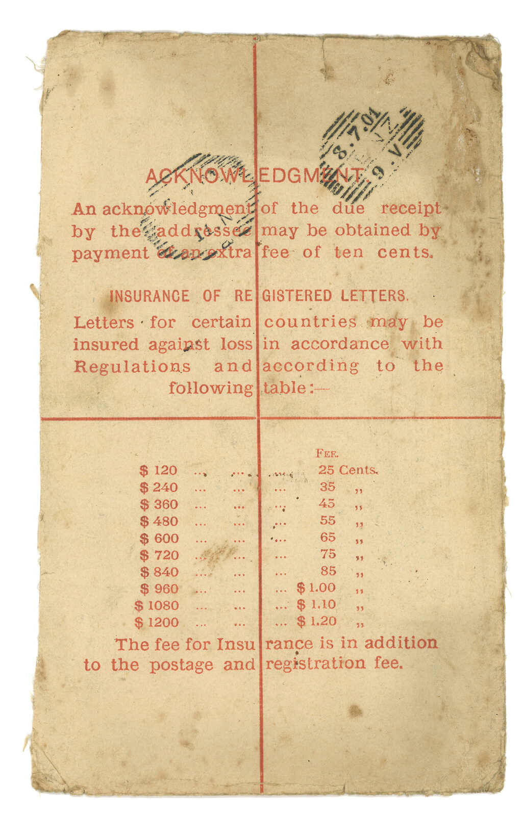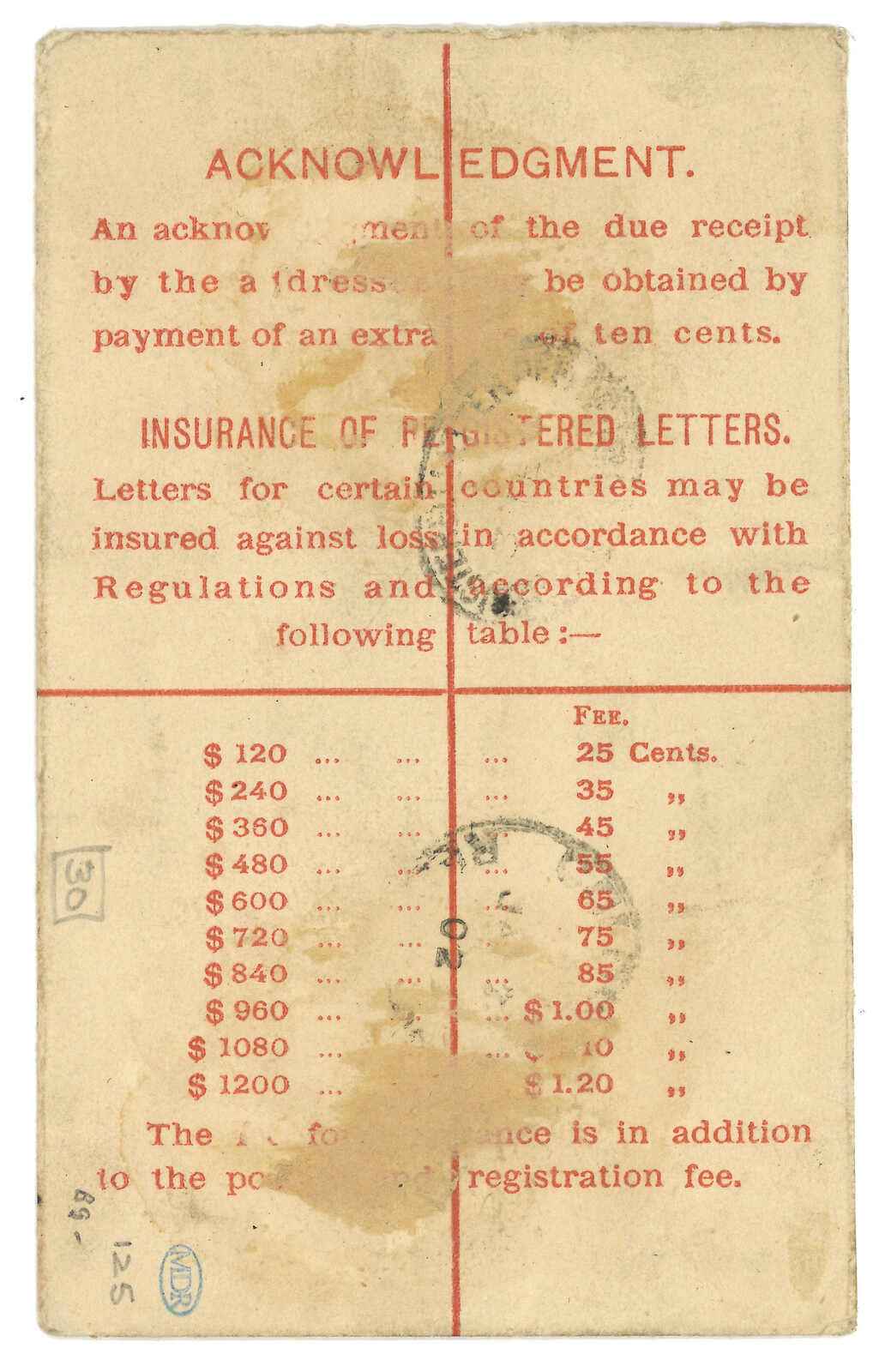 1901.4.25 香港維多利亞女皇像10仙掛號郵資封(size F 3-1/4 x 5-1/4 inch)寄荷蘭,加貼10仙雙連,銷香港E字日戳,旁見掛號標籤及“Per English mail s.s. Sobraon”注示。抵阿姆斯特丹。(Image 1)