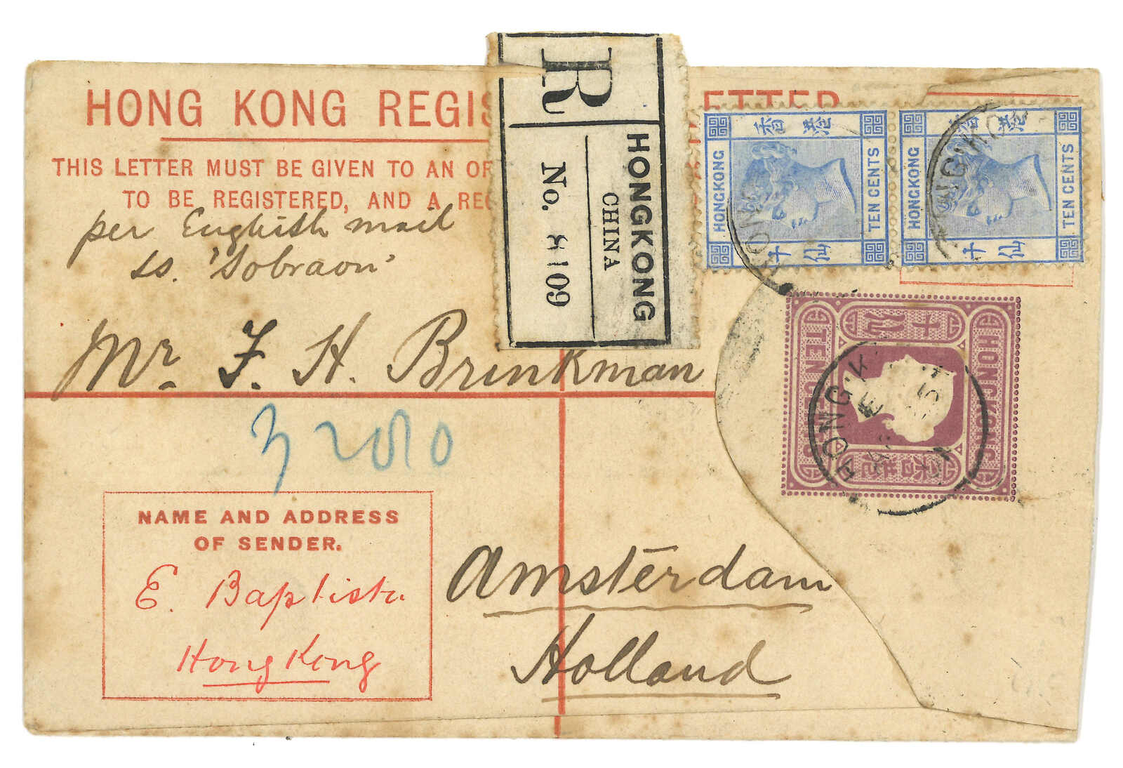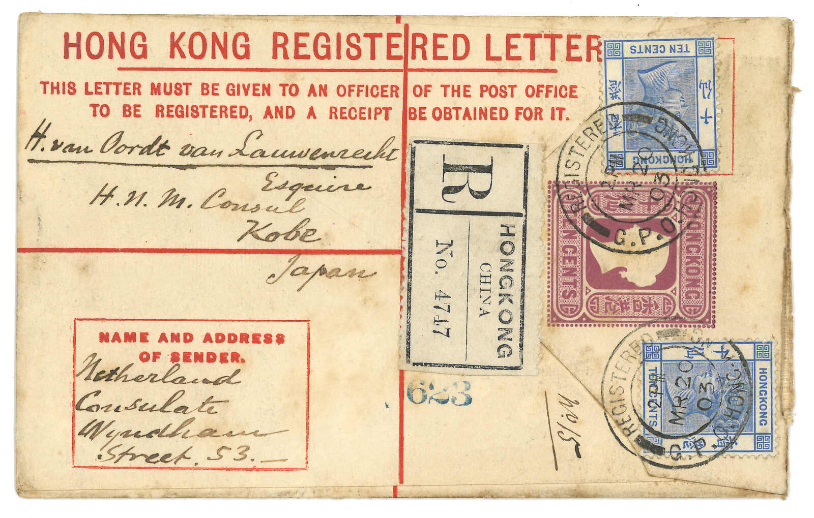 1903 (20 Mar) Hong Kong QV 10c registered stationery cover (size F 3-1/4 x 5-1/4 inch) from Dutch Consul Hong Kong to Dutch Consul Japan, uprated by 2x 10c, tied by Registered GPO cds., alongside with registered label. Arrived