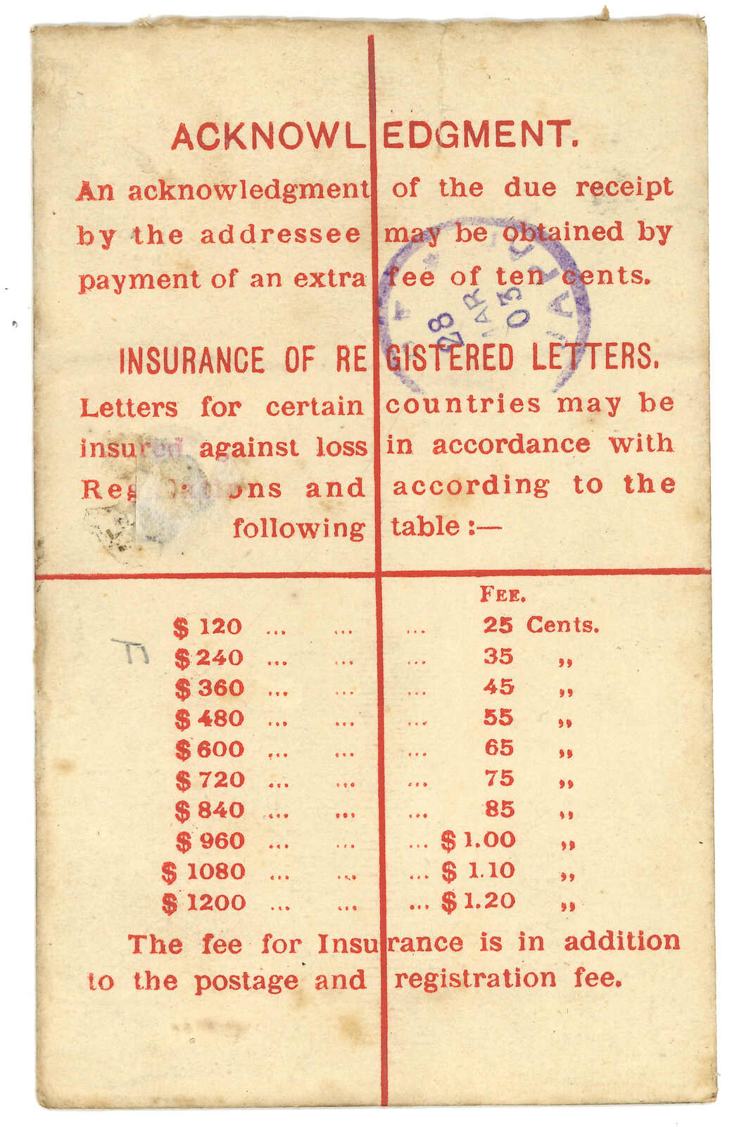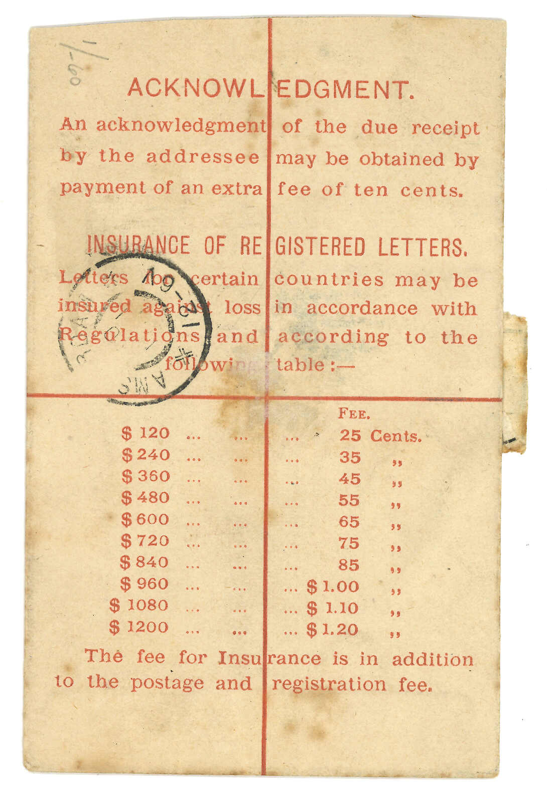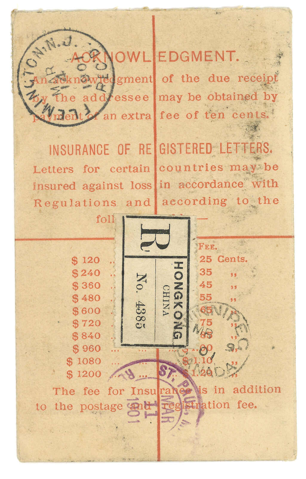 1901.2.12 香港維多利亞女皇像10仙掛號郵資封(size F 3-1/4 x 5-1/4 inch)寄美國,加貼2x 10仙,銷香港B字日戳。背貼掛號標籤。3.14抵Flemington。(Image 1)