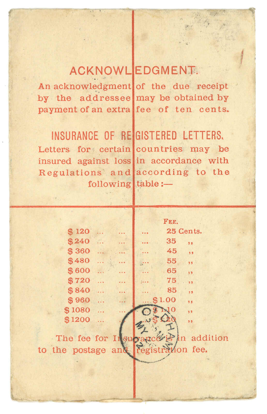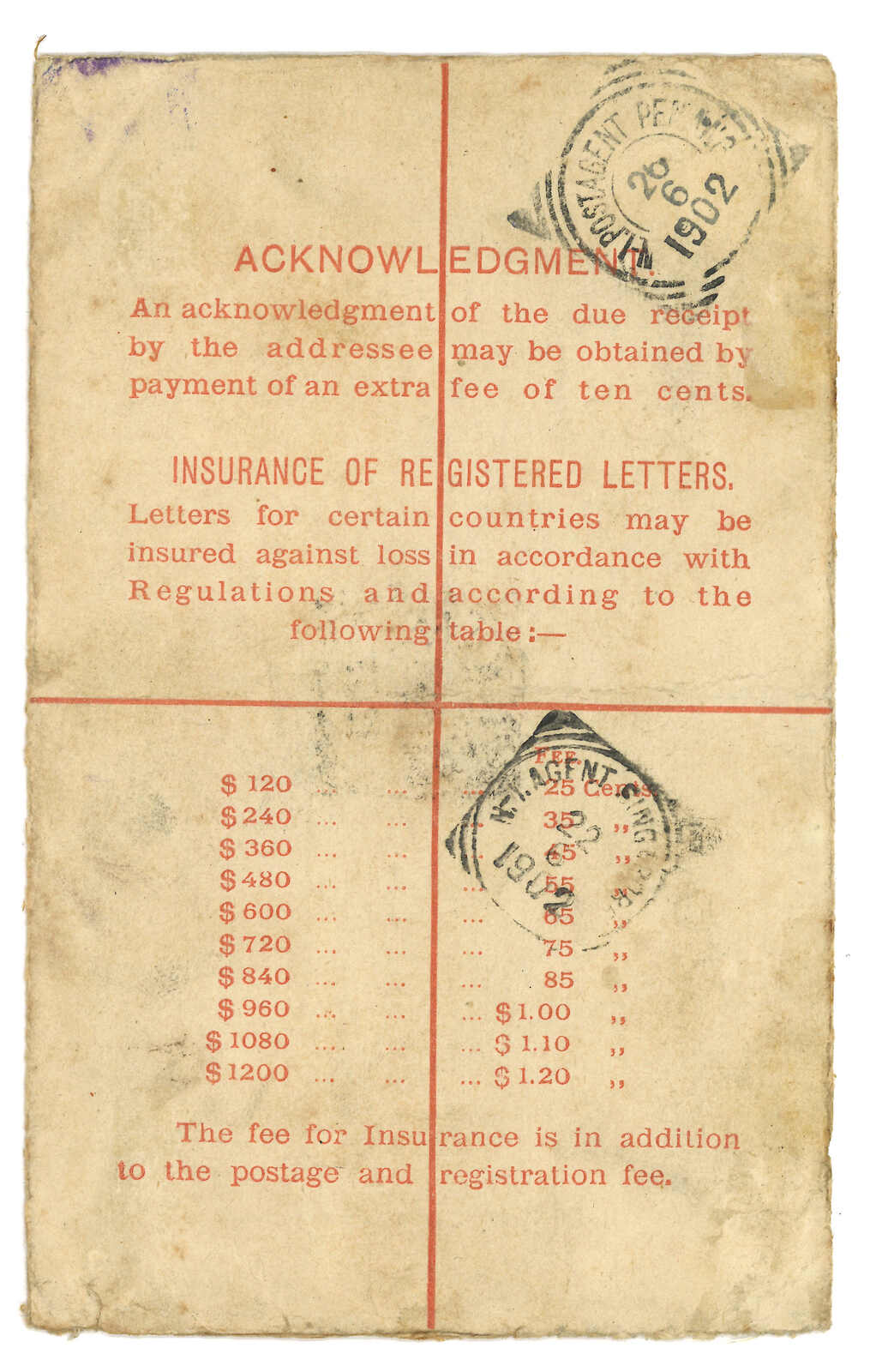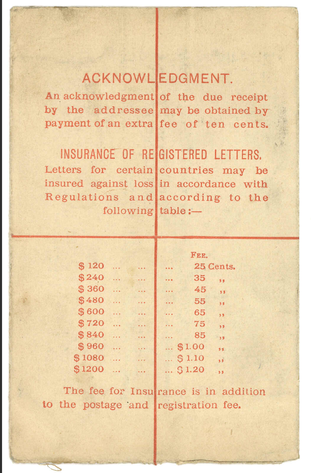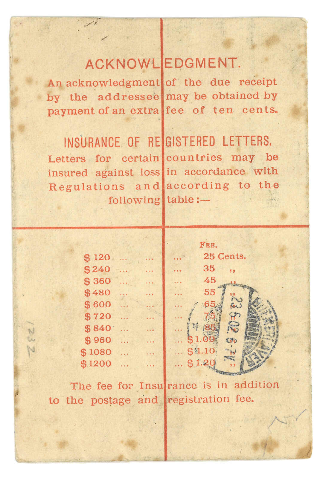 1901.2.12 香港維多利亞女皇像10仙掛號郵資封(size F 3-1/4 x 5-1/4 inch)寄美國,加貼2x 10仙,銷香港B字日戳。背貼掛號標籤。3.14抵Flemington。(Image 1)