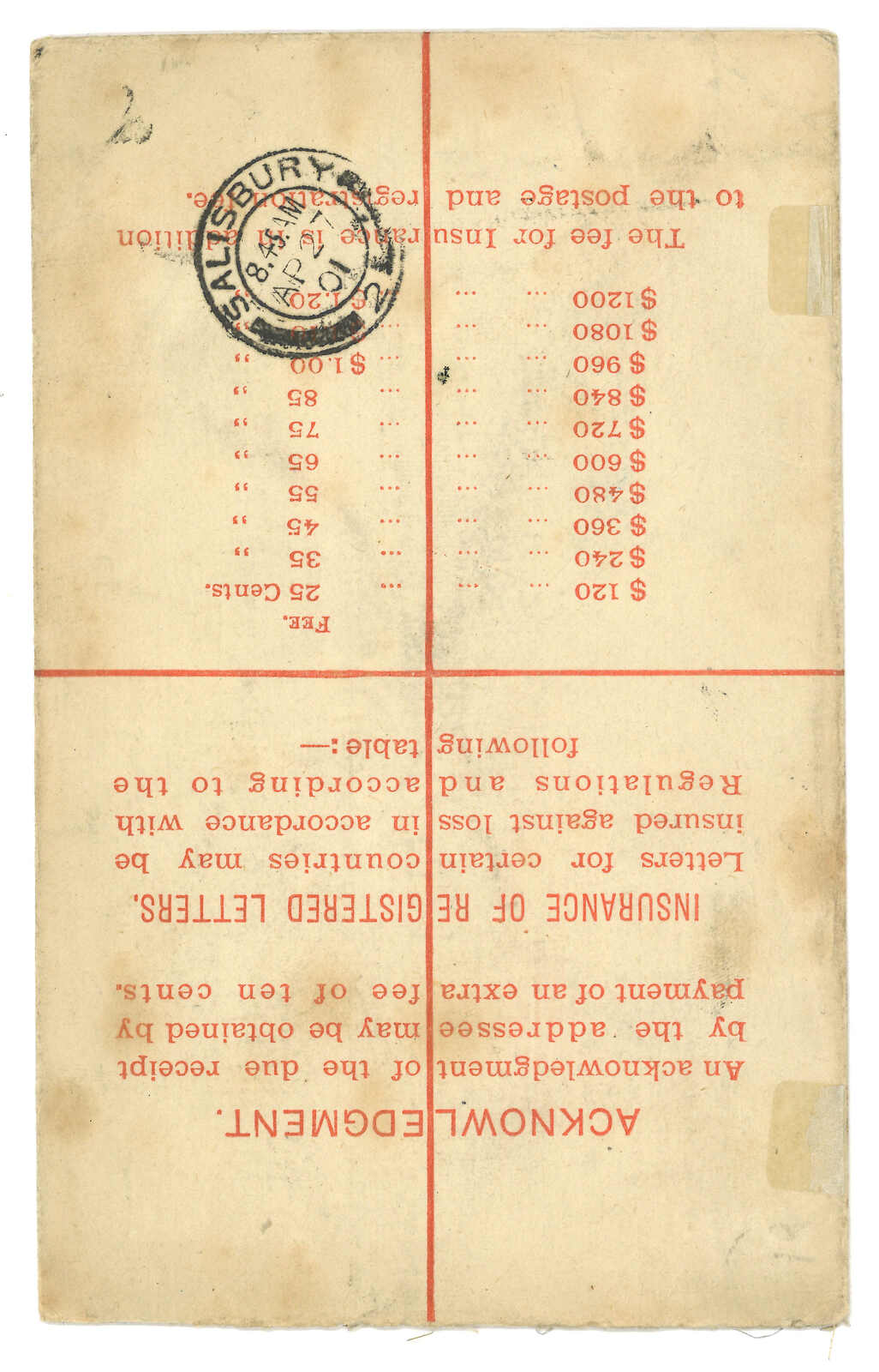 1901.3.30 香港維多利亞女皇像10仙掛號郵資封(size G 3-3/4 x 6 inch)寄英國,加貼2仙 + 10仙,銷香港B字日戳,旁貼掛號標籤。4.26經倫敦,4.27抵Salisbury。三倍郵資例。(Image 1)