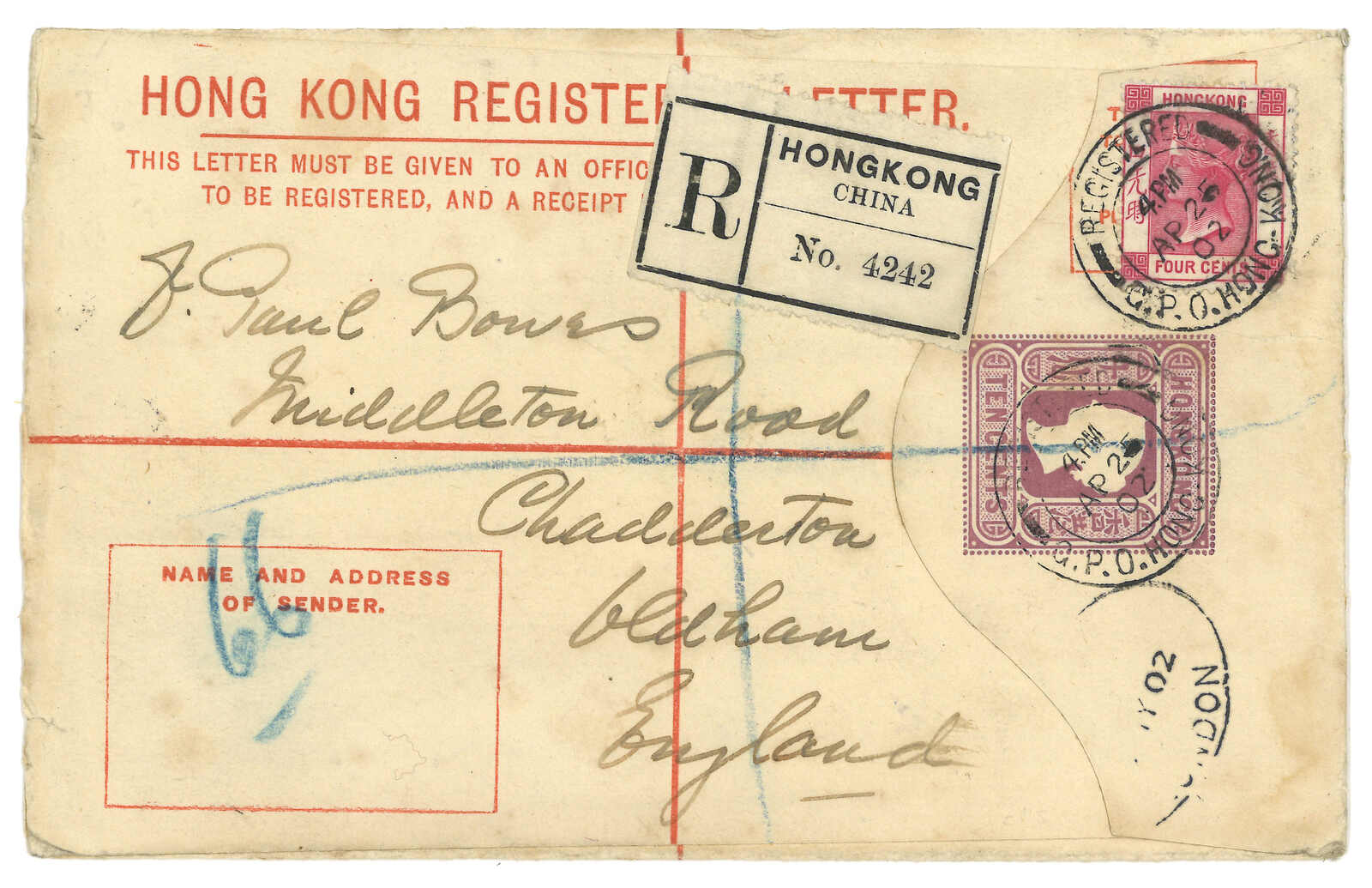 1902 (25 Apr) Hong Kong QV 10c registered stationery cover (size G 3-3/4 x 6 inch) to England, uprated by 4c, tied by Registered GPO cds., alongside with registered label. Transit London. Arrived Oldham (26 May).