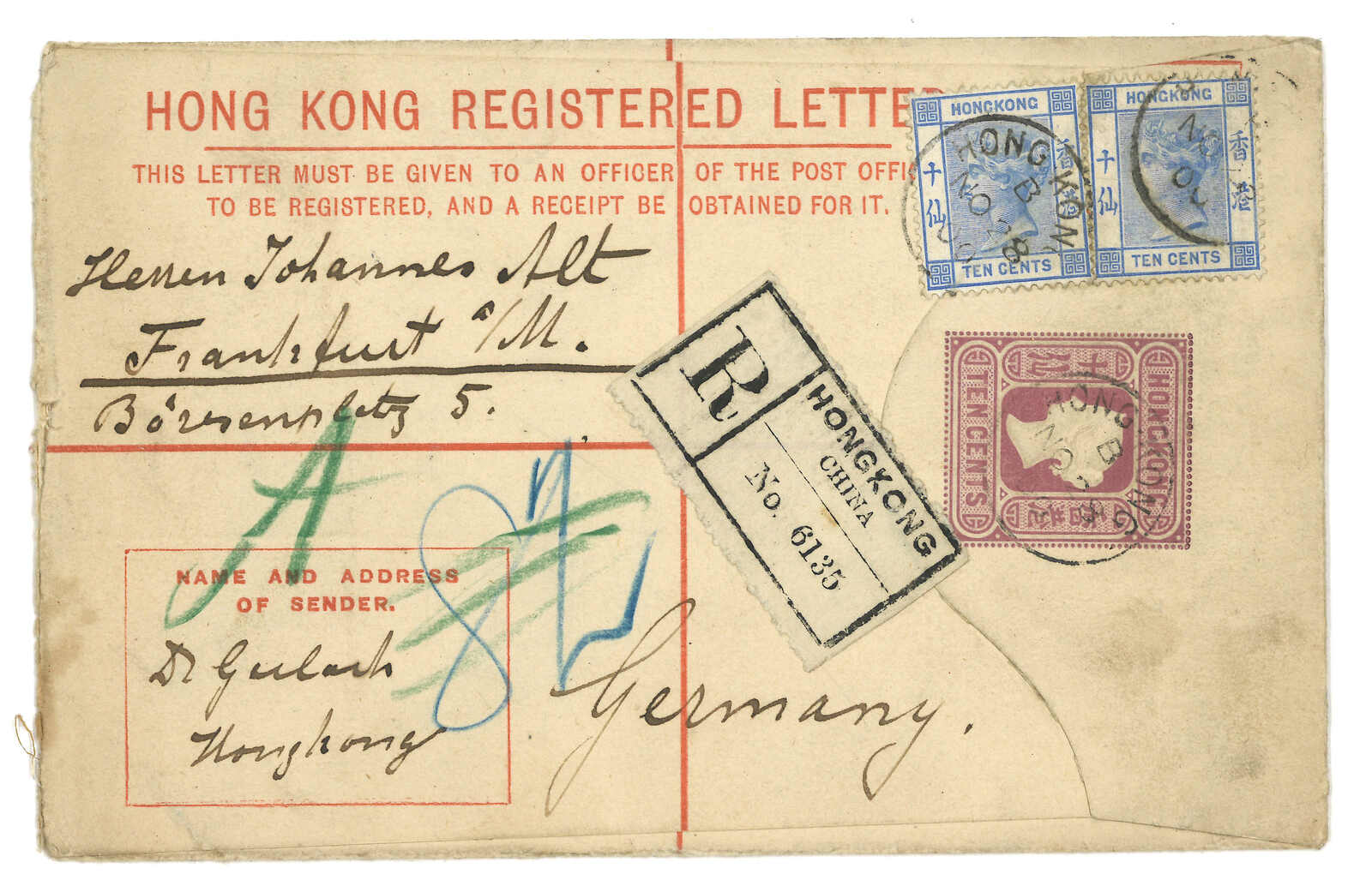 1901.6.4 香港維多利亞女皇像10仙掛號郵資封(size H 5 x 8 inch)寄奧國,加貼改值20仙蓋30仙連中文字雙連,銷香港F字日戳,旁見掛號標籤。到埗改寄Lenz(7.8)。(Image 1)