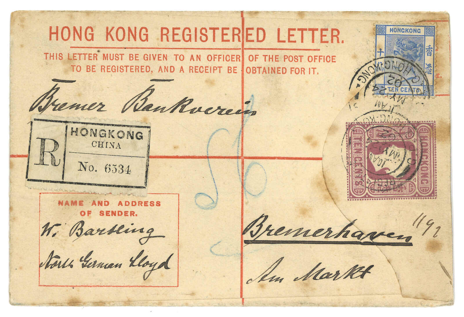 1902 (24 May) Hong Kong QV 10c registered stationery cover (size G 3-3/4 x 6 inch) to Germany, uprated by 10c, tied by Registered GPO cds, alongside with registered label. Arrived Bremenhaven (23 Jun). With light toning