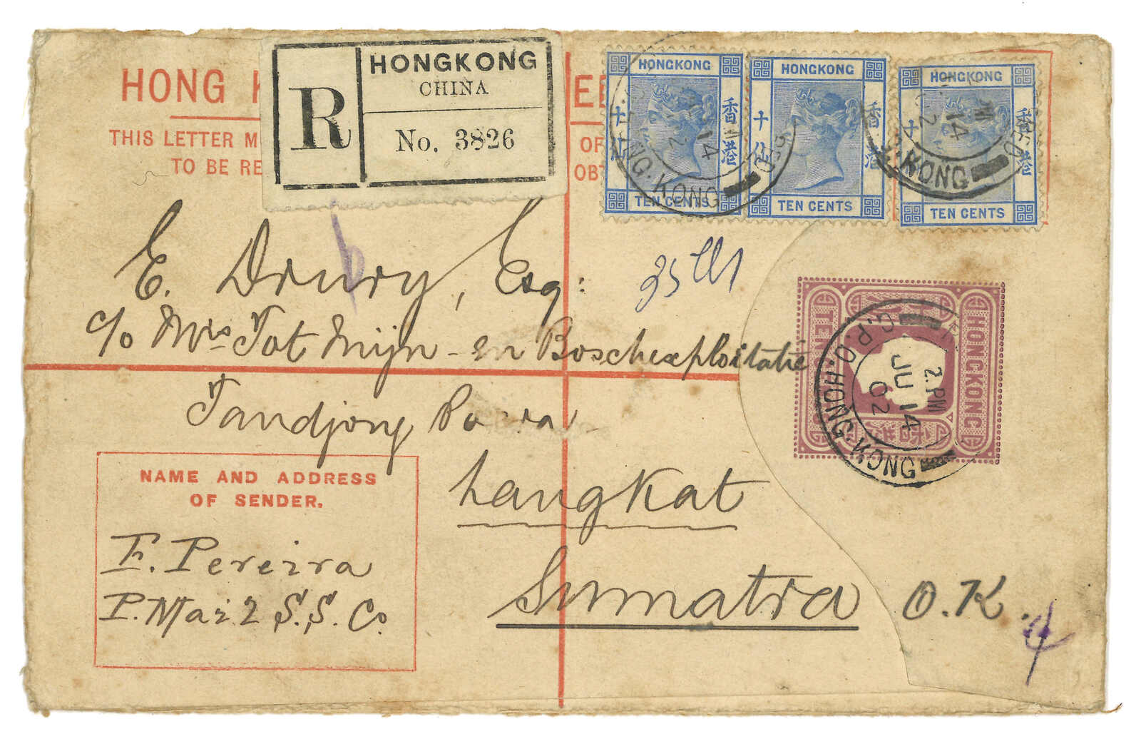 1902.6.14 香港維多利亞女皇像10仙掛號郵資封(size G 3-3/4 x 6 inch)寄印尼,加貼10仙橫三連,銷總局掛號日戳,旁見掛號標籤。6.22經新加坡代理,6.26經檳城代理。(Image 1)