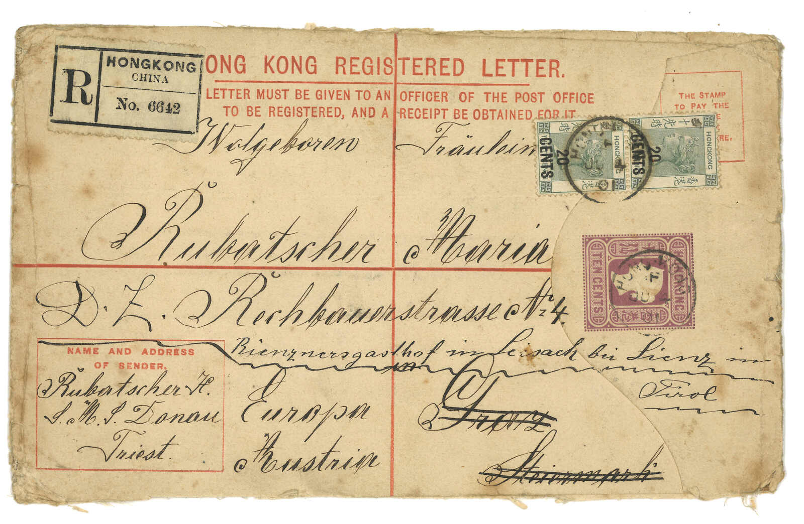 1901 (4 Jun) Hong Kong QV 10c registered stationery cover (size H 5 x 8 inch) to Austria, uprated by surch 20c/30c with Chinese character in pair, tied by Hong Kong index F cds, alongside with registered label. Redirected to