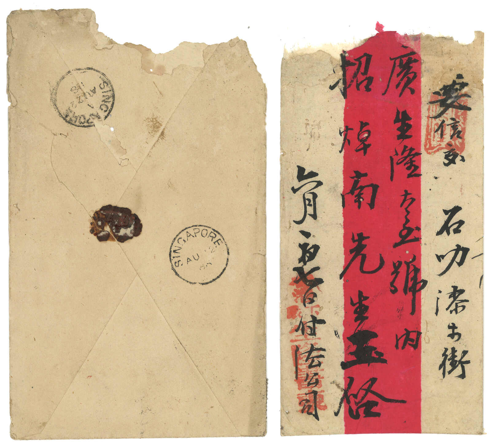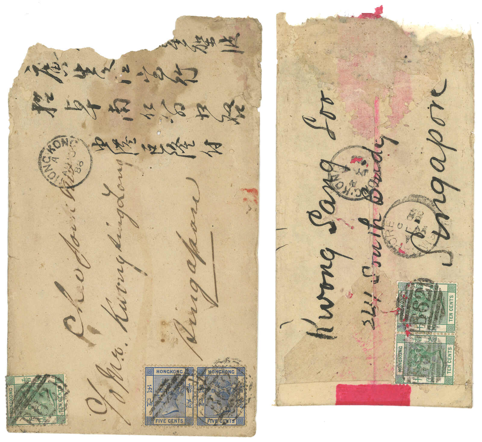 3232 cover image1880s a pair of covers from Hong Kong to Kwong San Hong, Singapore, both f.w. Hong Kong QV issues for 20c, tied by B62 obliterator, alongside with Hong Kong cds and Singapore arrival cds. Covers roughly opened. One with original letter.