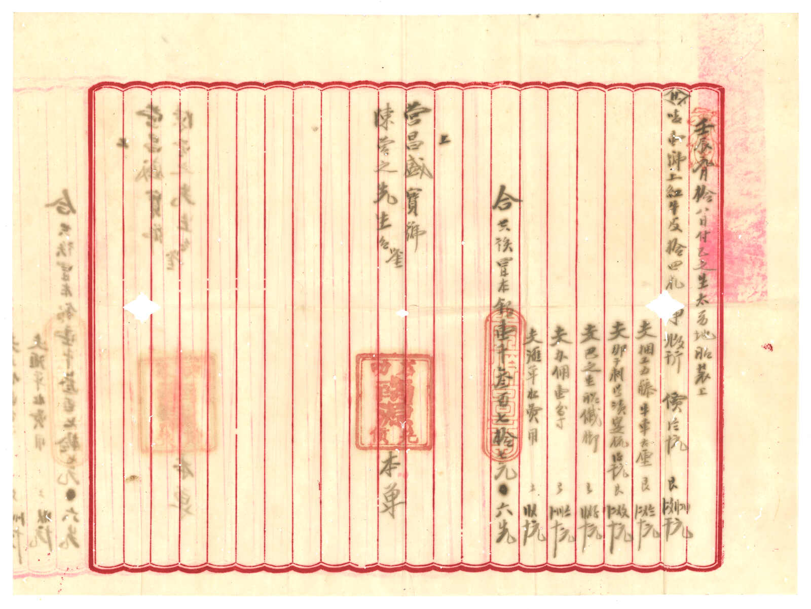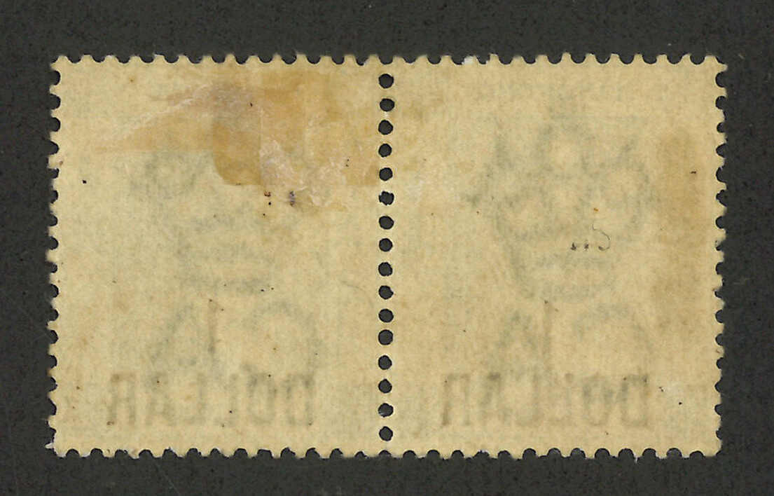 1891年香港維多利亞女皇像第五次改值50仙蓋48仙橫雙連新,左方一枚中文字加蓋於右邊(楊目46),背貼。雖然R N Gurevitch認為此變異應為私蓋,但仍十分有趣難得。(Image 1) (Image 2)