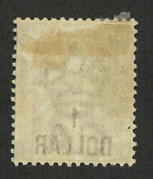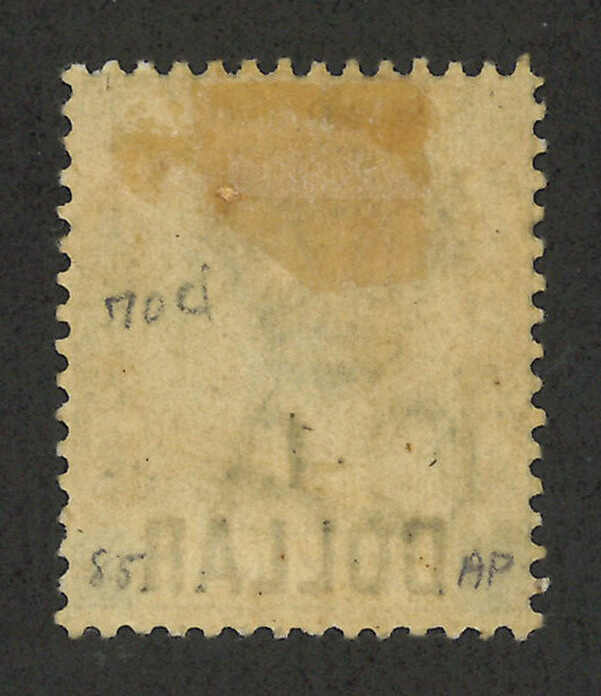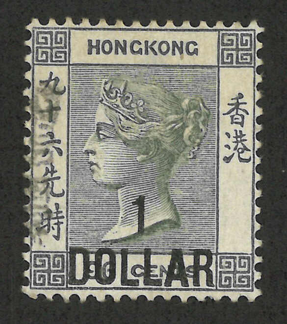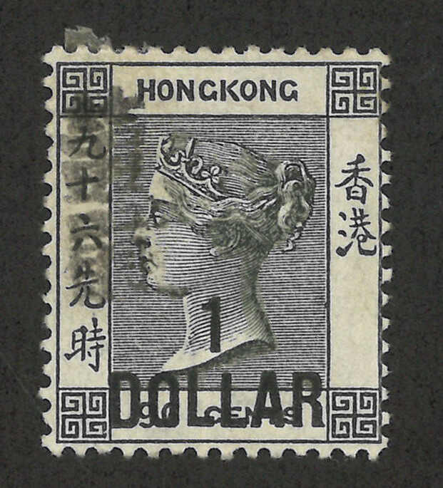 1898年香港維多利亞女皇像第七次改值1元蓋96仙新,帶中文字複蓋變異(楊目51b),背貼。R N Gurevitch認為此變異應為真。目錄價港幣4000元。(Image 1) (Image 2)