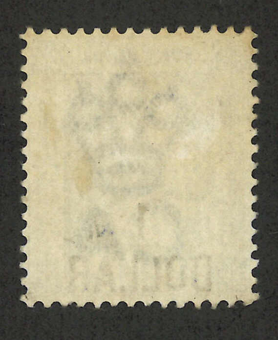 1898年香港維多利亞女皇像第七次改值1元蓋96仙新,帶中文字倒蓋變異(楊目51c),無貼。R N Gurevitch認為此變異應為真。目錄價港幣6000元。(Image 1) (Image 2)