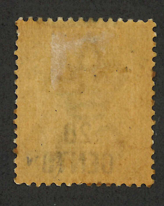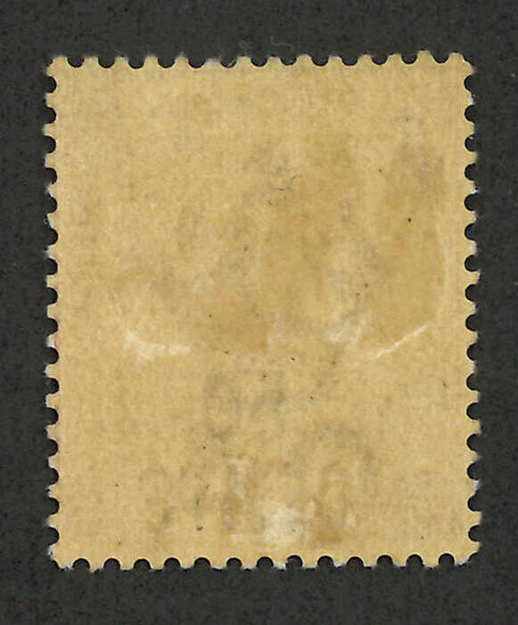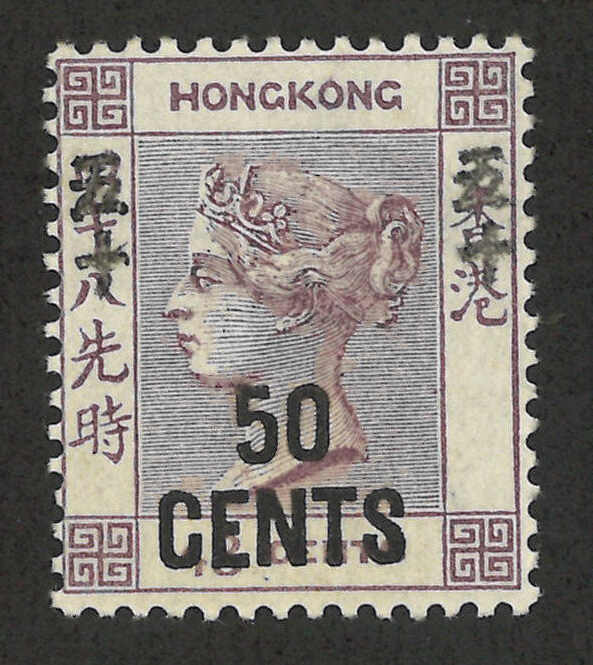 1891年香港維多利亞女皇像第五次改值50仙蓋48仙新,帶中文字複蓋變異(楊目46b),背貼。R N Gurevitch認為此變異應為真。目錄價港幣2500元。(Image 1) (Image 2)