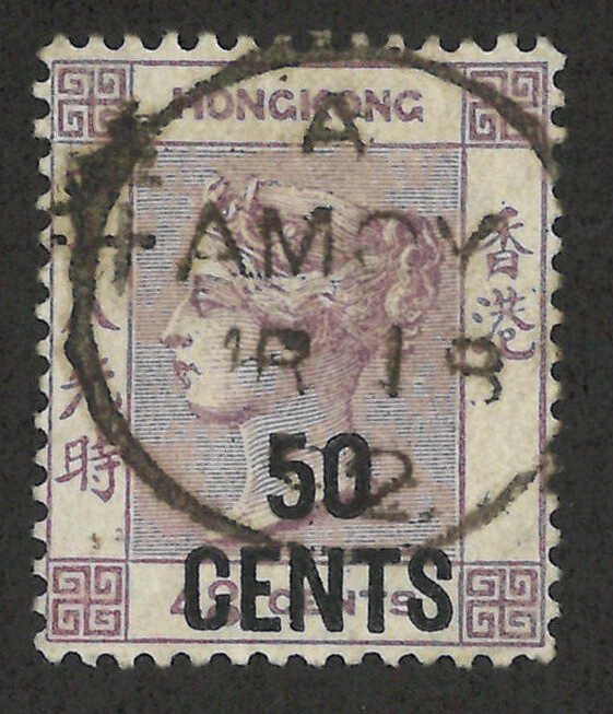 1776 o image1891 Hong Kong QV 5th surch issue 50c/48c, with double Chinese character variety (Yang 46b), tied by Amoy BPO cds. R N Gurevitch recorded that this variety is probably genuine. Catalogue price HKD$2500.