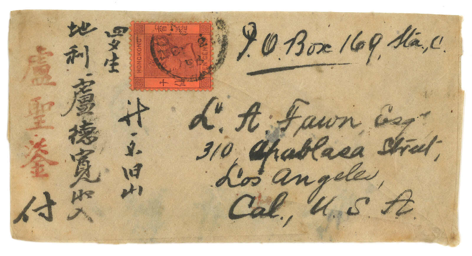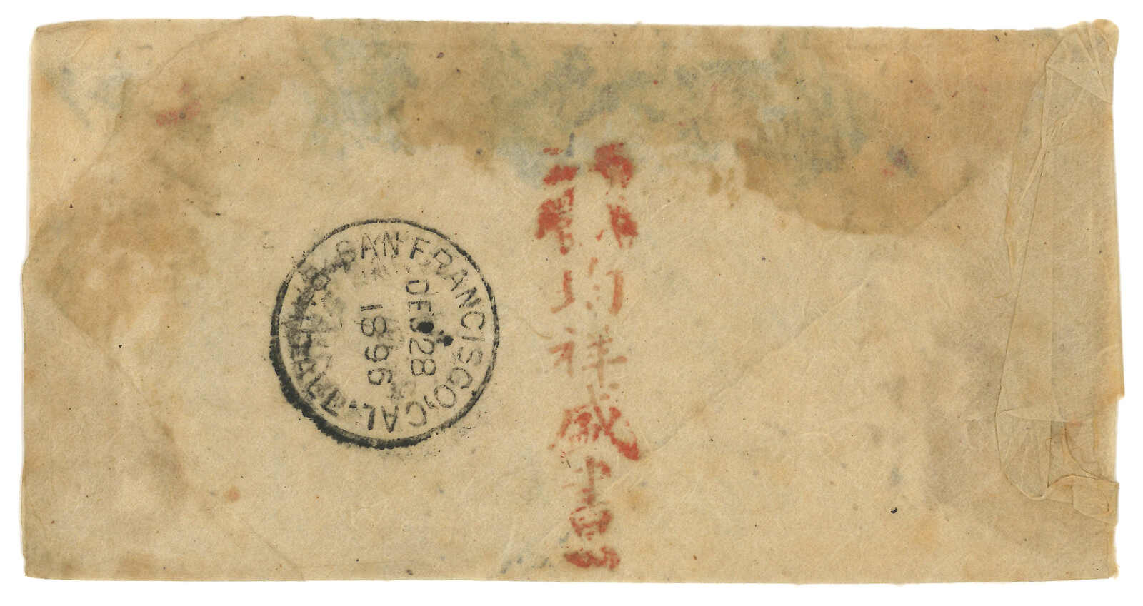 1893.12.2 香港寄美國,貼香港維多利亞女皇像10 仙。12.28抵美國。背面鈐“均祥盛書柬”直戳。(Image 1) (Image 2)