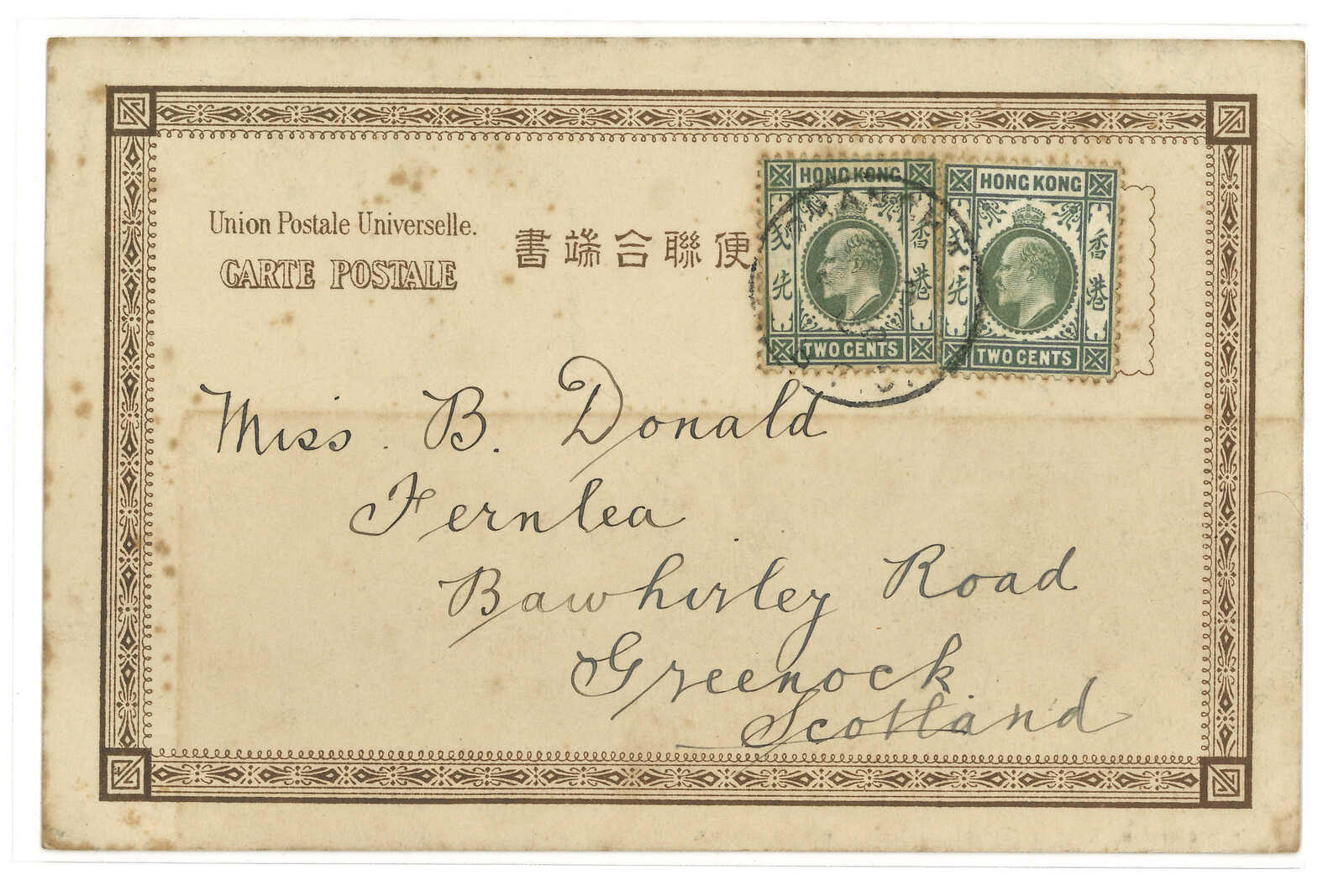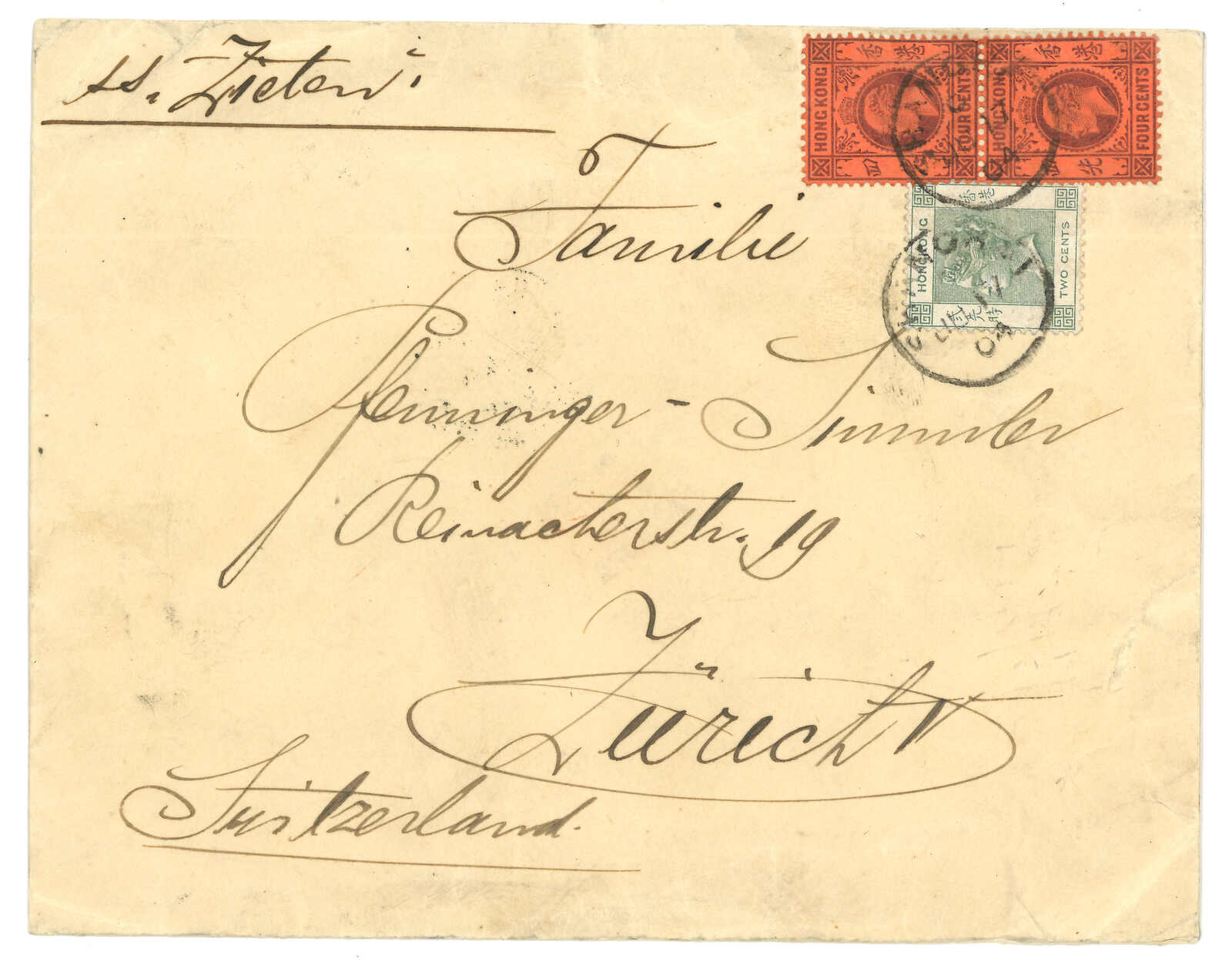 2903 cover image1904 Shanghai (17 Jun) to Switzerland, f.w. Hong Kong QV 2c + KEVII 4c in pair, tied by Shanghai BPO cds. Arrived Zurich (22 Aug).