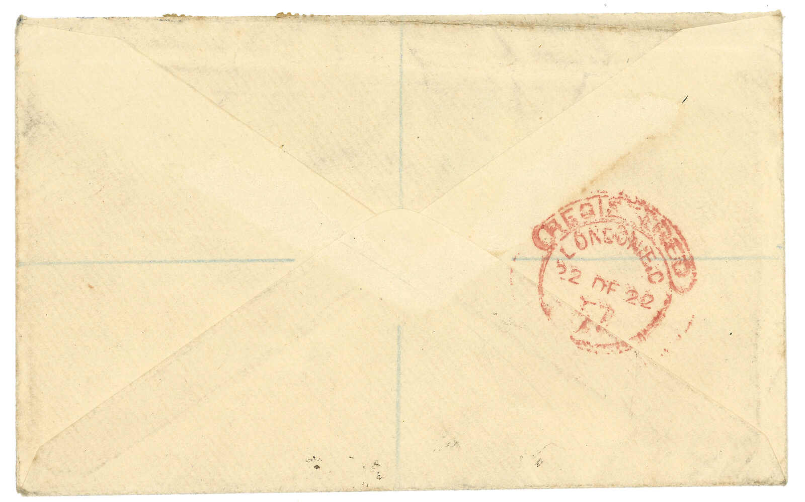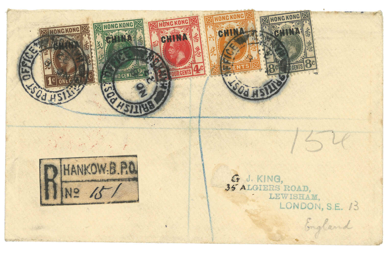 1922.11.8 漢口寄英國。掛號封,貼香港佐治五世加蓋CHINA 1仙 + 2仙 + 4仙 + 6仙 + 8仙,銷漢口英局Webb M型日戳,旁貼R2型掛號標籤。12.22抵倫敦。加蓋CHINA票實寄少見。Neil Christensen舊藏。2008.1.20 斯賓克中國,拍品號1316。(Image 1) (Image 2)