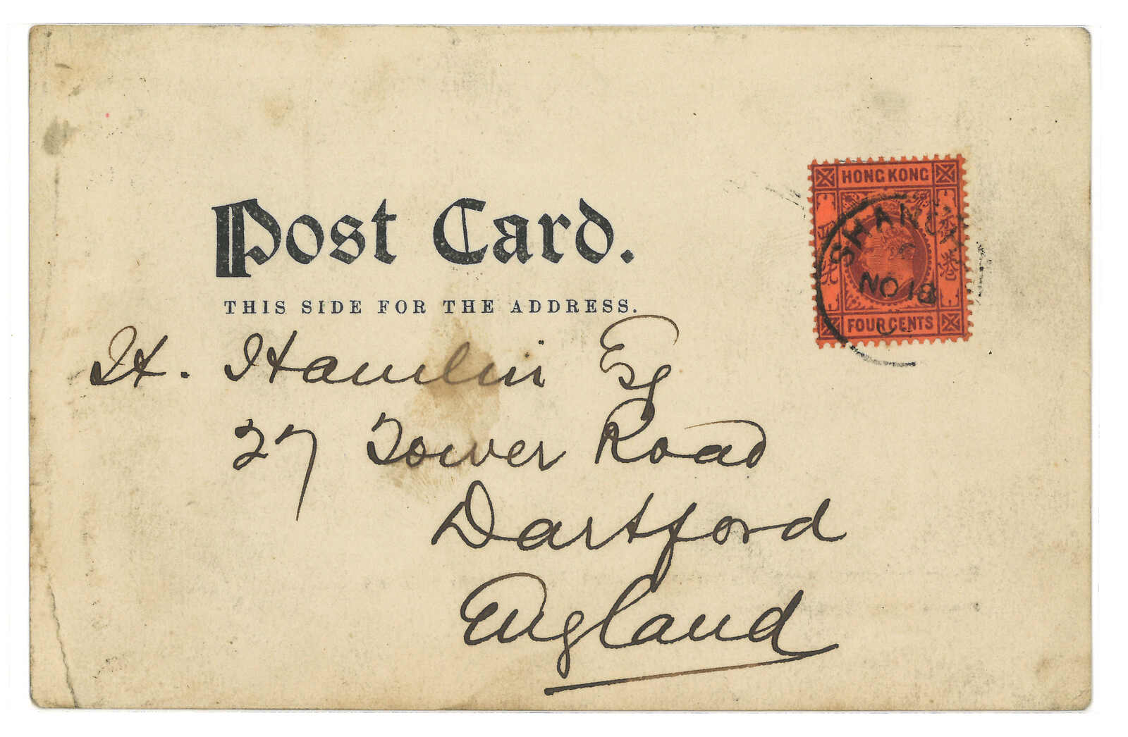 1902.7.24 上海寄英國。掛號封,貼香港維多利亞女皇像2仙 + 3x 4仙,合14仙,銷上海英局日戳,旁鈐R章。8.27抵倫敦。自1902年2月1日,商埠寄所有國家均收取4仙(加上10仙掛號費用,構成此例之14仙)。(Image 1) (Image 2)