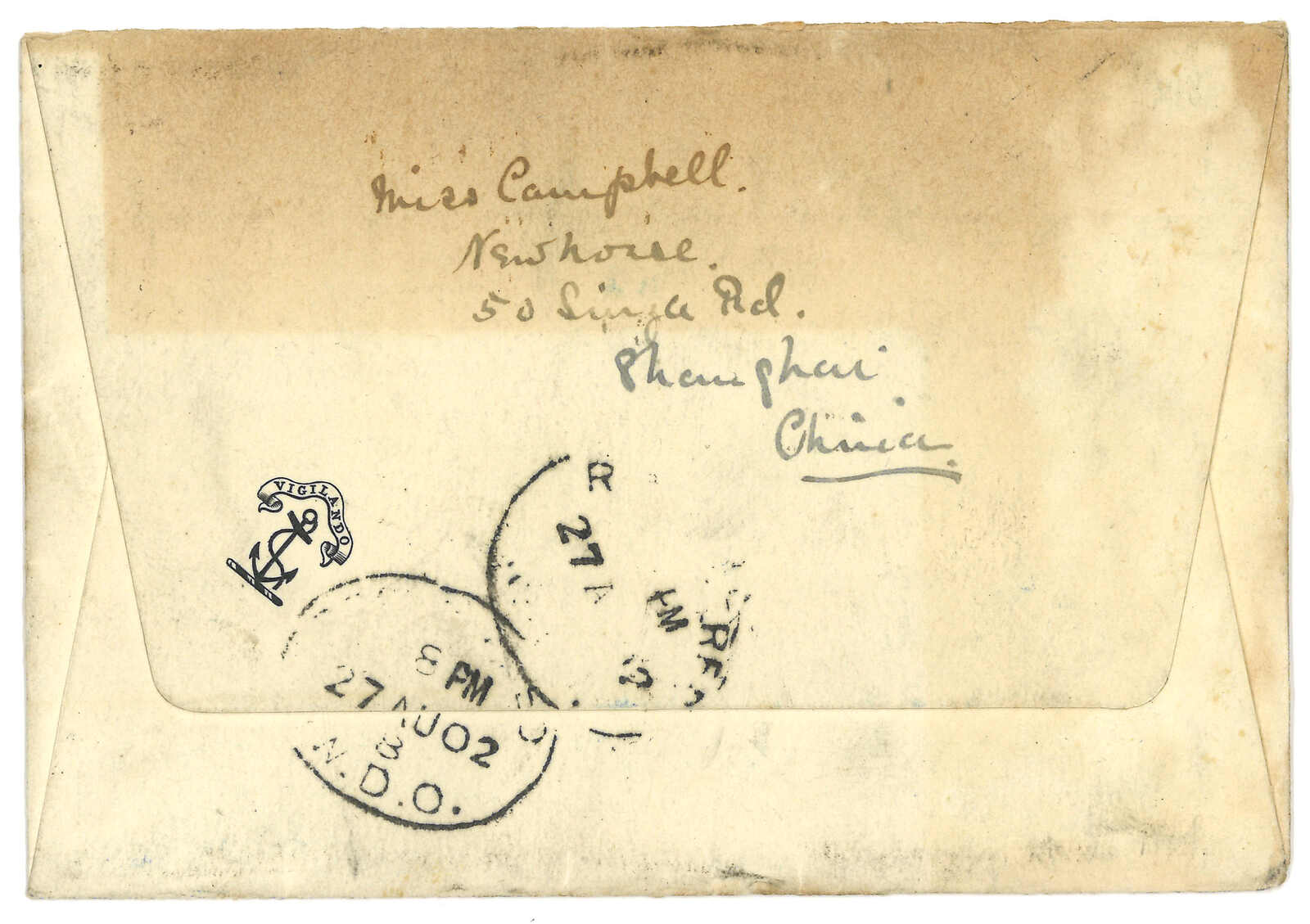 2902 cover image1902 Shanghai (24 Jul) to England. Registered cover, f.w. Hong Kong QV 2c + 3x 4c, in total of 14c, tied by Shanghai BPO cds, alongside with R mark. Arrived London (27 Aug). Since 1 Feb 1902, rate from treaty port to all countries was 4c (+ 10c registration fee = 14c in this example).
