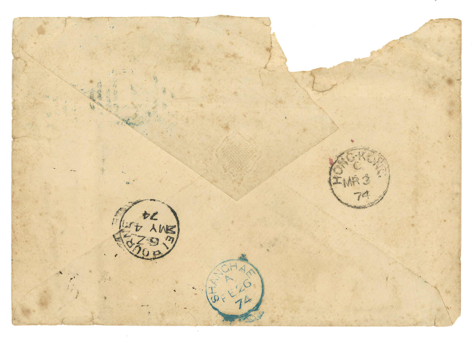 1874.2.26 上海寄澳洲,貼香港維多利亞女皇像4仙 + 8仙 + 12仙,合24仙寄澳洲郵資,銷S1藍色殺手戳,背面蓋有上海英局日戳。3.3經香港。5.4抵墨爾本。封左上方有損。(Image 1) (All Images)