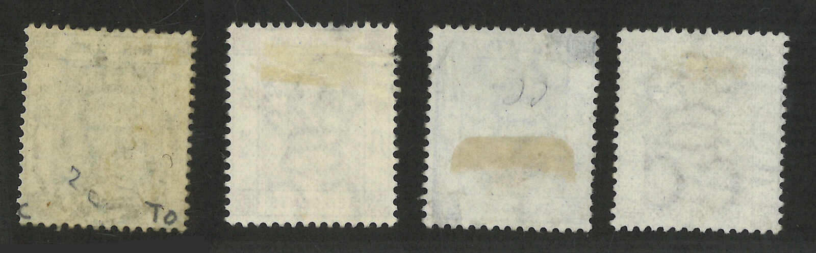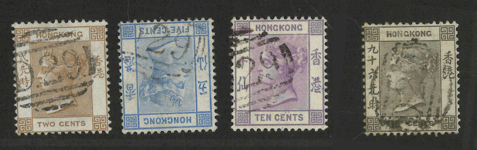 1870至1890年代一組四枚香港維多利亞女皇像舊票,均銷少見之漢口英局D29殺手戳,面值包含2仙、10仙及96仙。(Image 1) (Image 2)