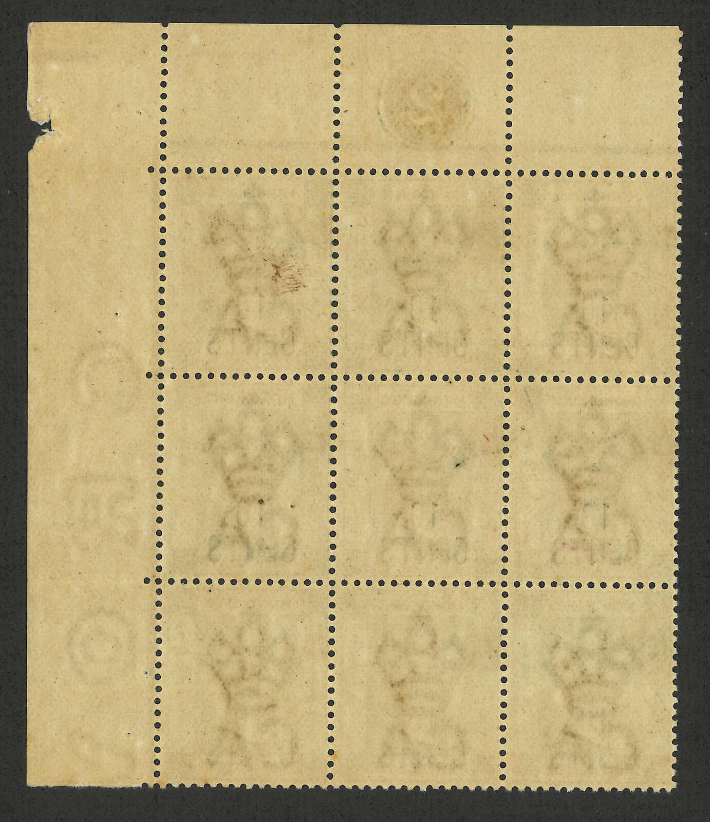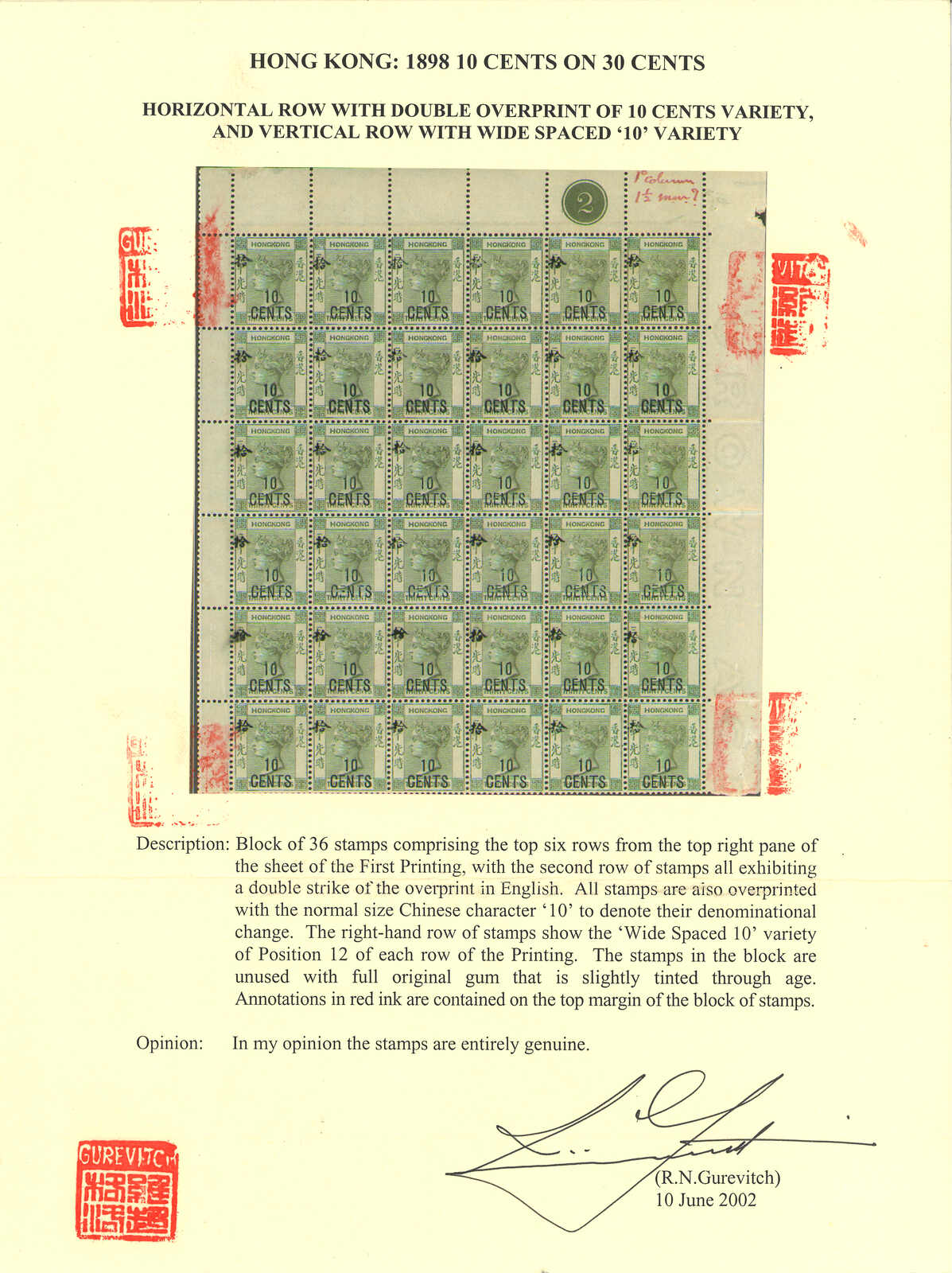 1898年香港維多利亞女皇像第八組加蓋票10仙蓋30仙九方連新,帶右上直角邊及版號(楊目54),中間橫行帶加蓋複蓋變異,右直行帶有數字“10”較闊變異,故中右一枚集以上兩款變異於一身。原膠無貼。出類拔萃的變異方連。附有原來三十六方連之R N Gurevitch證書。Alfred Chu舊藏。其原來之三十六方連曾為香港郵票中,帶有加蓋複蓋變異之最大方連。Alfred Chu於1998年憑此方連榮獲Wilde Cup。(Image 1) (Image 2) (Image 3)