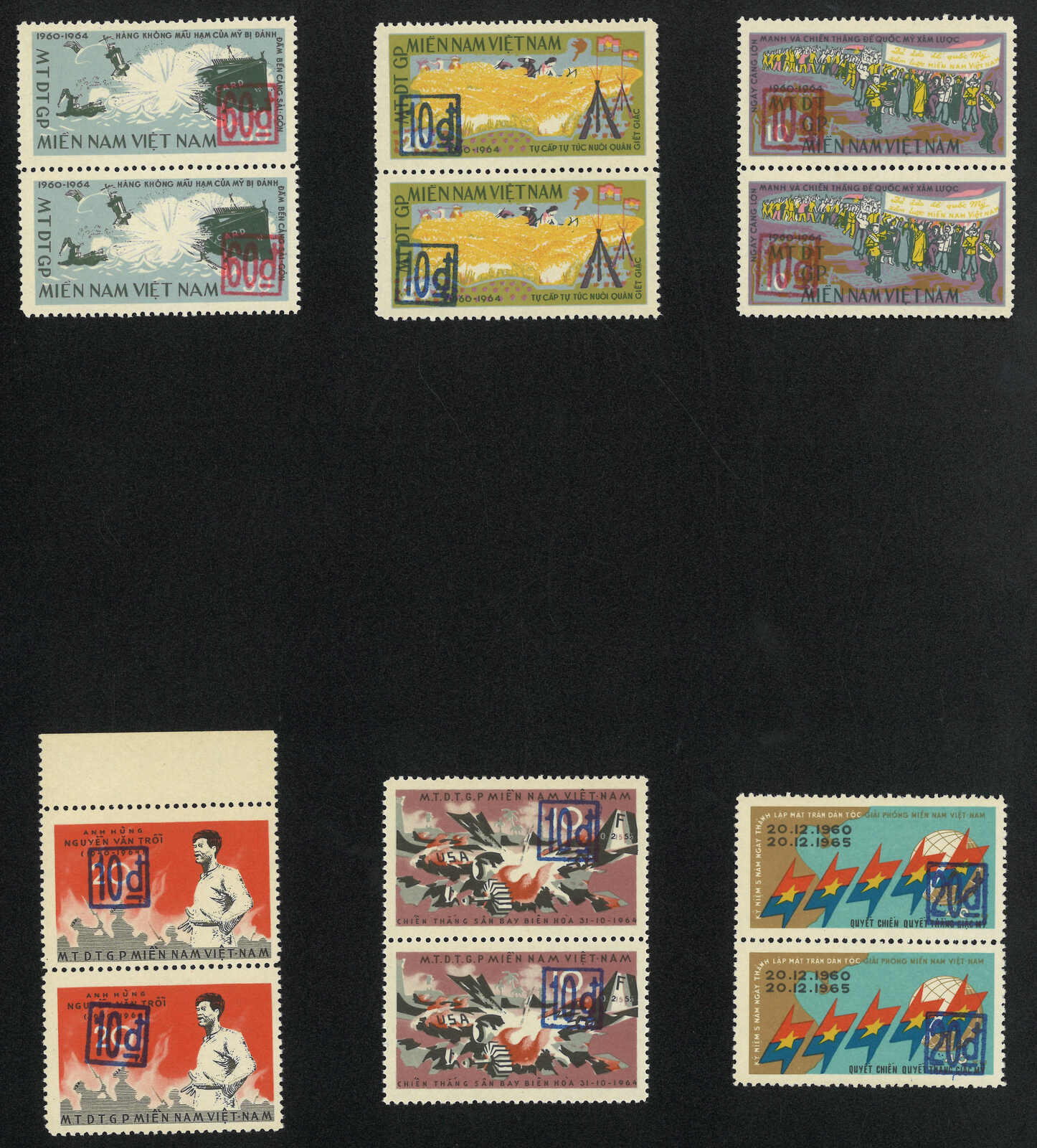 445 ** image1976 a group of 3 sets of Vietcong stamps surch South Vietnam currency, including 4th Anniv of National Liberation Front, 1st Anniv of Death of Nguyen Van Troi and 5th Anniv of National Liberation Front. All MNH in vertical pair.