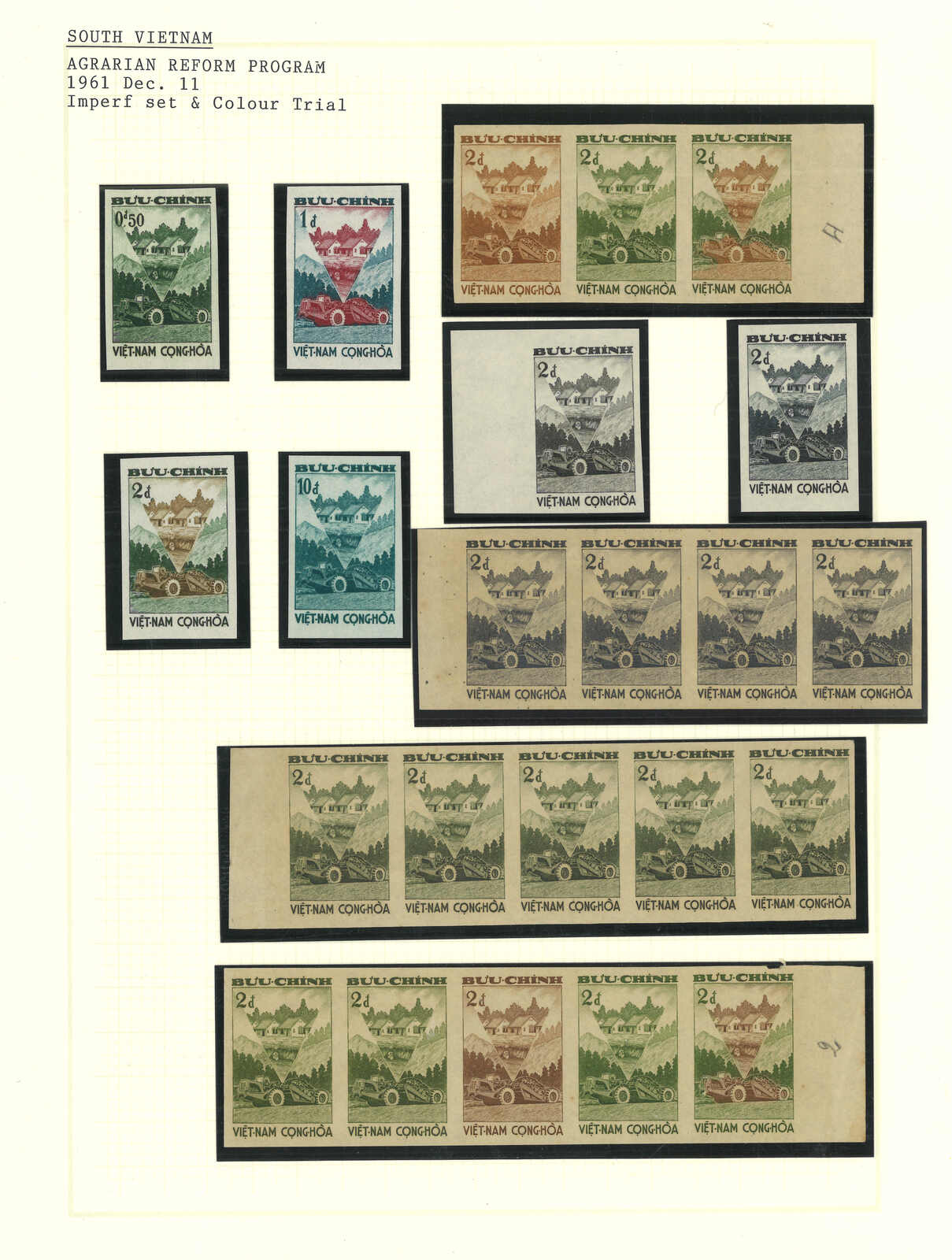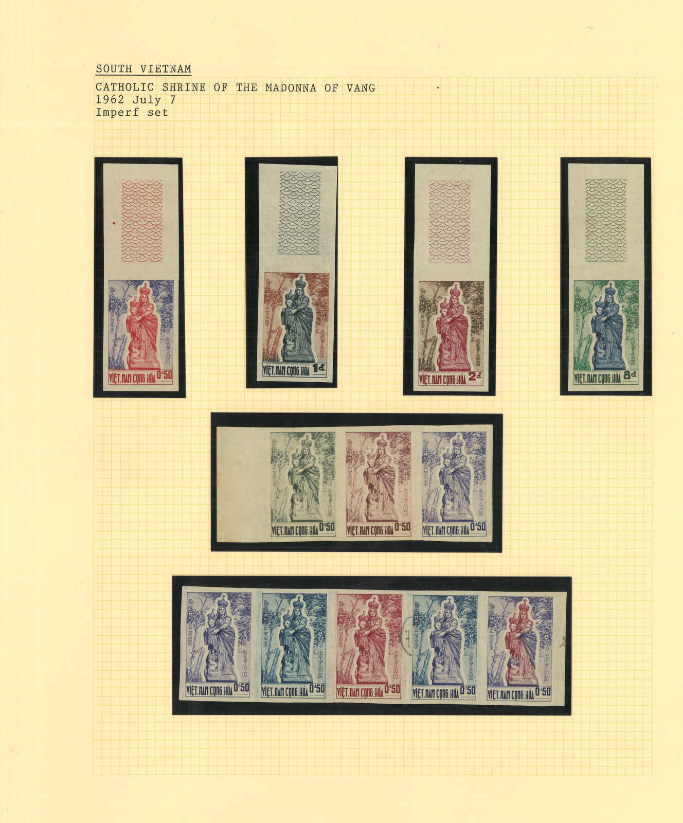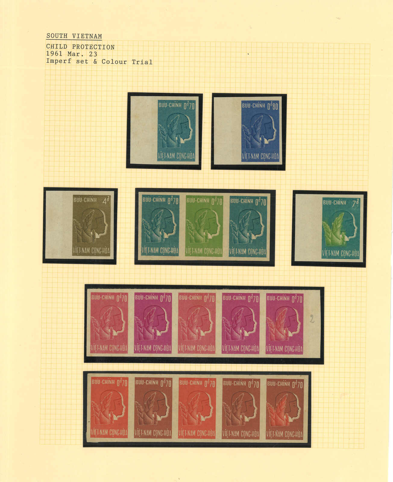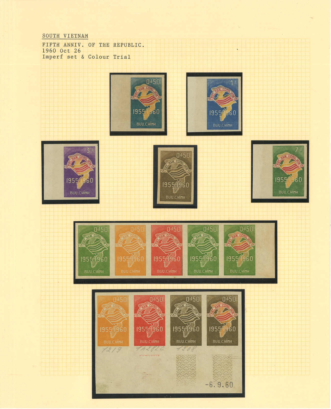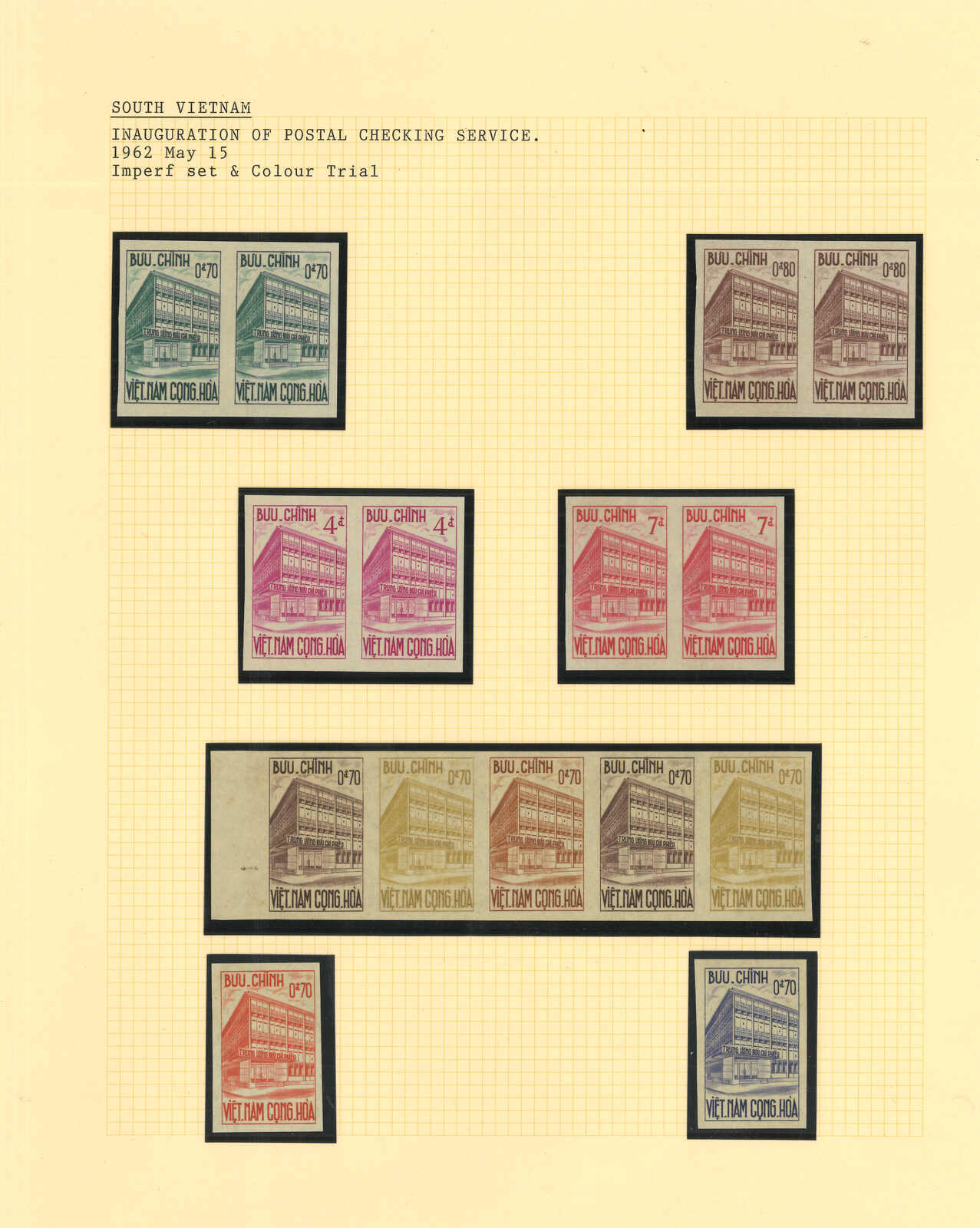 443 image1960s a collection of 10 sets of South Vietnam deluxe die proof or imperf issue, including Malaria Eradication, Inauguration of Postal Cheques Service, Catholic Shrine St Mary of La Vang, Strategoc Villages, Women’s Day etc. All MNH. Very Fine.