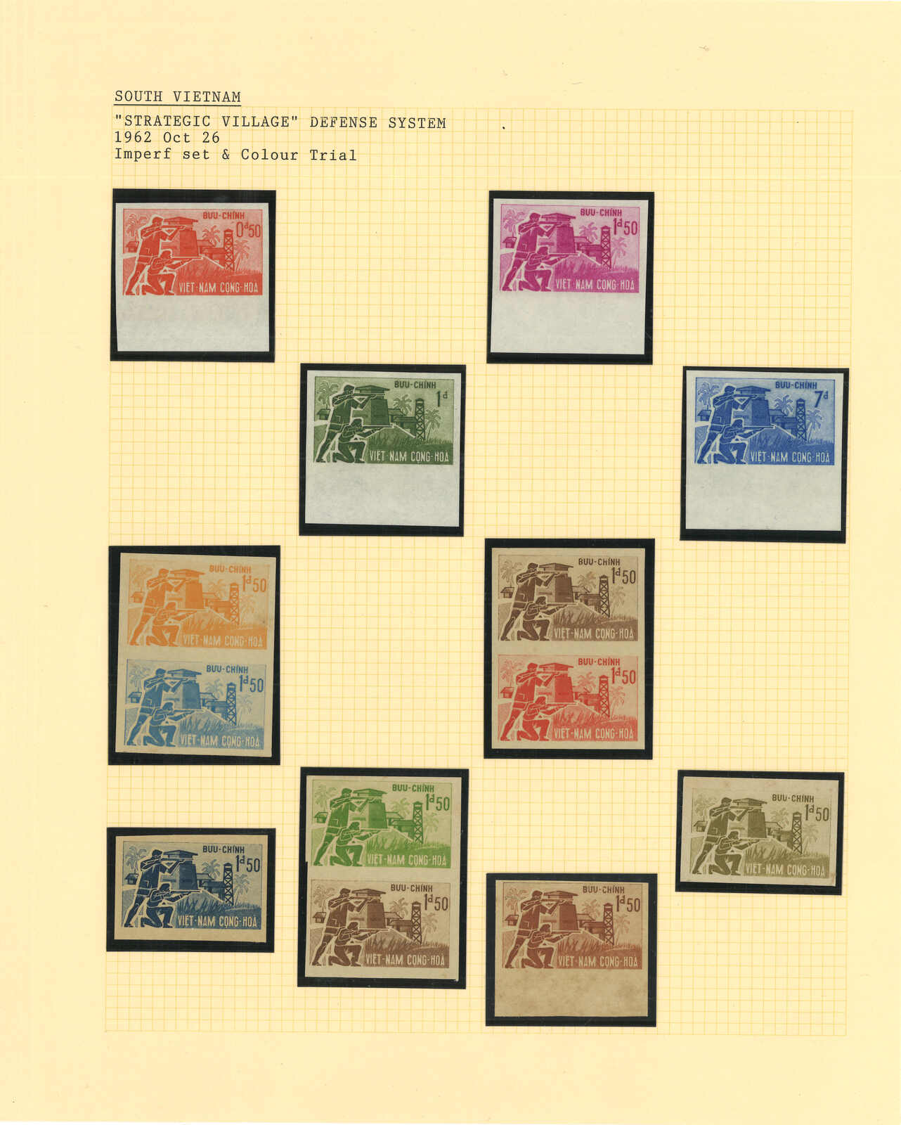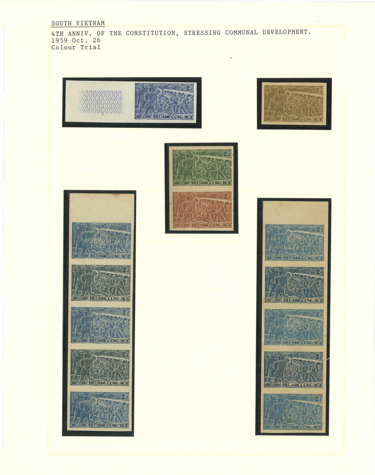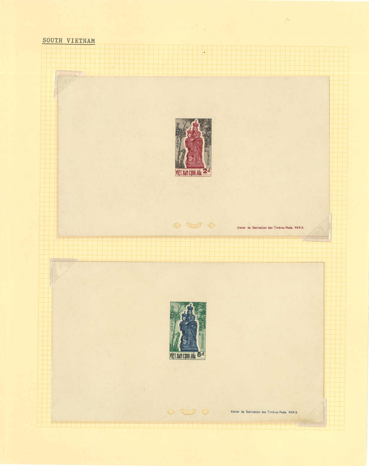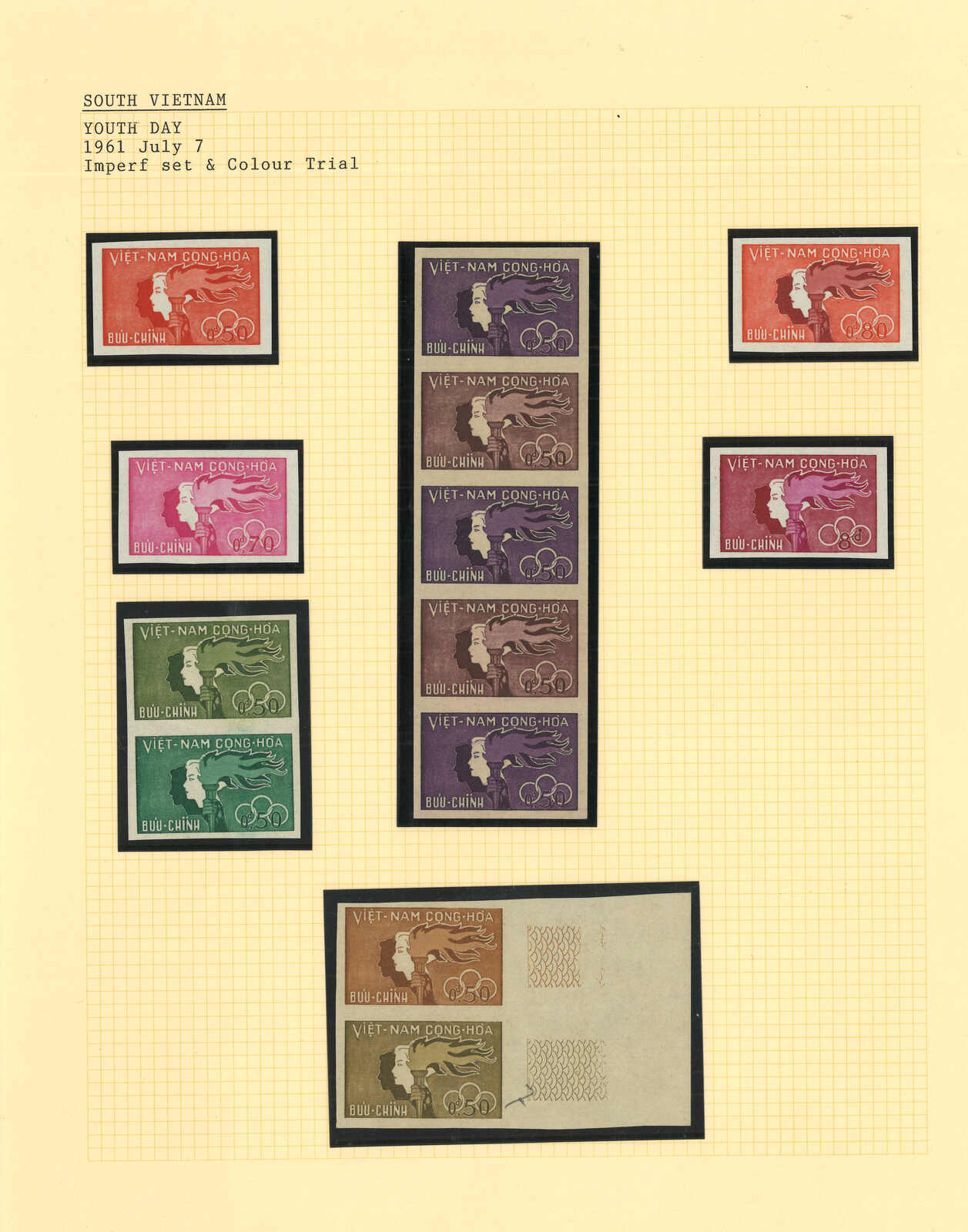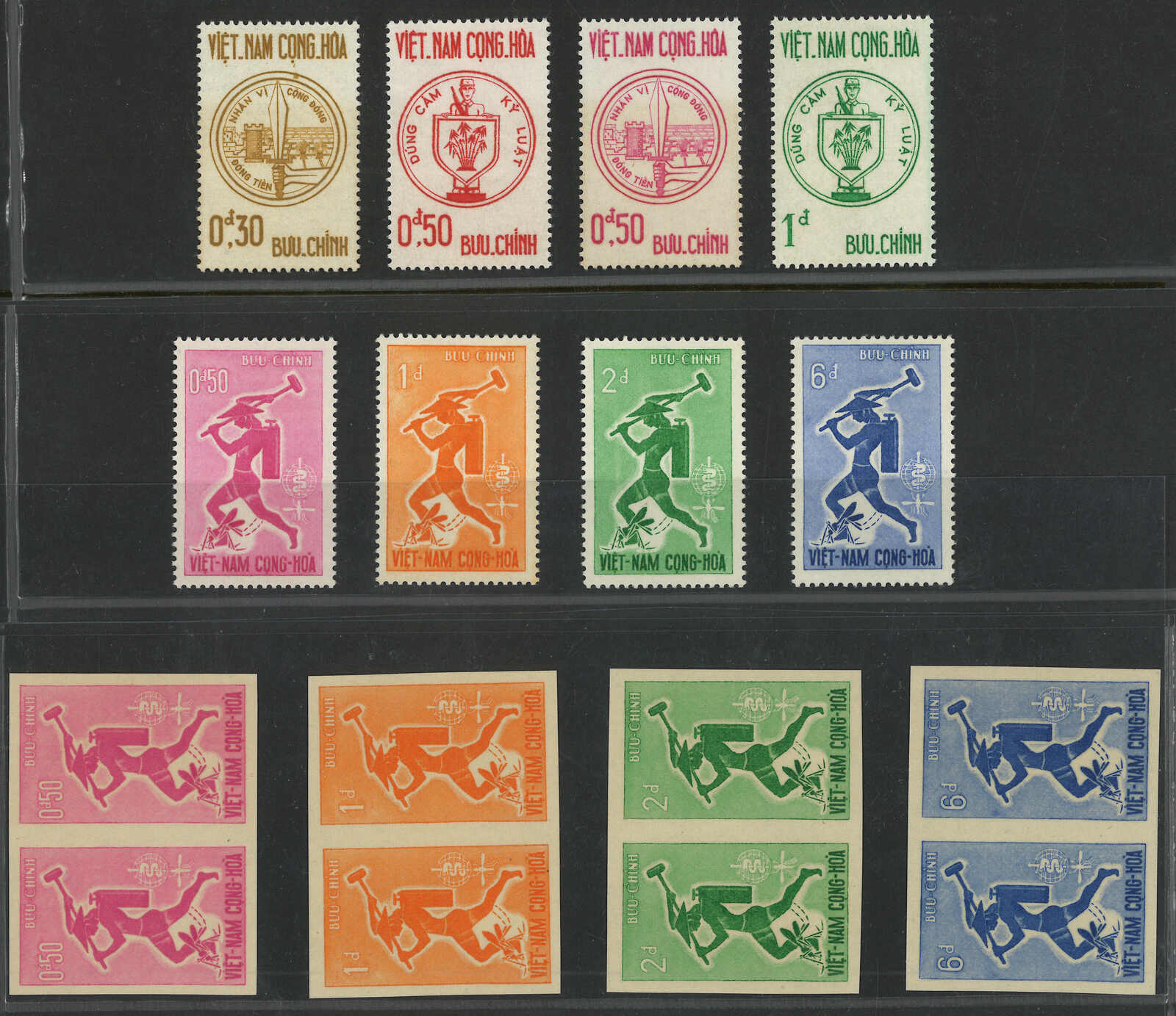 443 image1960s a collection of 10 sets of South Vietnam deluxe die proof or imperf issue, including Malaria Eradication, Inauguration of Postal Cheques Service, Catholic Shrine St Mary of La Vang, Strategoc Villages, Women’s Day etc. All MNH. Very Fine.