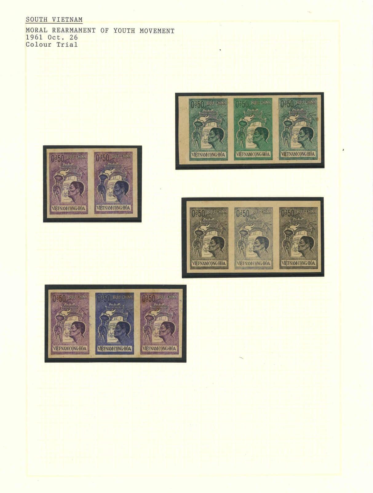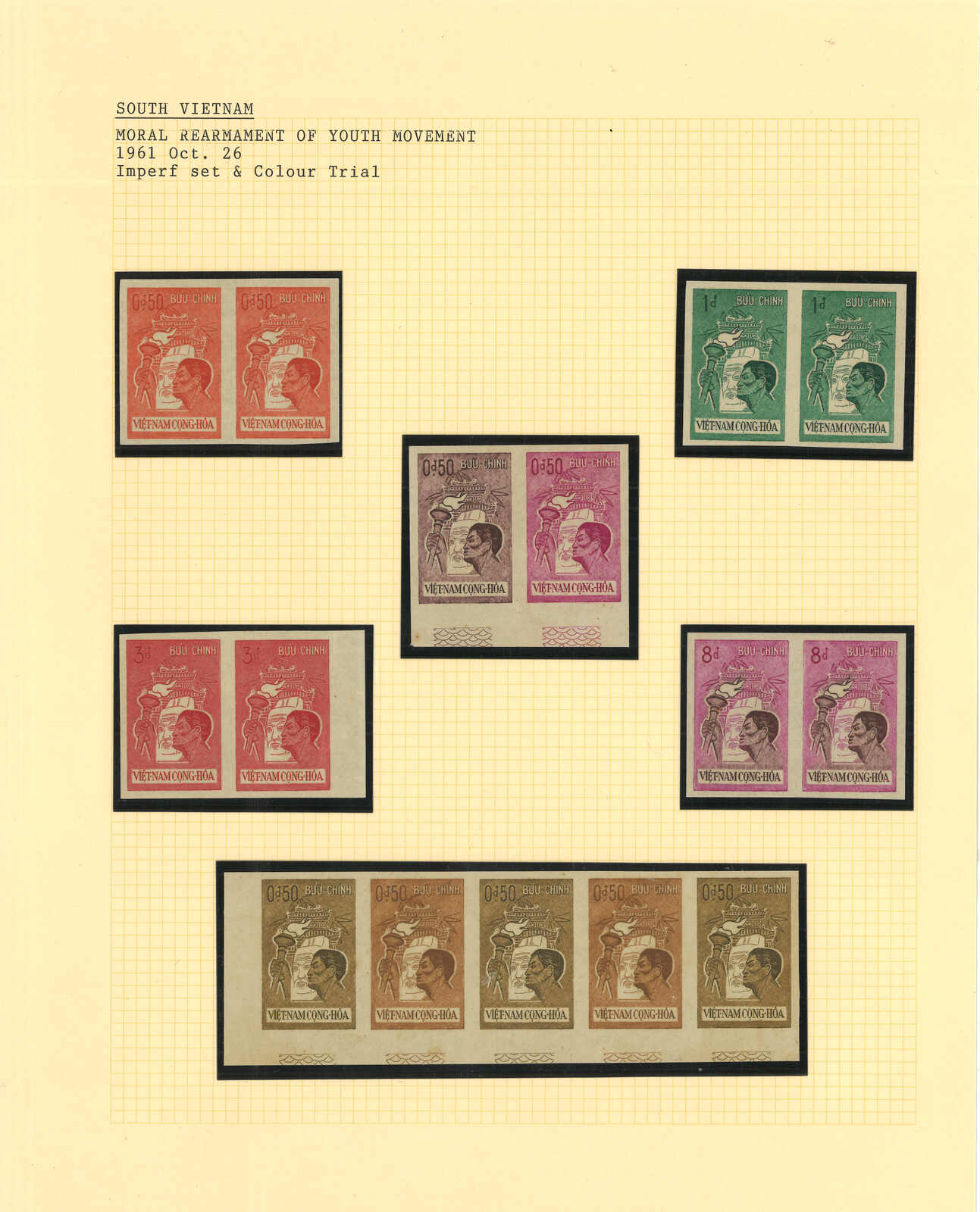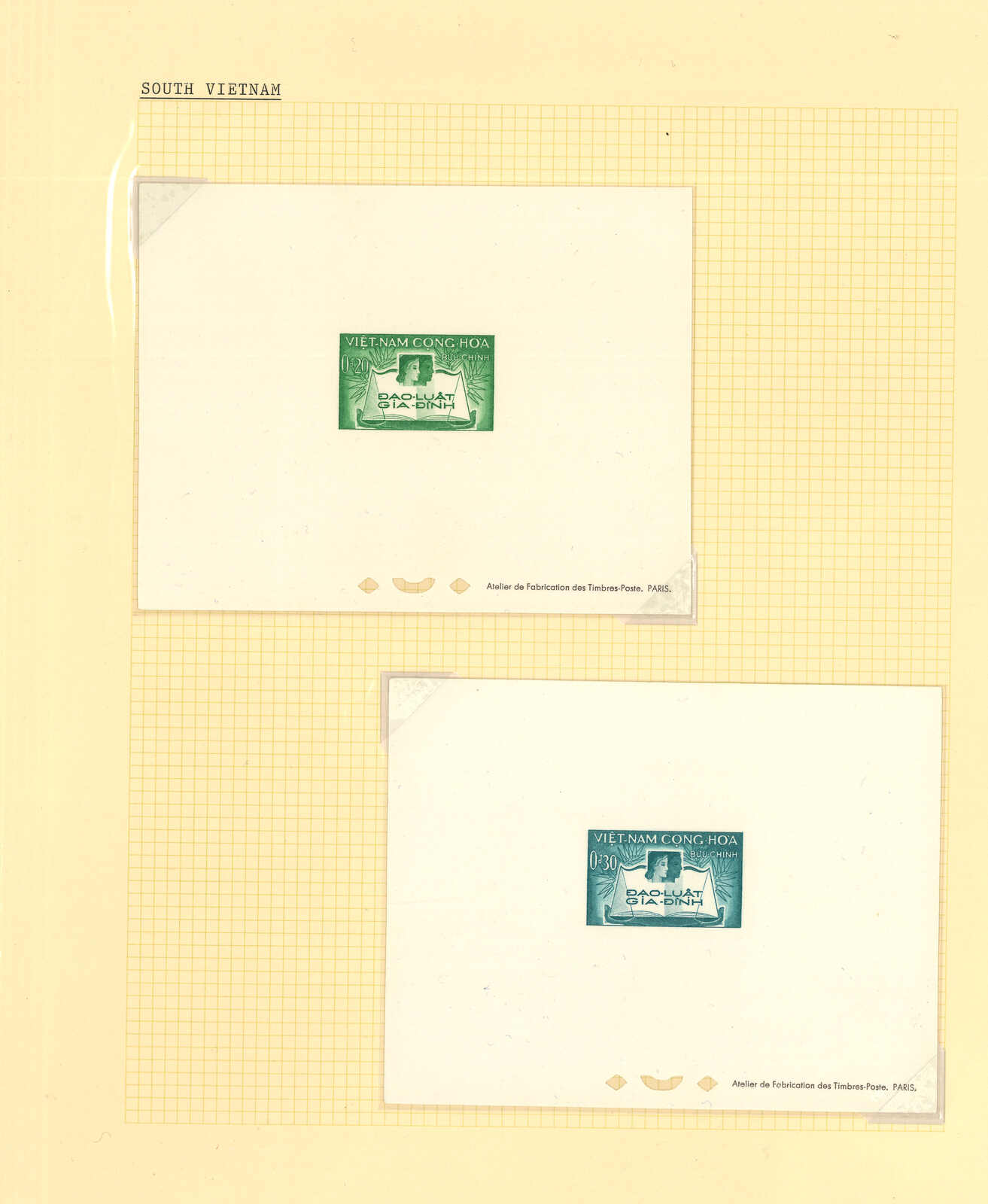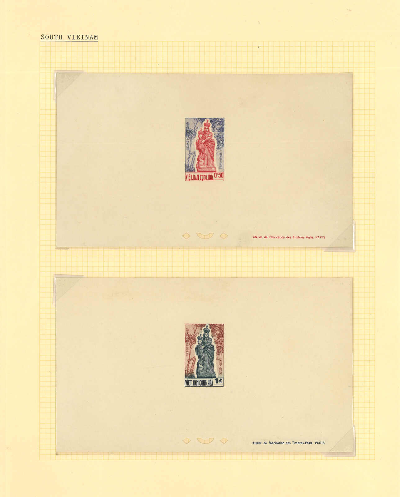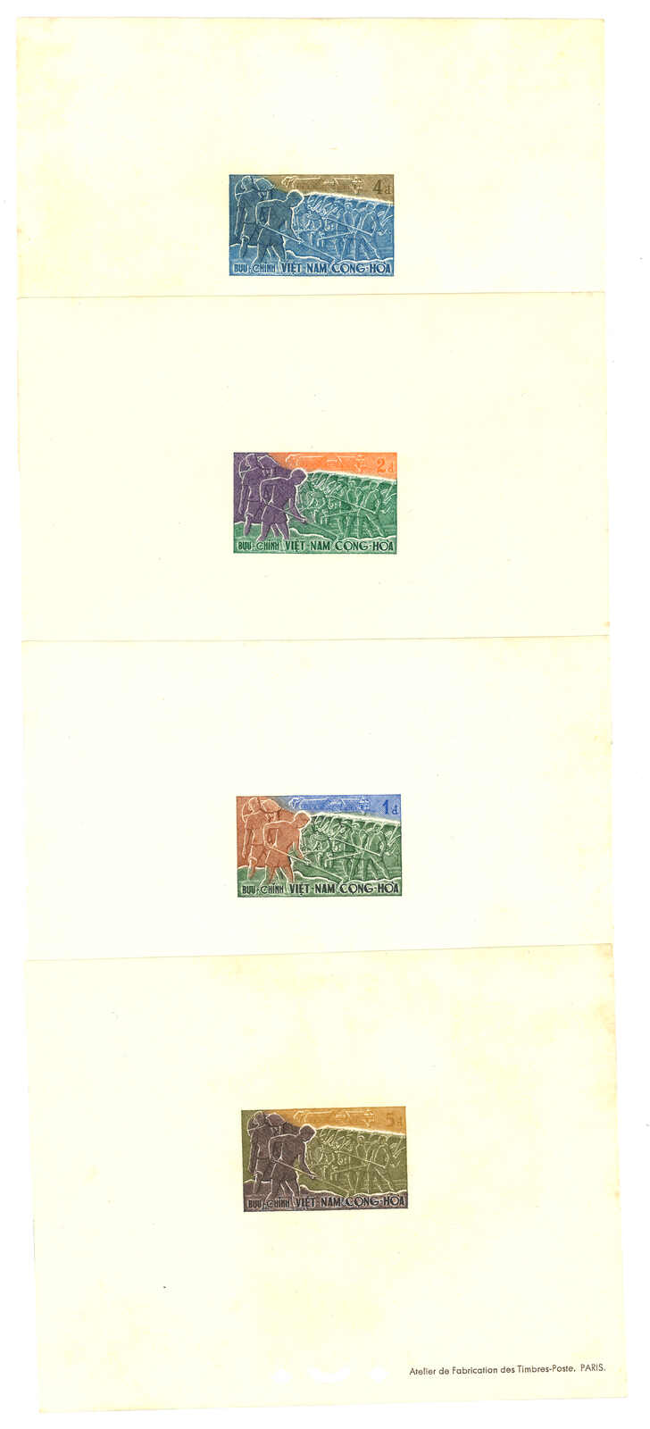 443 image1960s a collection of 10 sets of South Vietnam deluxe die proof or imperf issue, including Malaria Eradication, Inauguration of Postal Cheques Service, Catholic Shrine St Mary of La Vang, Strategoc Villages, Women’s Day etc. All MNH. Very Fine.
