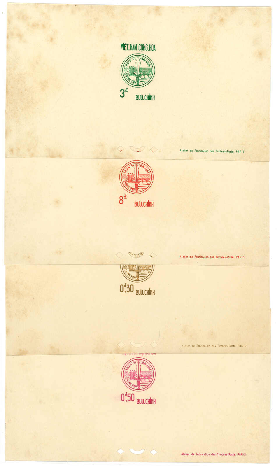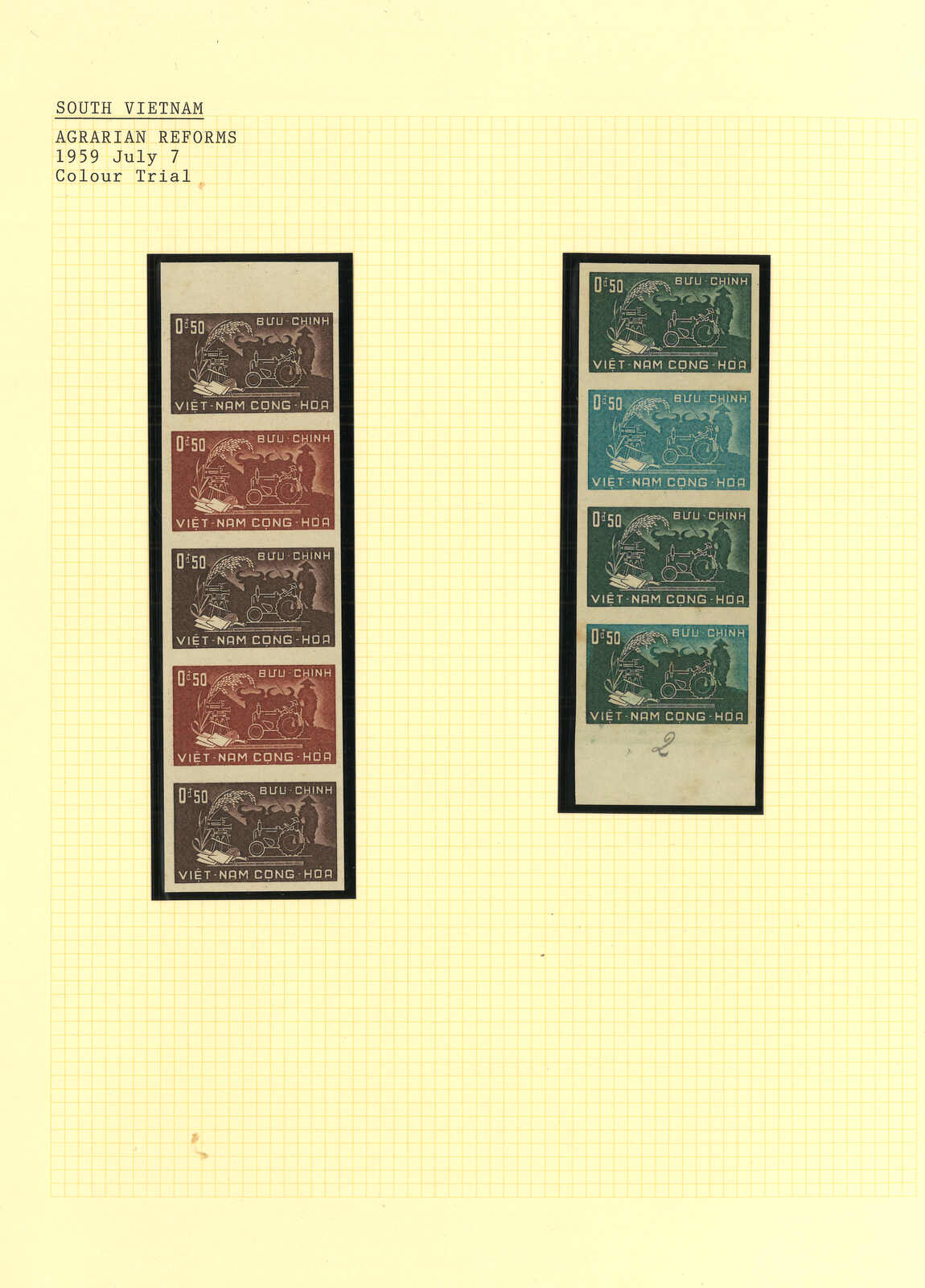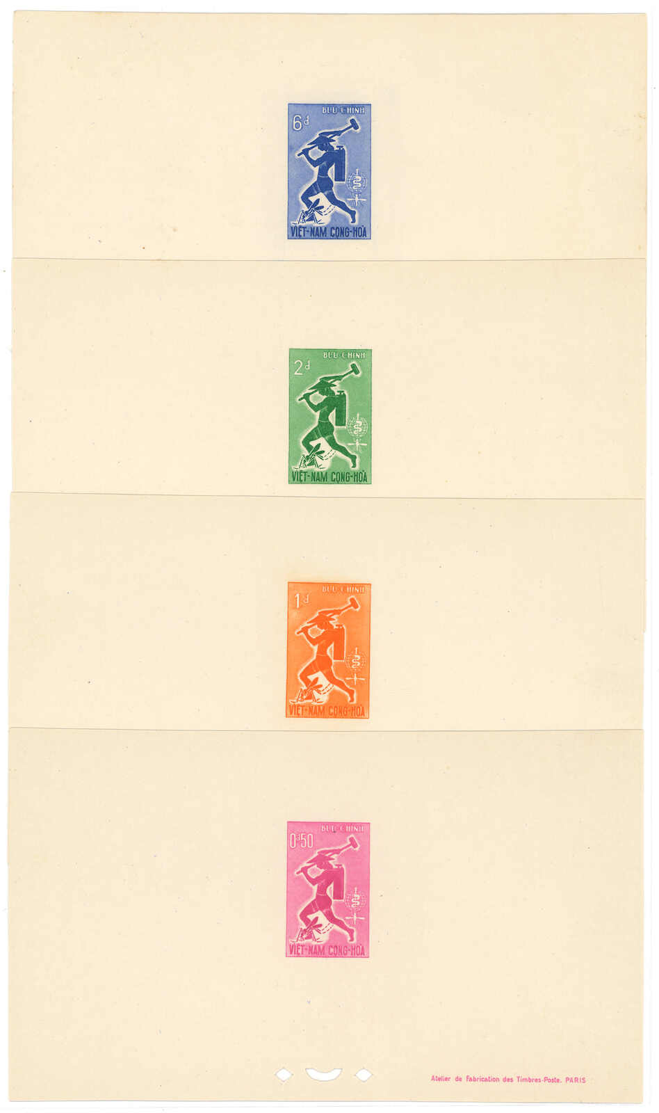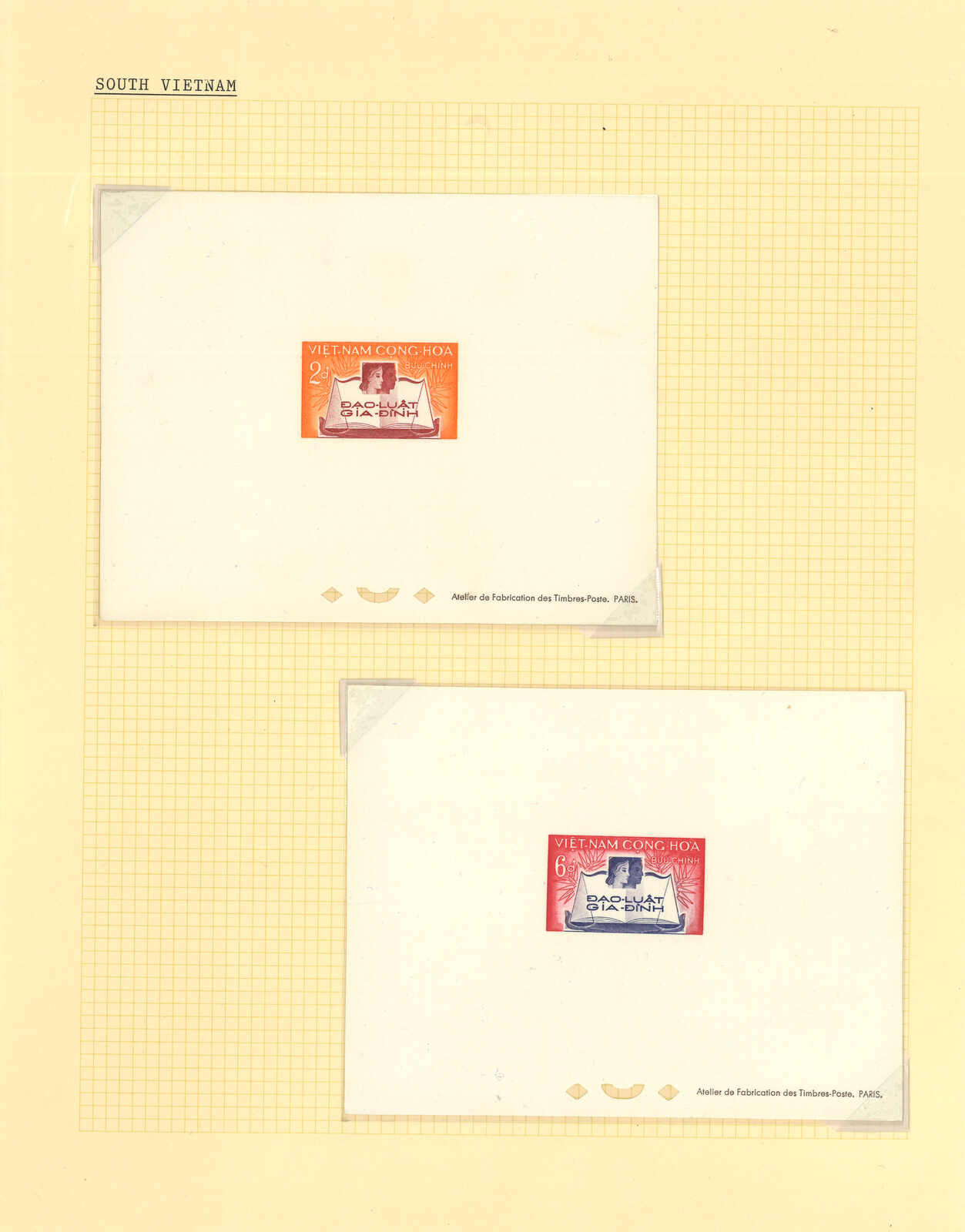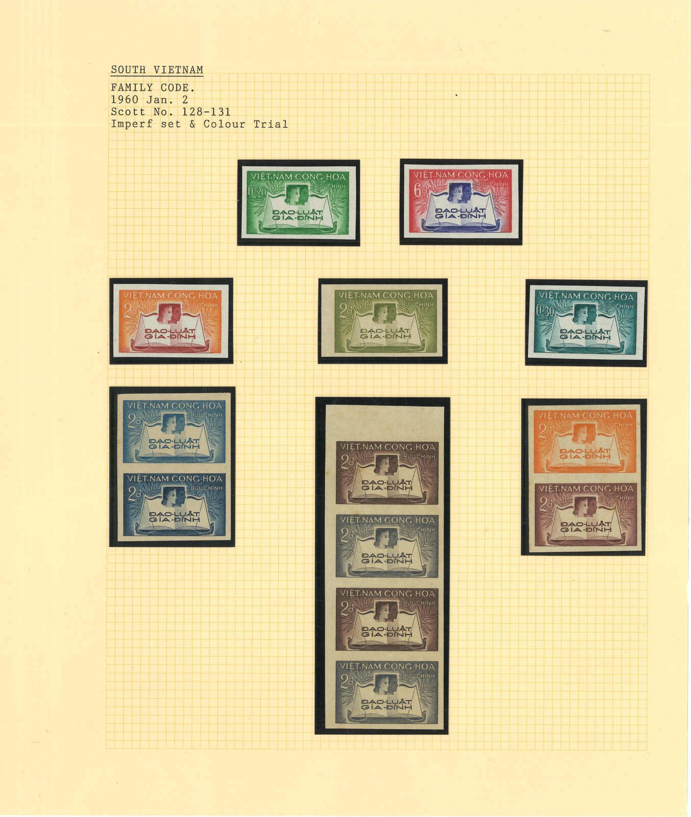 443 image1960s a collection of 10 sets of South Vietnam deluxe die proof or imperf issue, including Malaria Eradication, Inauguration of Postal Cheques Service, Catholic Shrine St Mary of La Vang, Strategoc Villages, Women’s Day etc. All MNH. Very Fine.