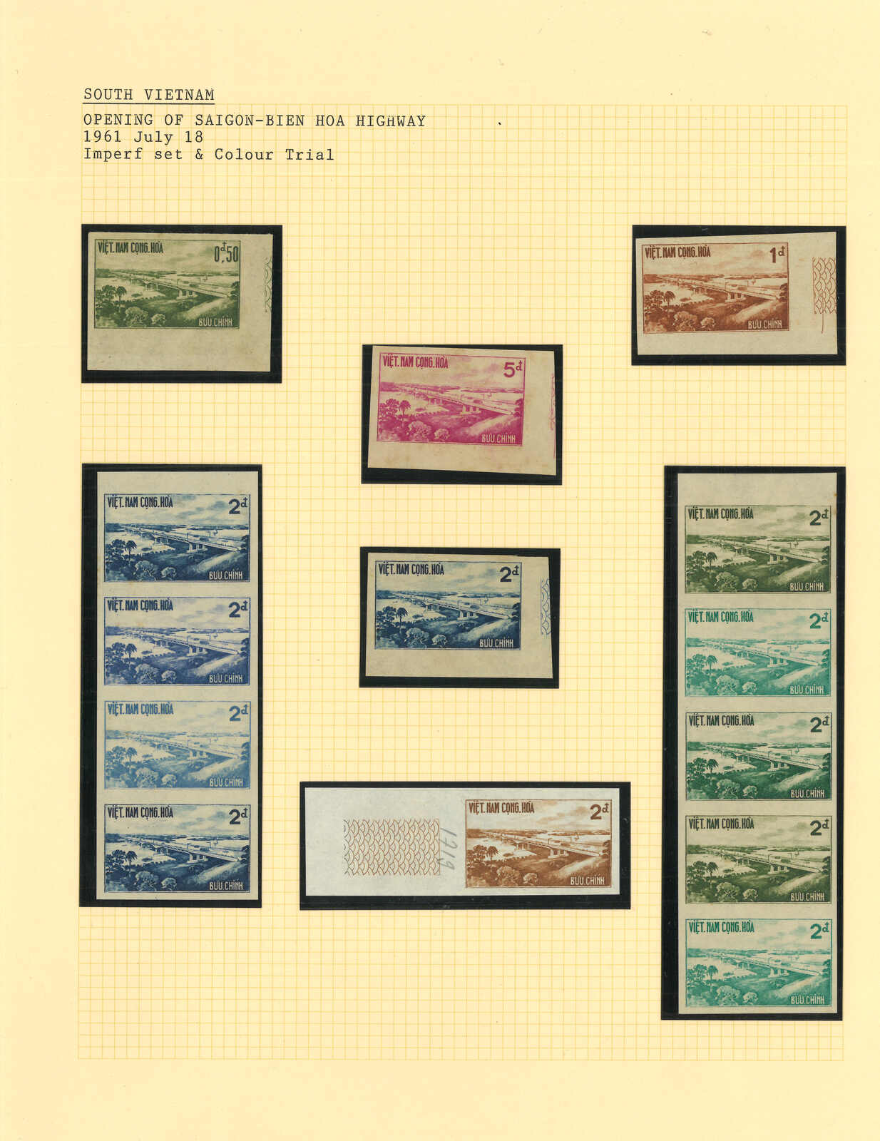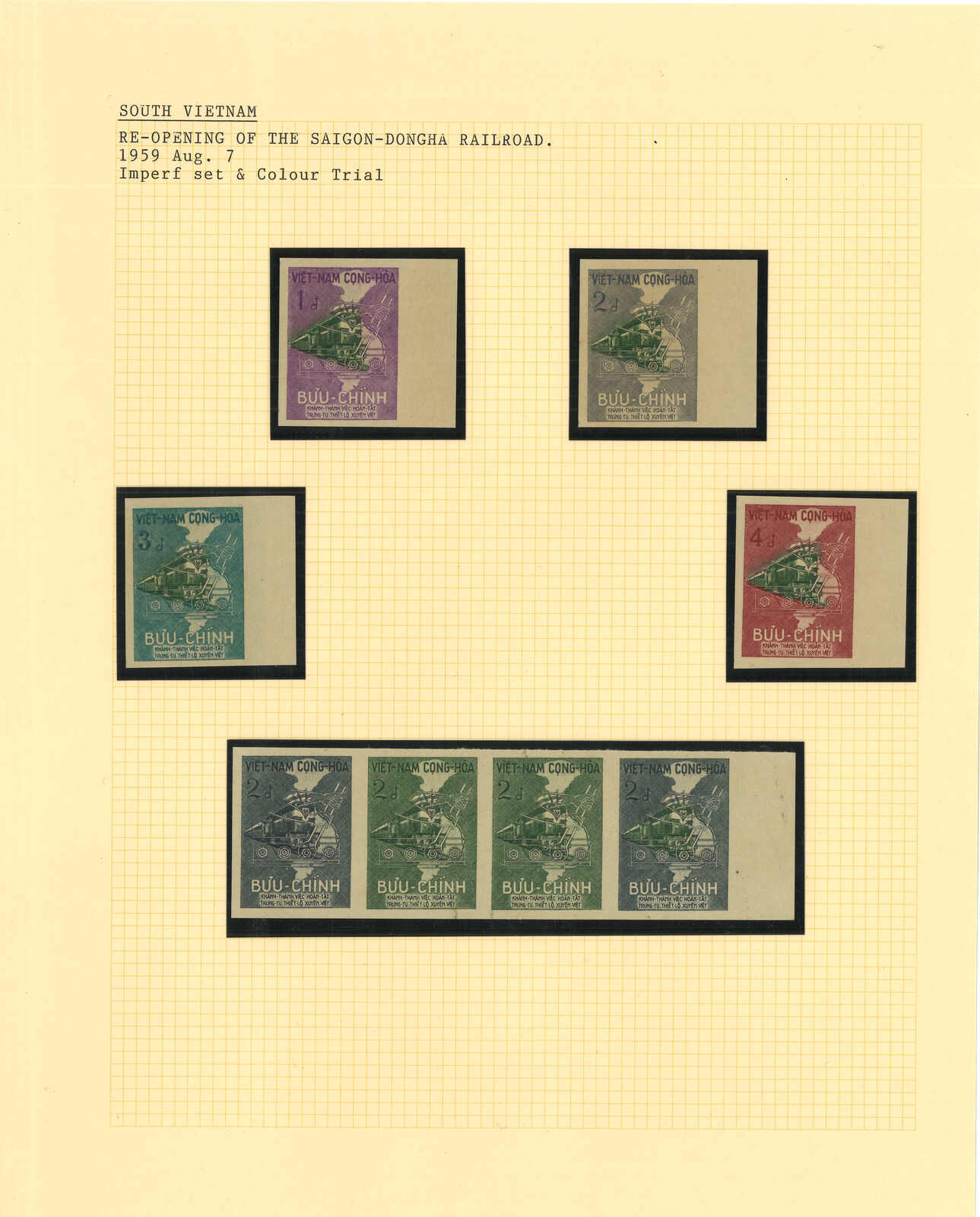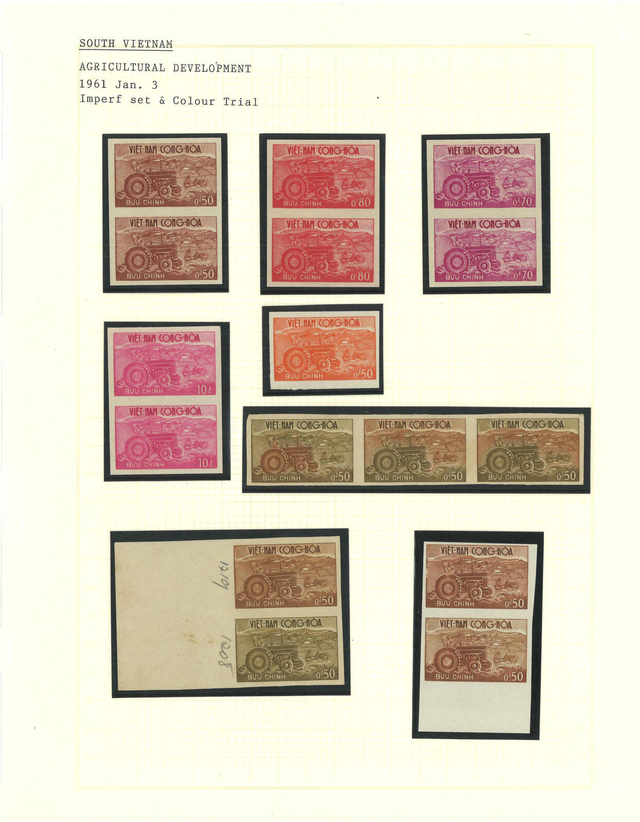 436 image1950-1960s a collection of 13 sets of South Vietnam deluxe die proof or imperf issue, including Agricultural Reform, Reopening of Trans Vietnam Railway, 4th Anniv of Republic, 1st National Scott Jamboree etc. All MNH. Very Fine.