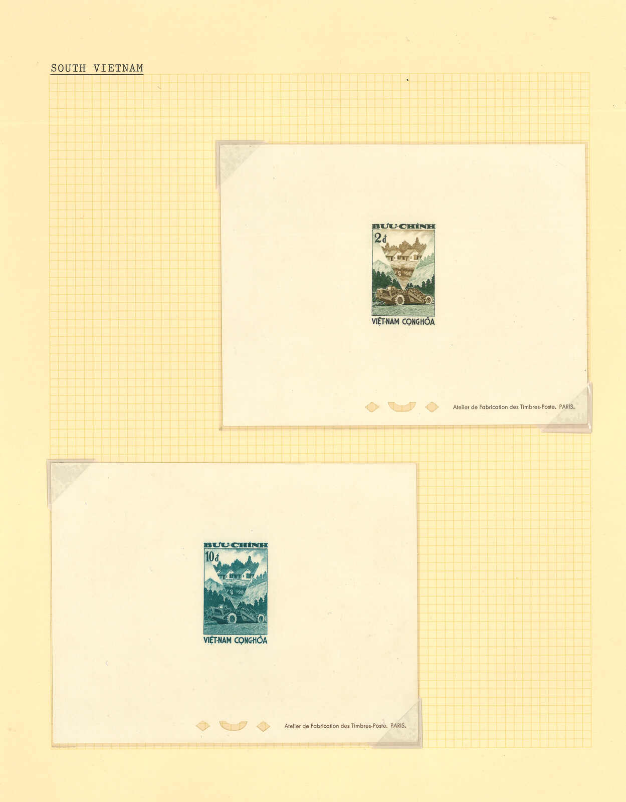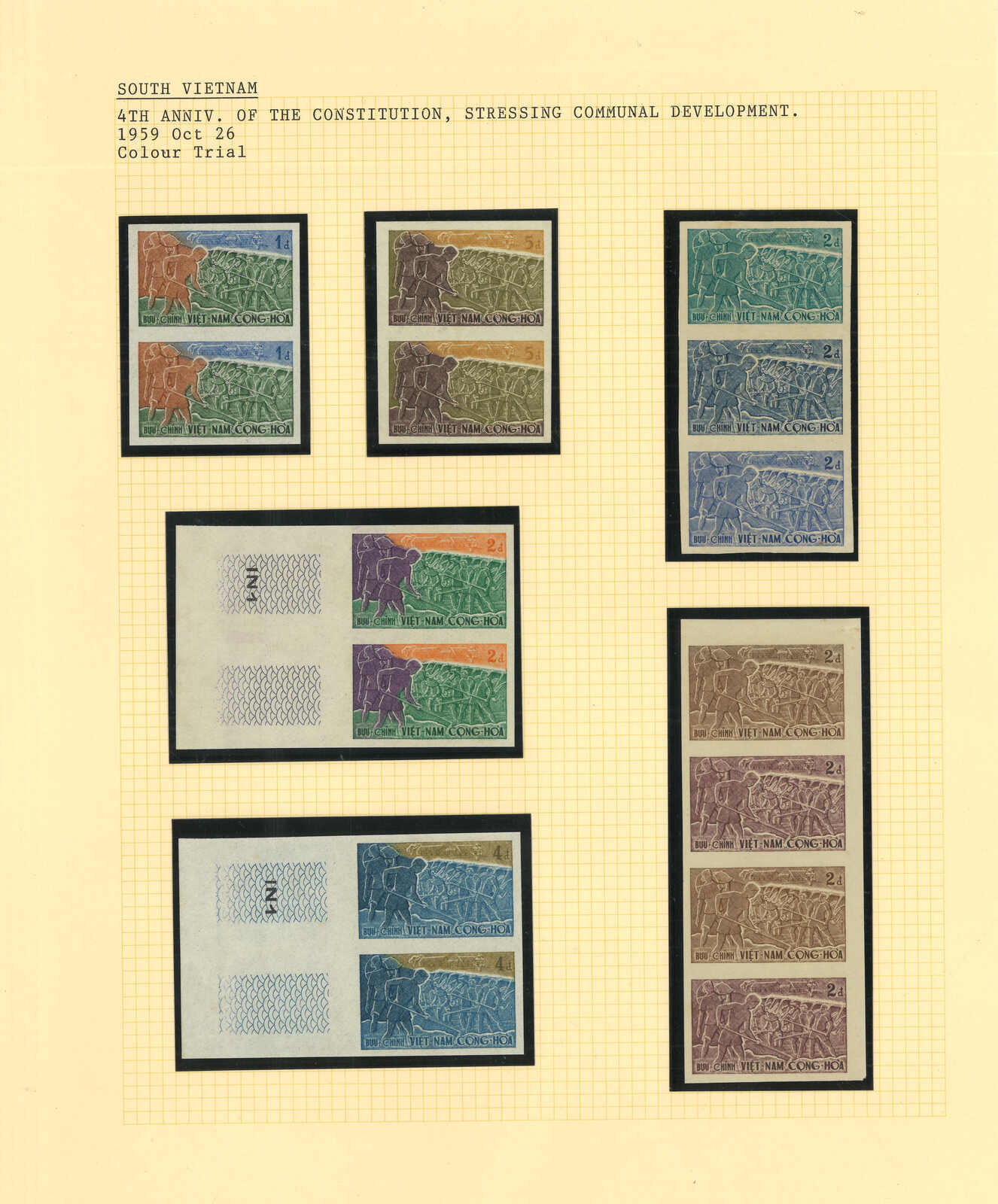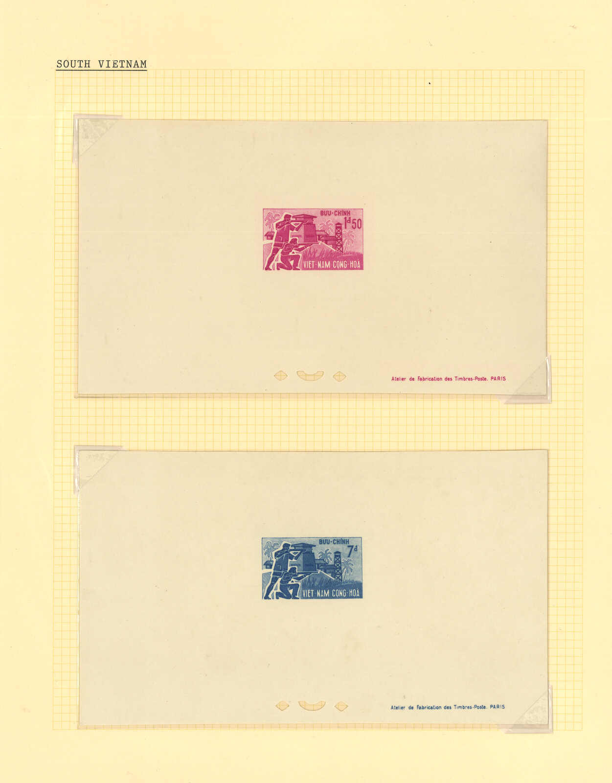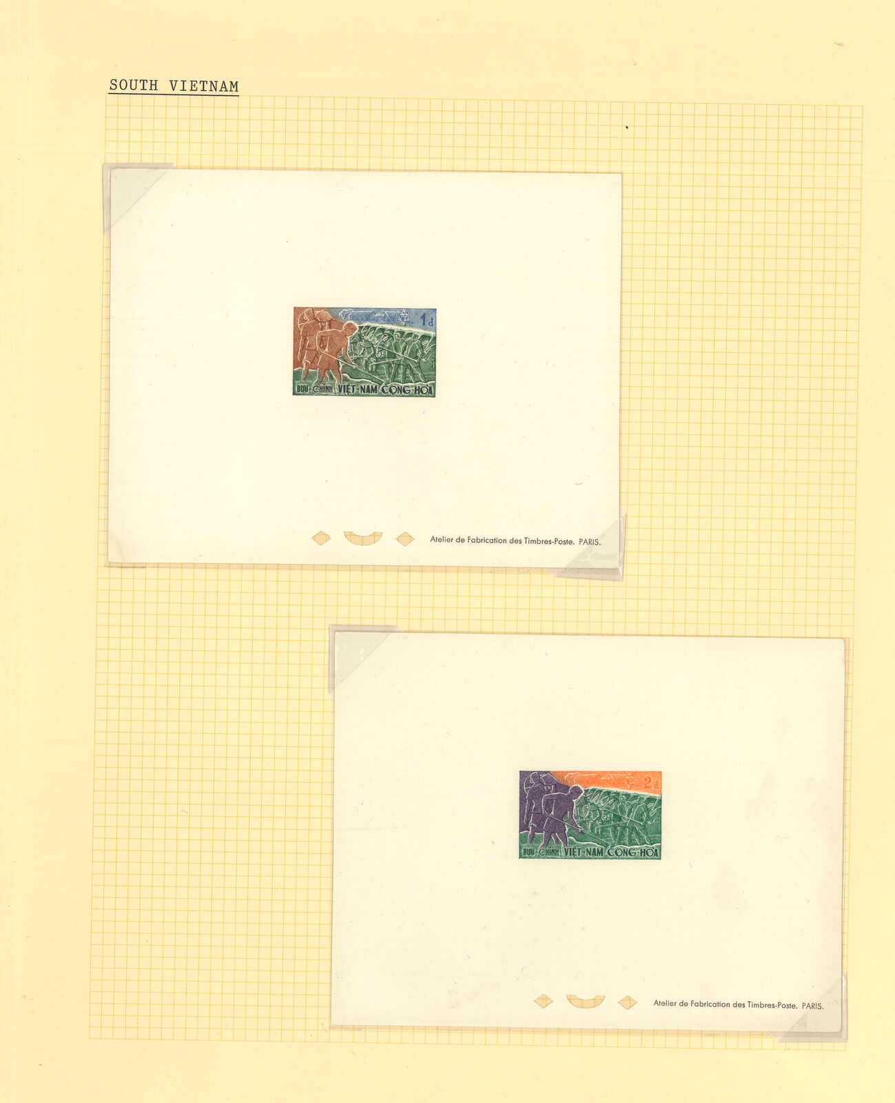 1960年代一組十套南越郵票之豪華試印張或無齒票,包括消除瘧疾、郵政支票服務開業、戰略村、婦女節等等。均無貼上品。(Image 1) (Image 2) (Image 3) (Image 4) (Image 5) (Image 6) (Image 7) (Image 8) (Image 9) (Image 10) (Image 11) (Image 12) (Image 13) (Image 14)