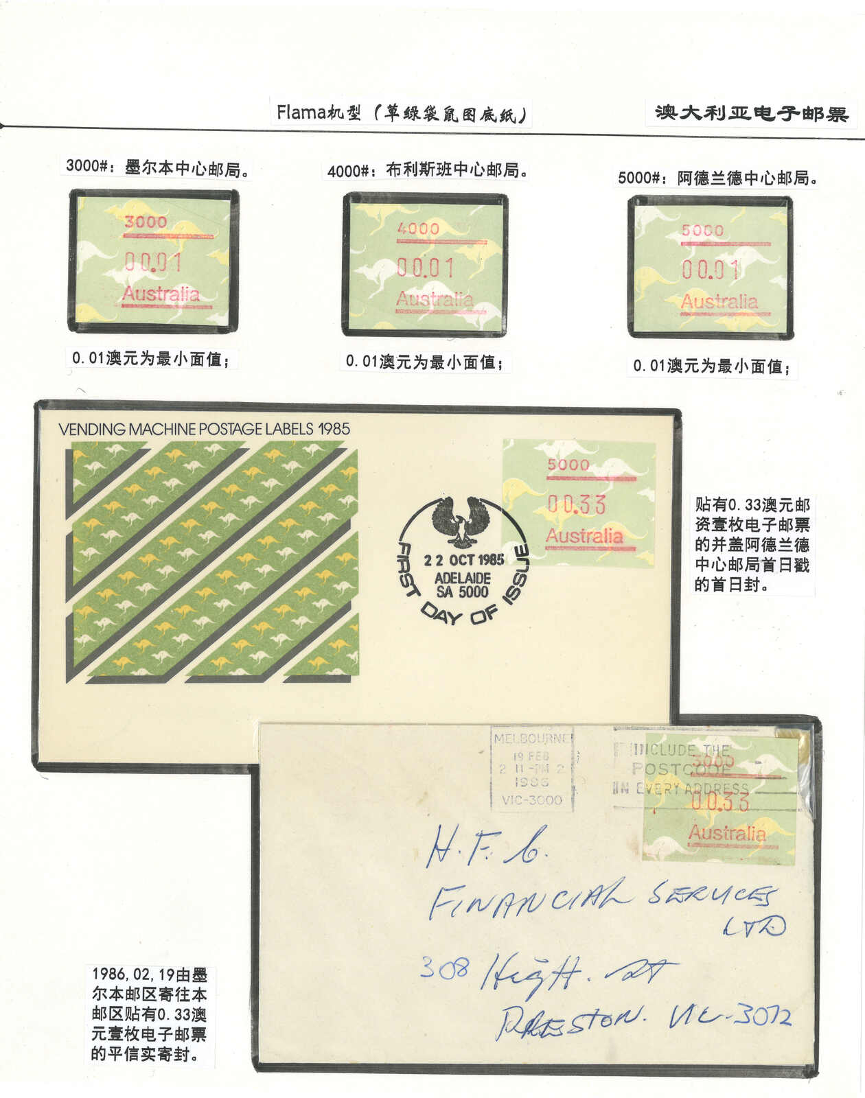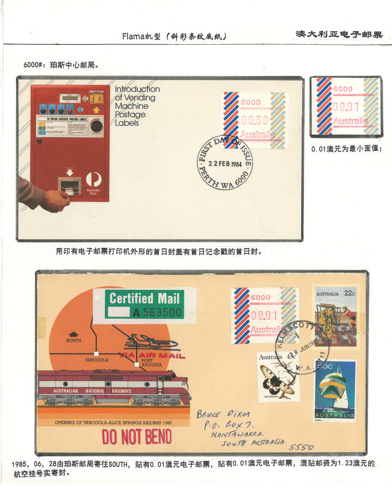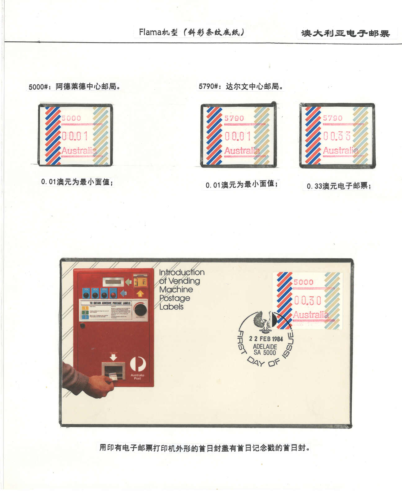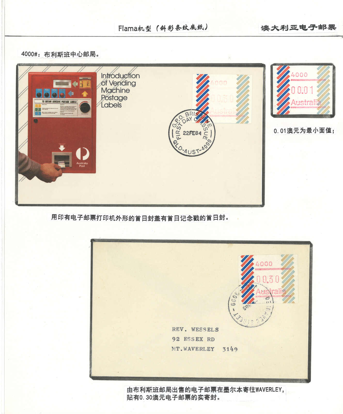 3552 **/cover image1984 Australia 1st ATM stamps and covers in 10 exhibit pages (16 stamps and 16 covers), showing mint stamps and FDC from Sydney, Brisbane, Canberra, Melbourne and other cities. A comprehensive and orderly arranged group.