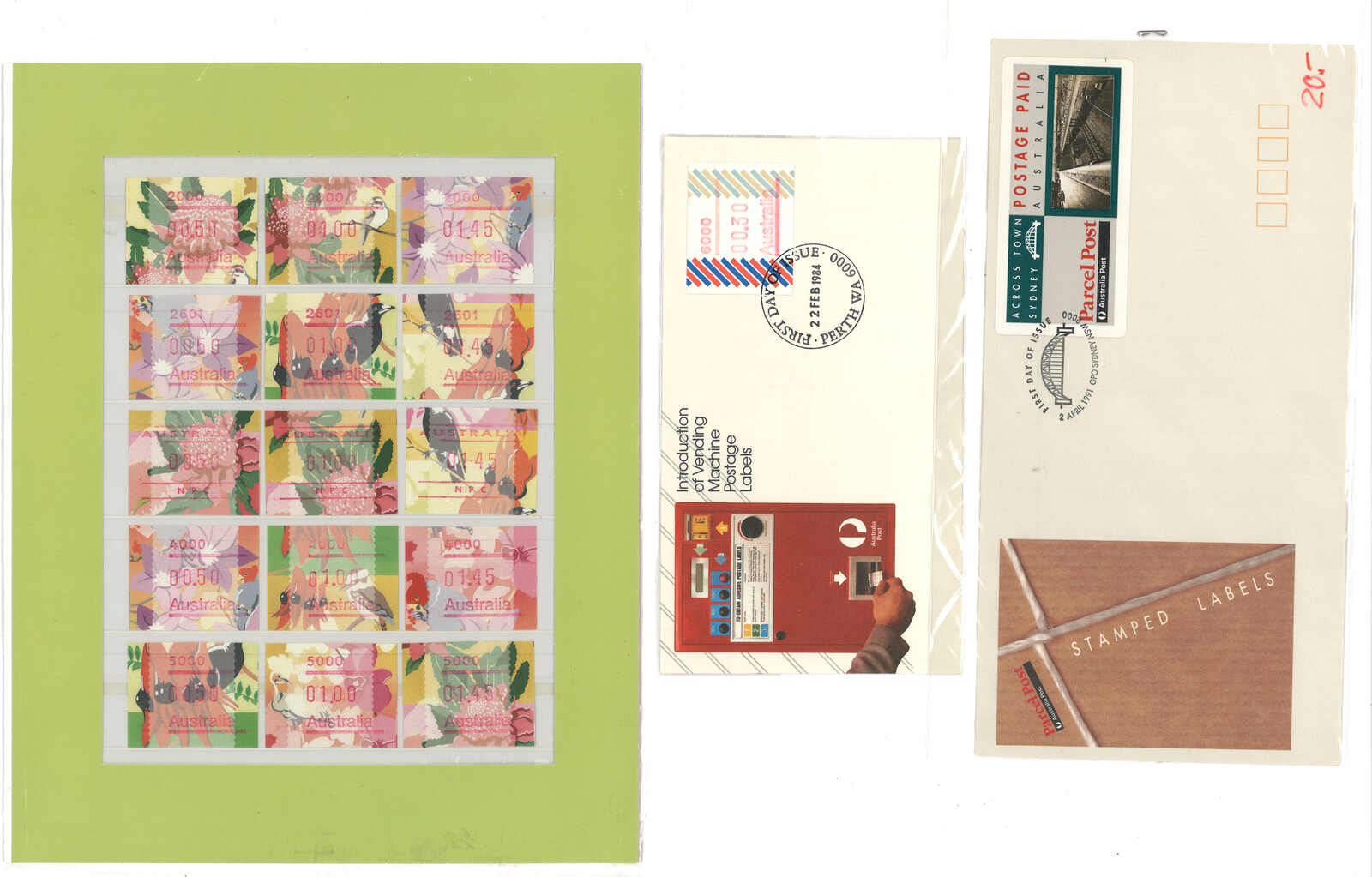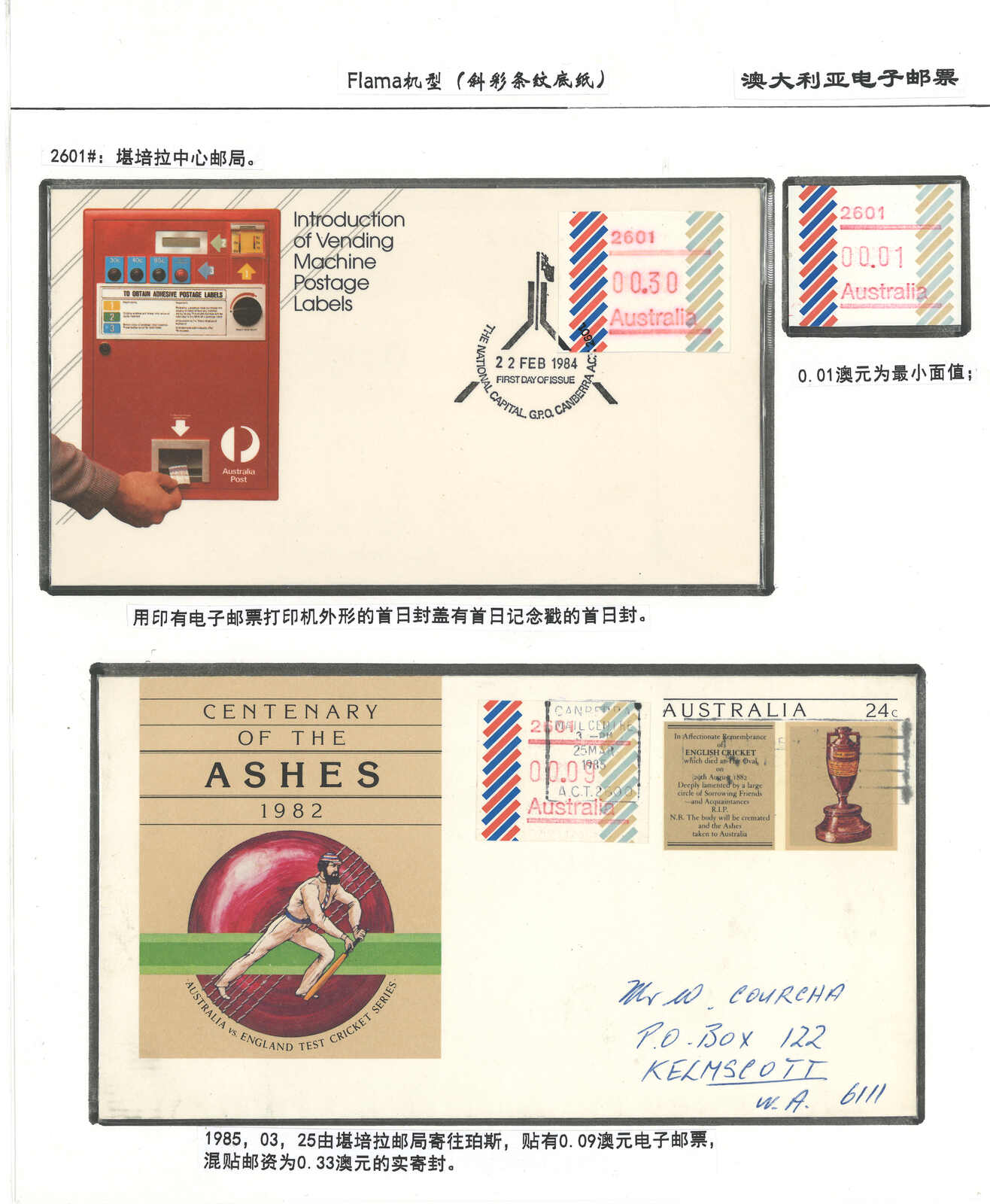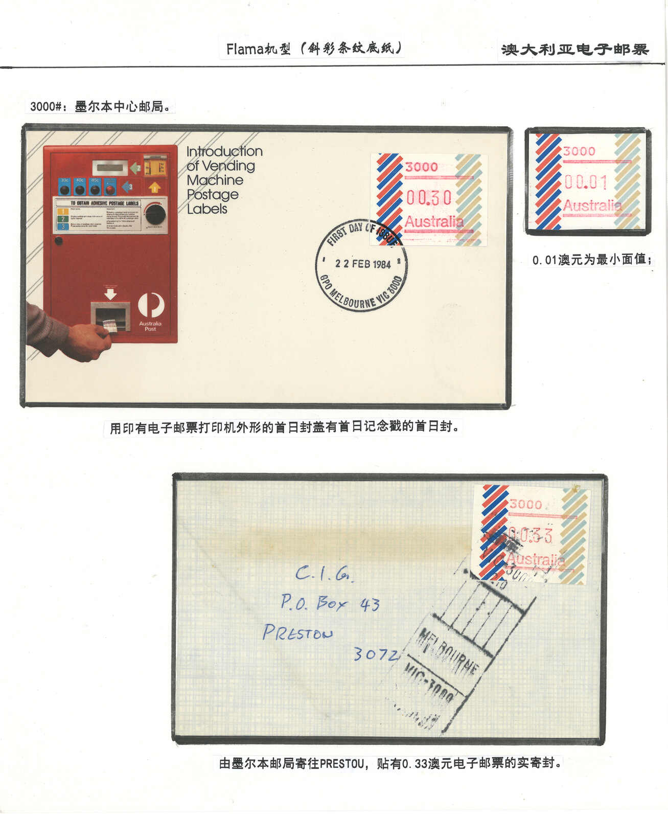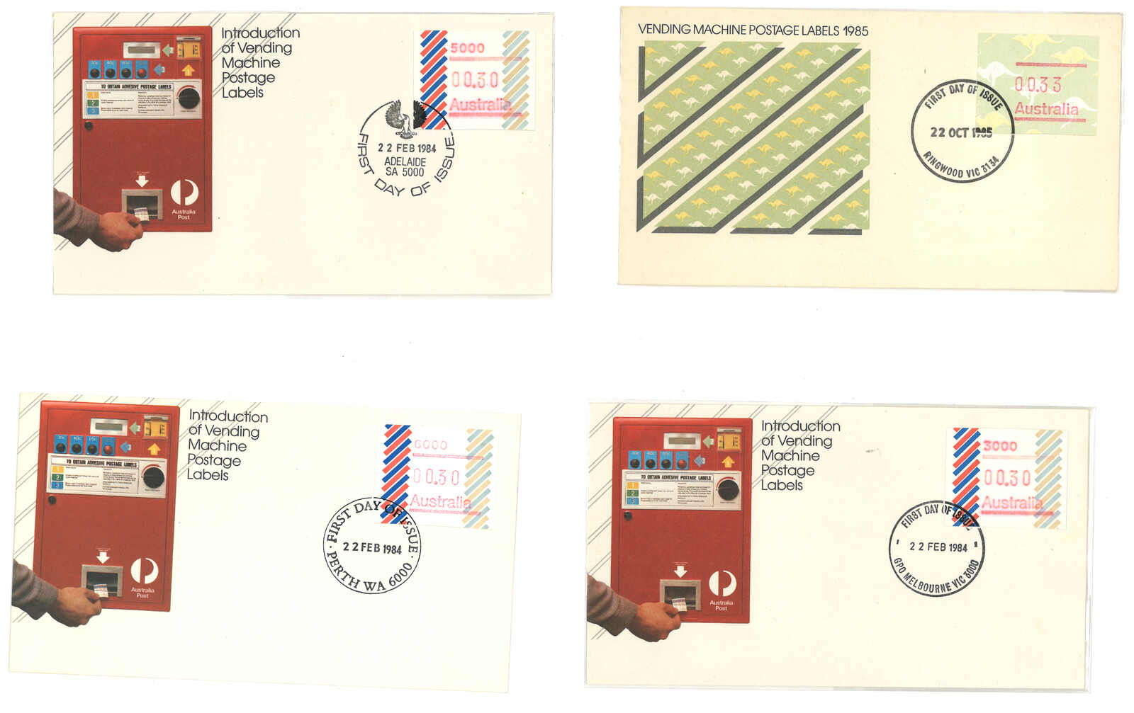 3552 **/cover image1984 Australia 1st ATM stamps and covers in 10 exhibit pages (16 stamps and 16 covers), showing mint stamps and FDC from Sydney, Brisbane, Canberra, Melbourne and other cities. A comprehensive and orderly arranged group.