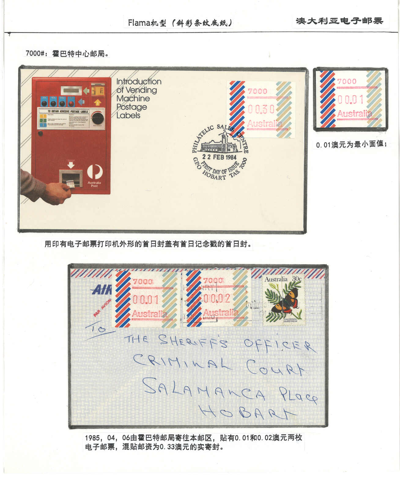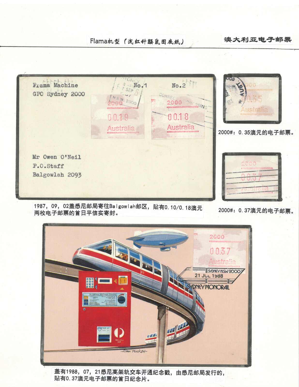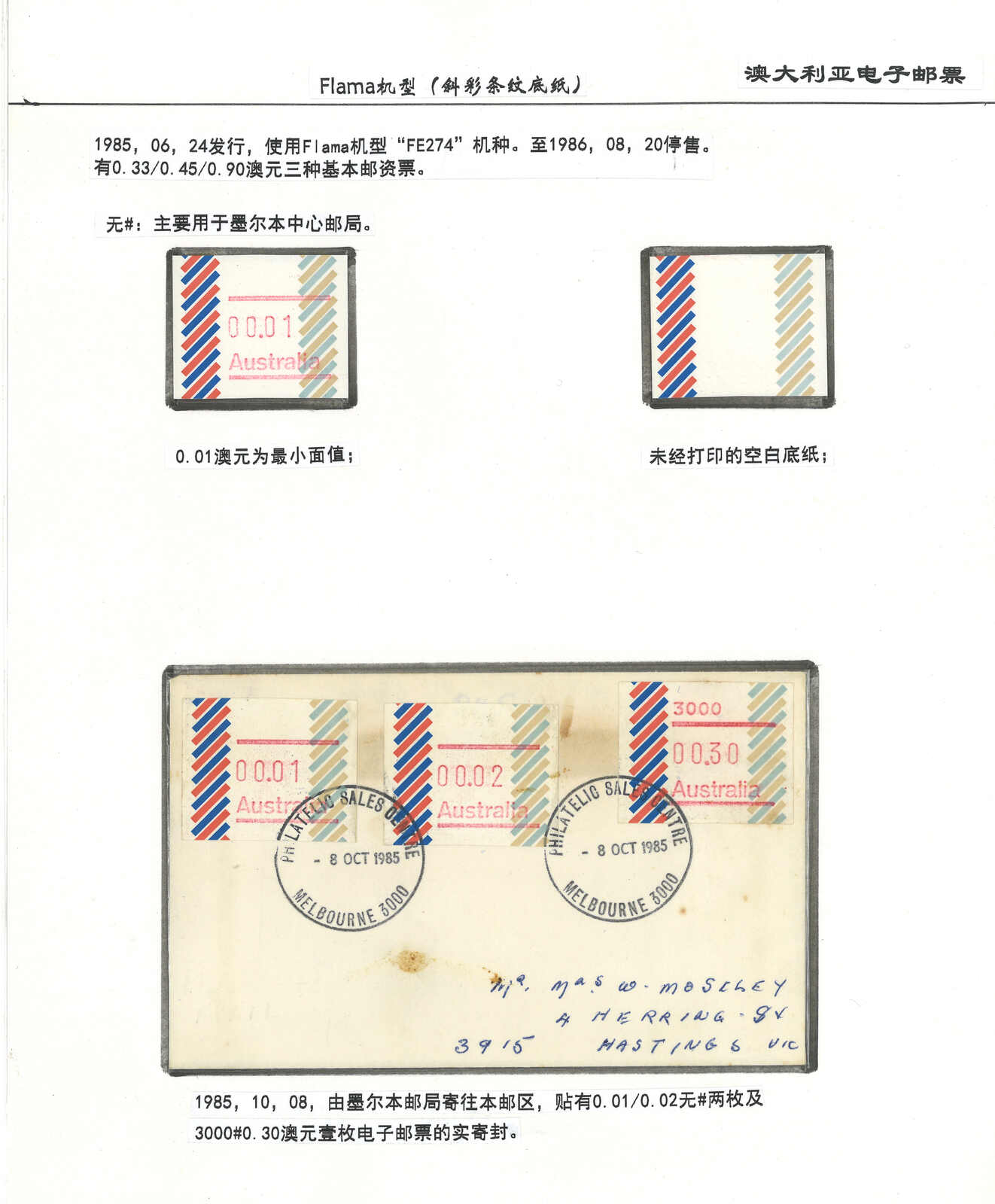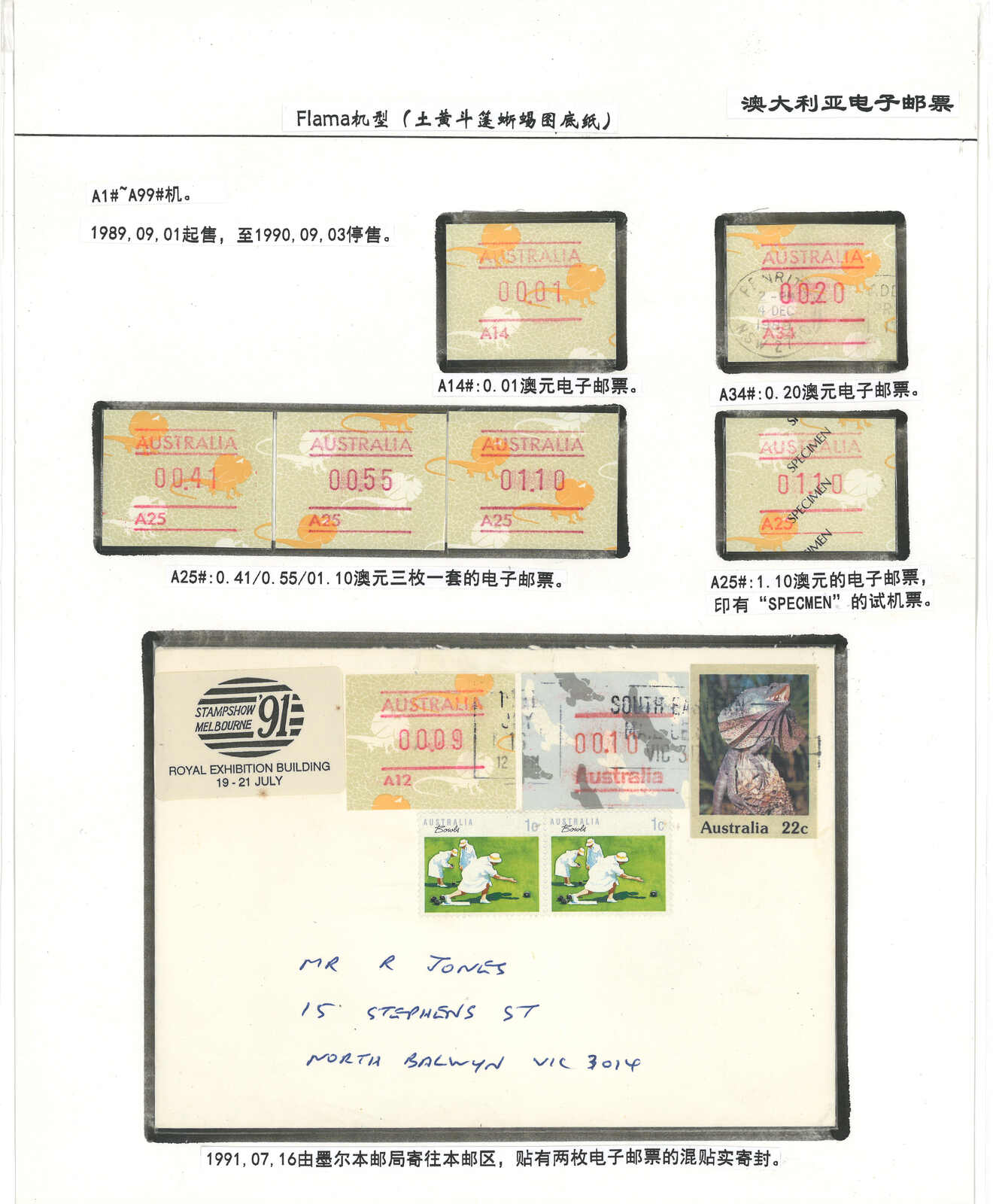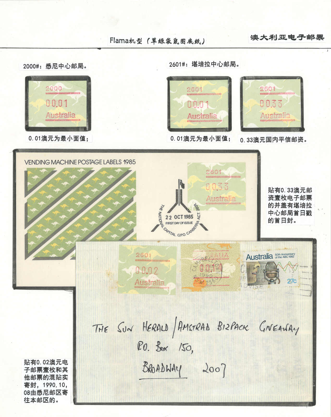 3552 **/cover image1984 Australia 1st ATM stamps and covers in 10 exhibit pages (16 stamps and 16 covers), showing mint stamps and FDC from Sydney, Brisbane, Canberra, Melbourne and other cities. A comprehensive and orderly arranged group.
