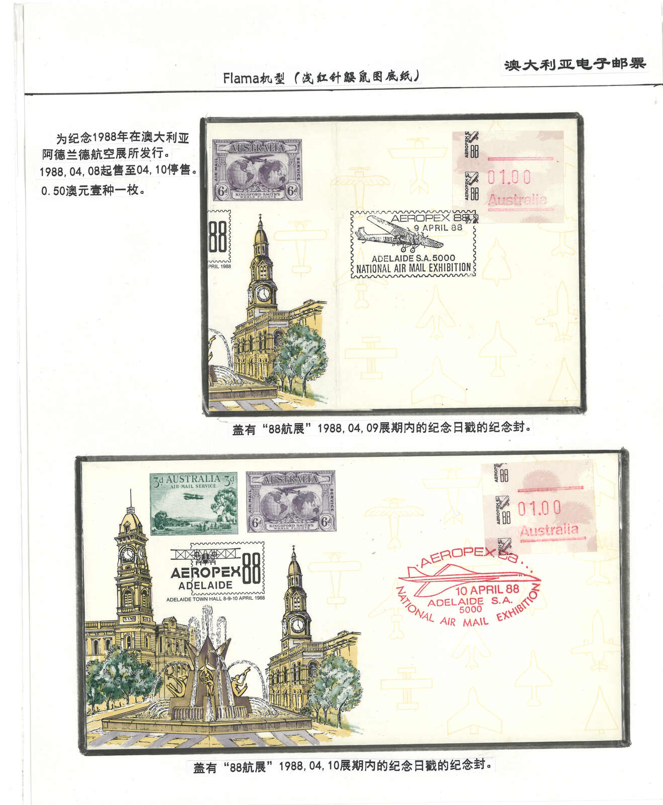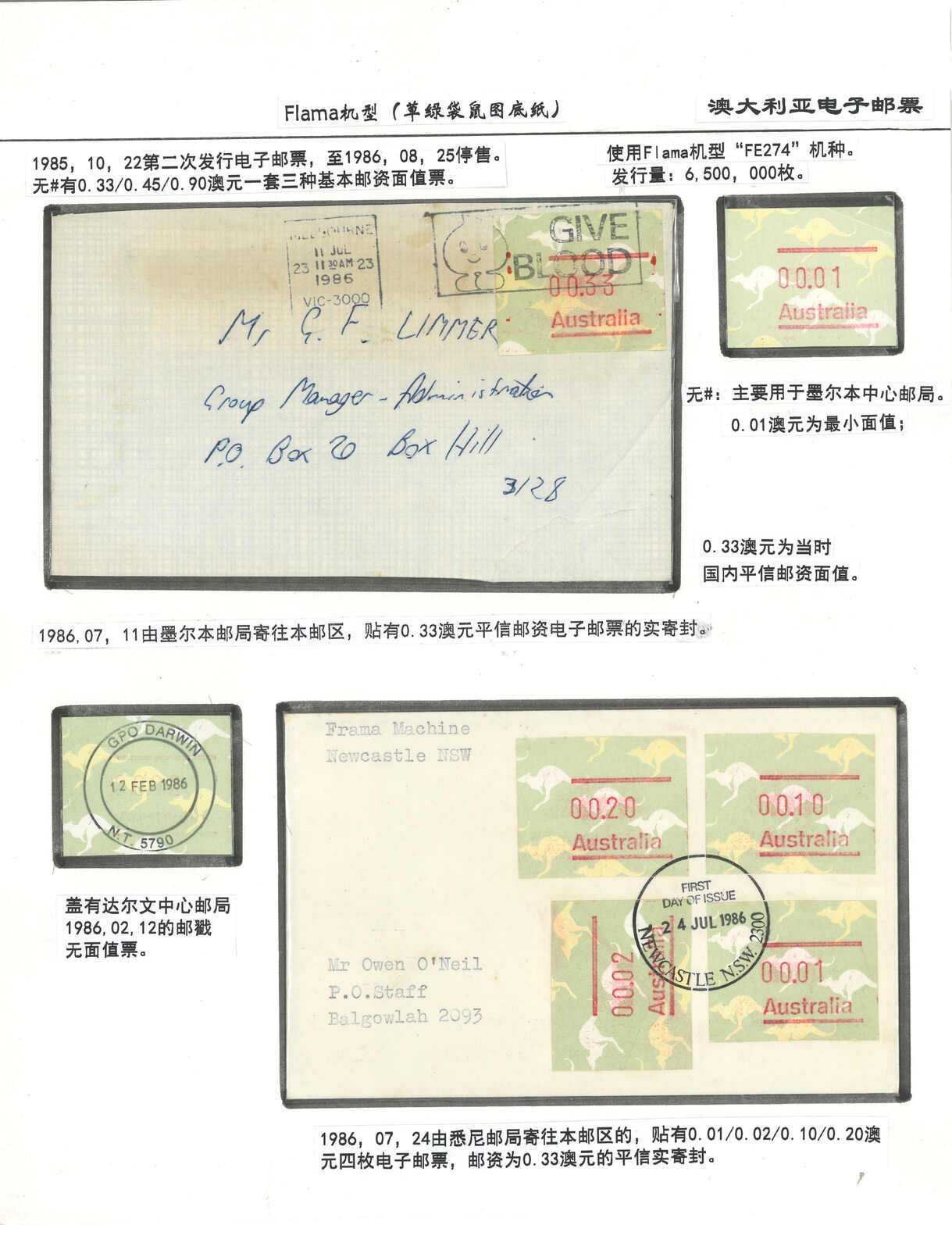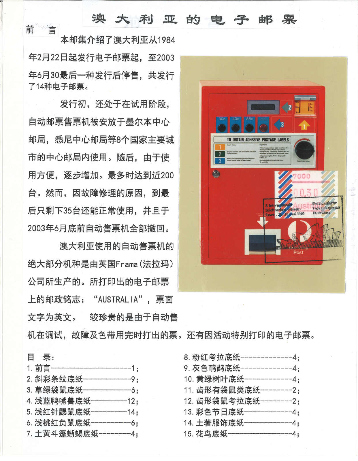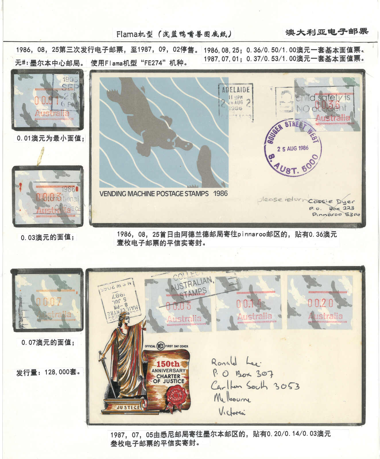 3552 **/cover image1984 Australia 1st ATM stamps and covers in 10 exhibit pages (16 stamps and 16 covers), showing mint stamps and FDC from Sydney, Brisbane, Canberra, Melbourne and other cities. A comprehensive and orderly arranged group.