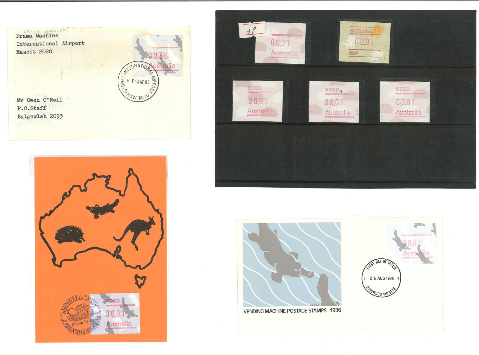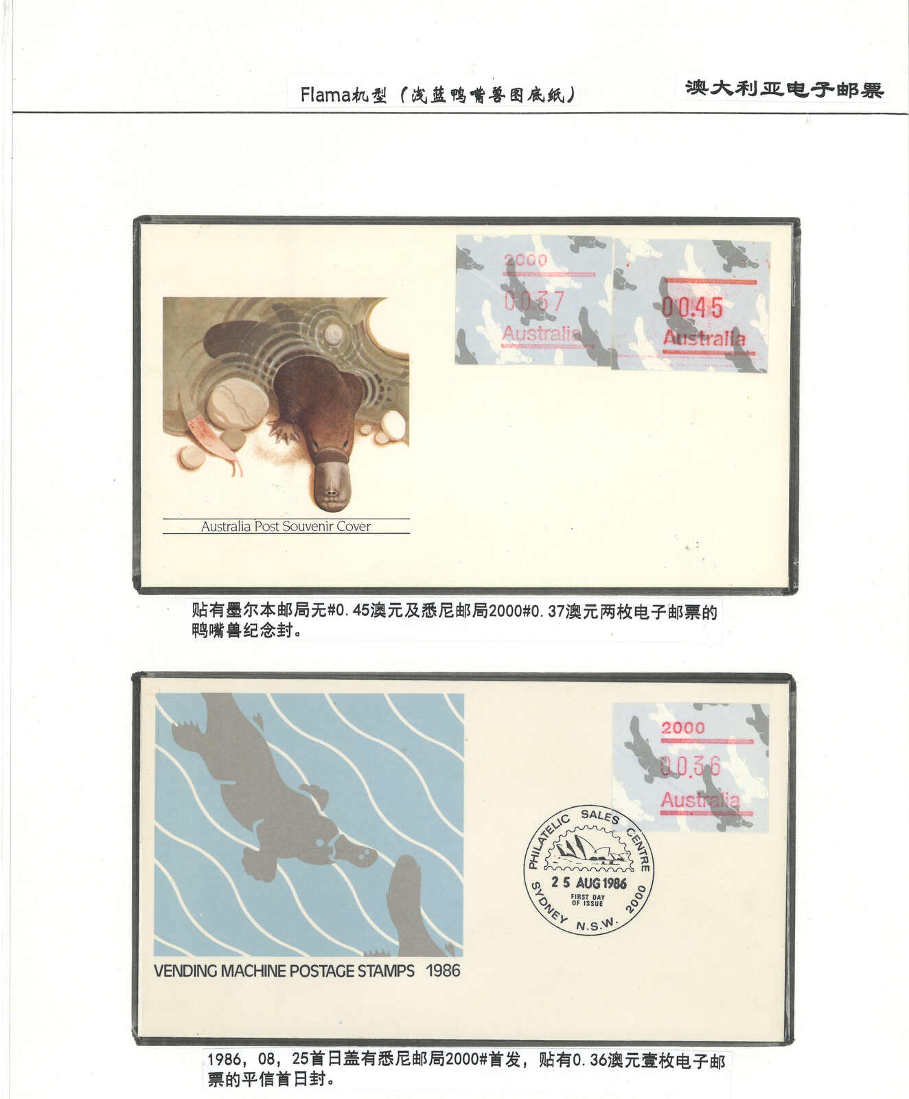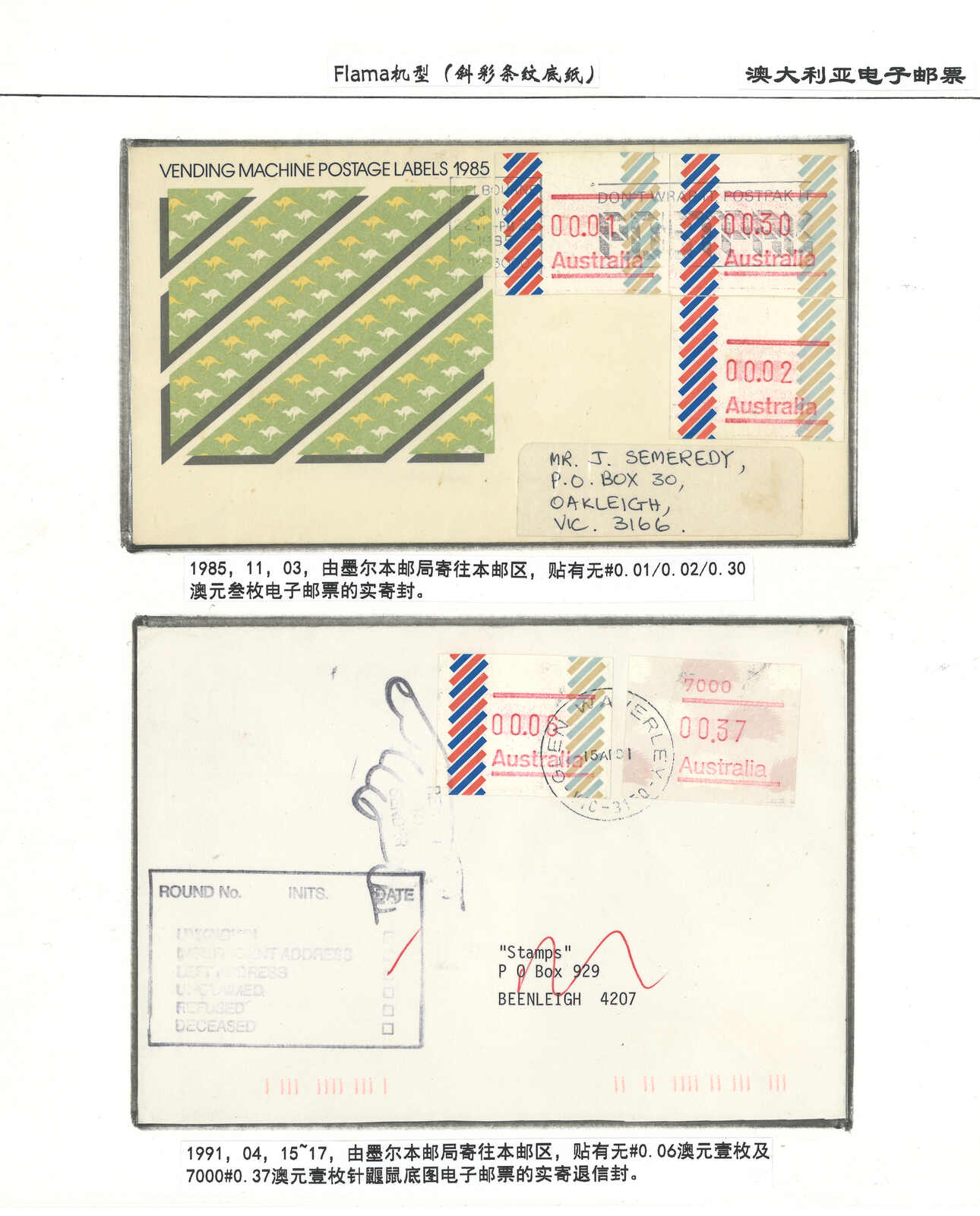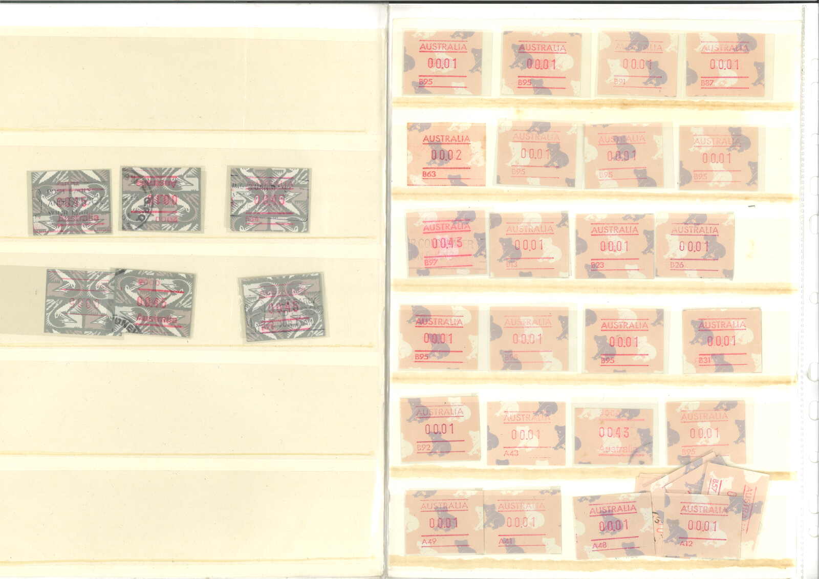 3554 **/cover image1985-1993 a comprehensive collection of Australia Kangaroo, Koala, Platypus, Opossums ATM stamps and covers in 58 exhibit pages (about 50 stamps and 100 covers), showing mint stamps and covers from Sydney, Brisbane, Canberra, Melbourne and other cities. A comprehensive and orderly arranged group.