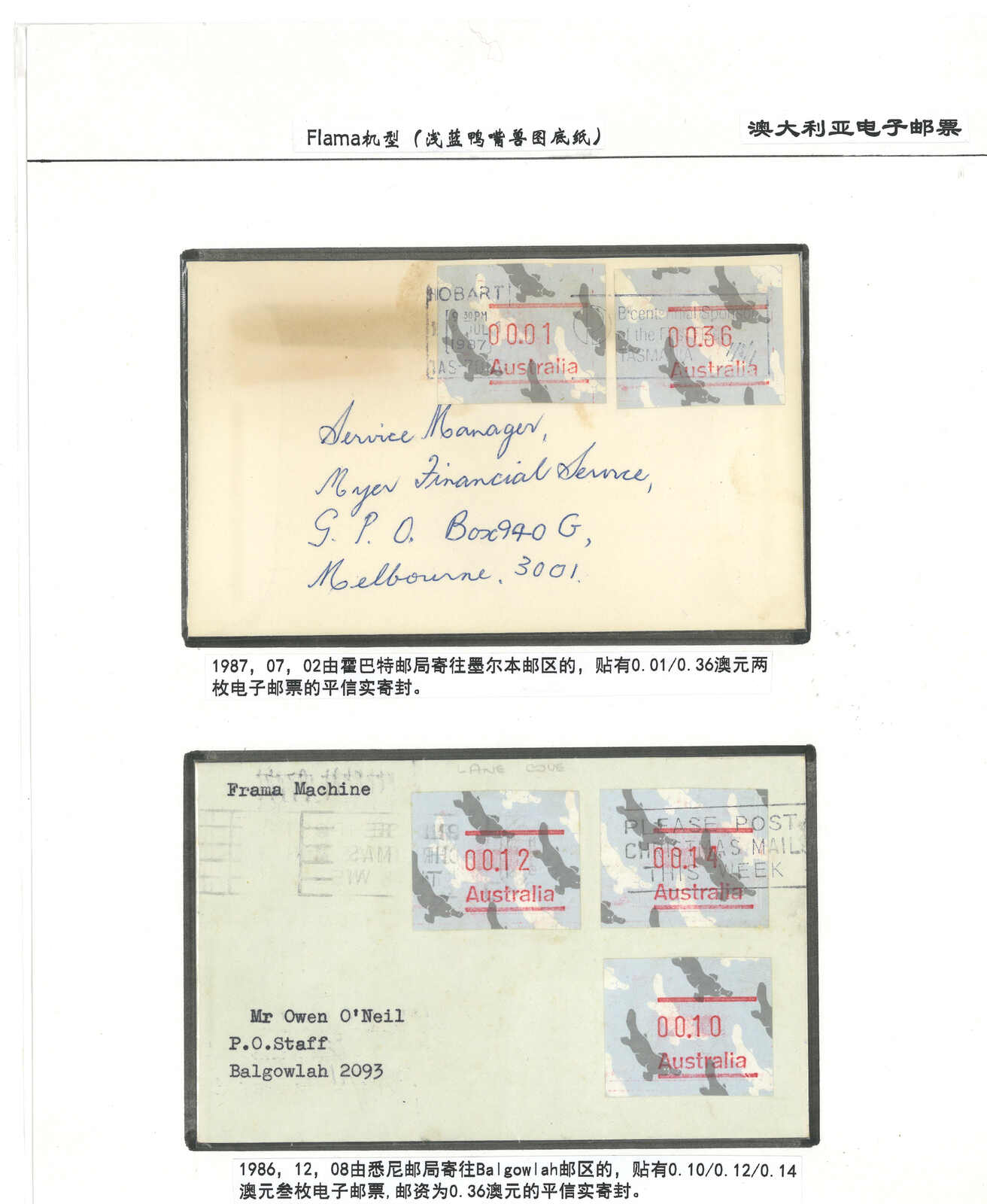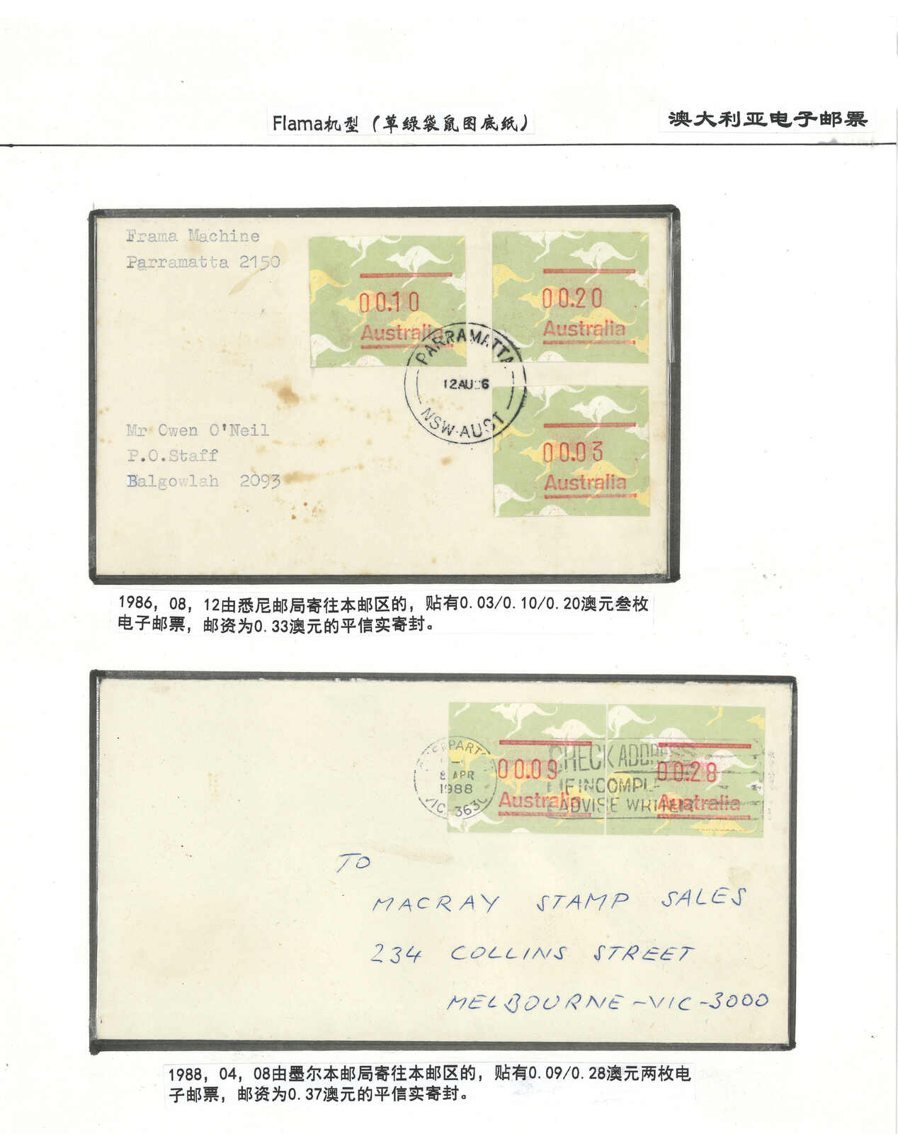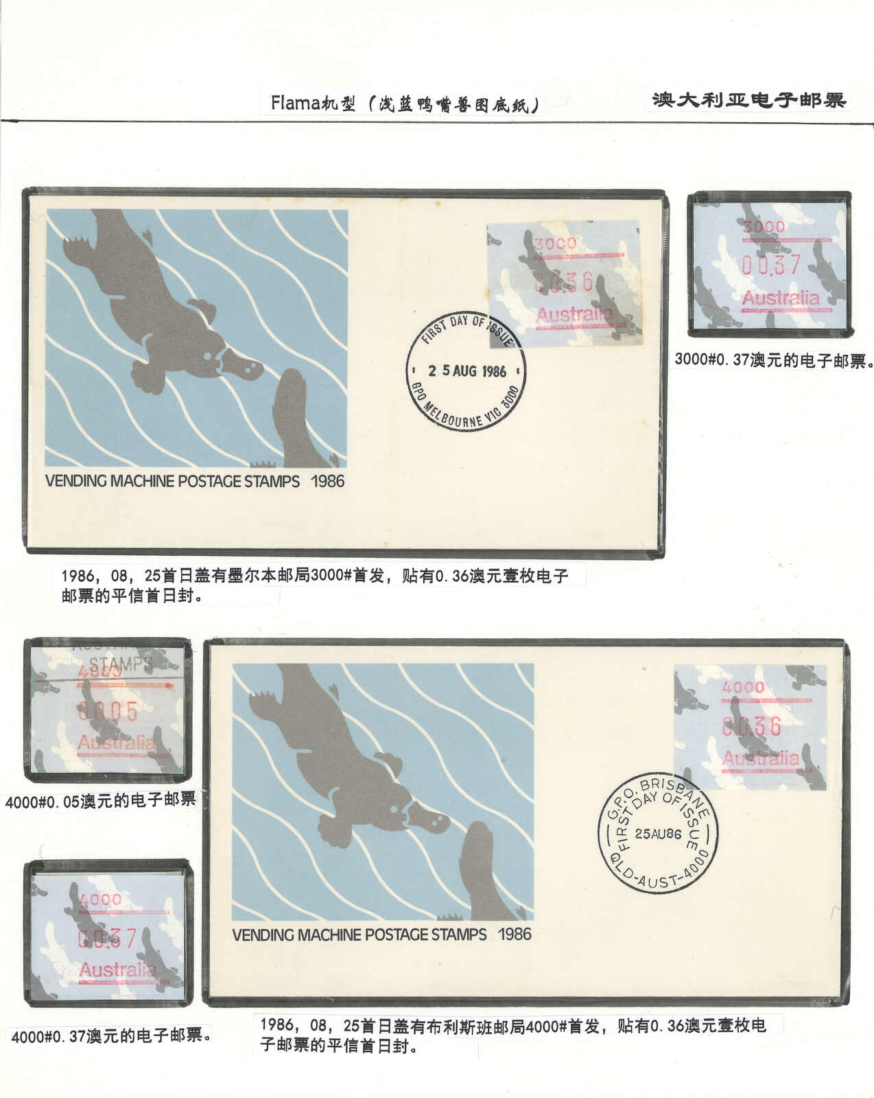 3554 **/cover image1985-1993 a comprehensive collection of Australia Kangaroo, Koala, Platypus, Opossums ATM stamps and covers in 58 exhibit pages (about 50 stamps and 100 covers), showing mint stamps and covers from Sydney, Brisbane, Canberra, Melbourne and other cities. A comprehensive and orderly arranged group.