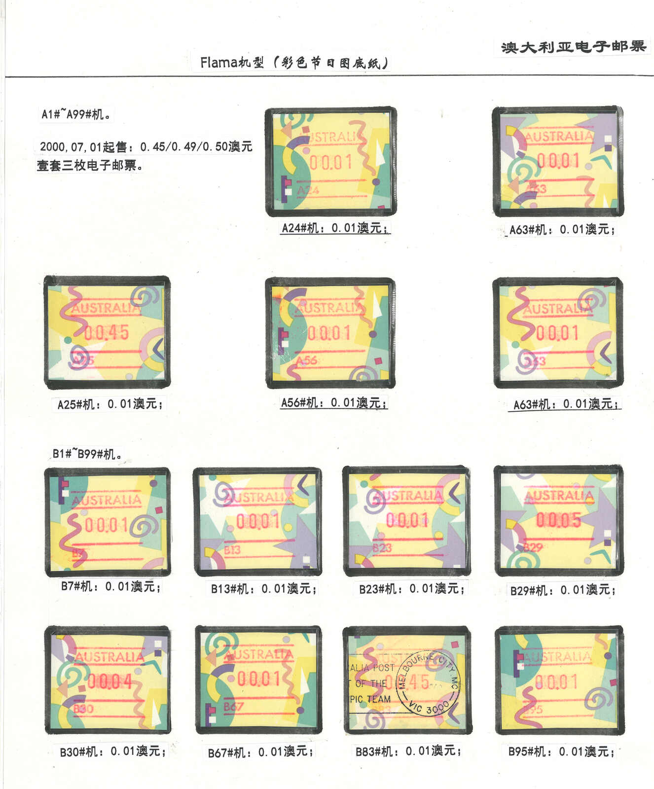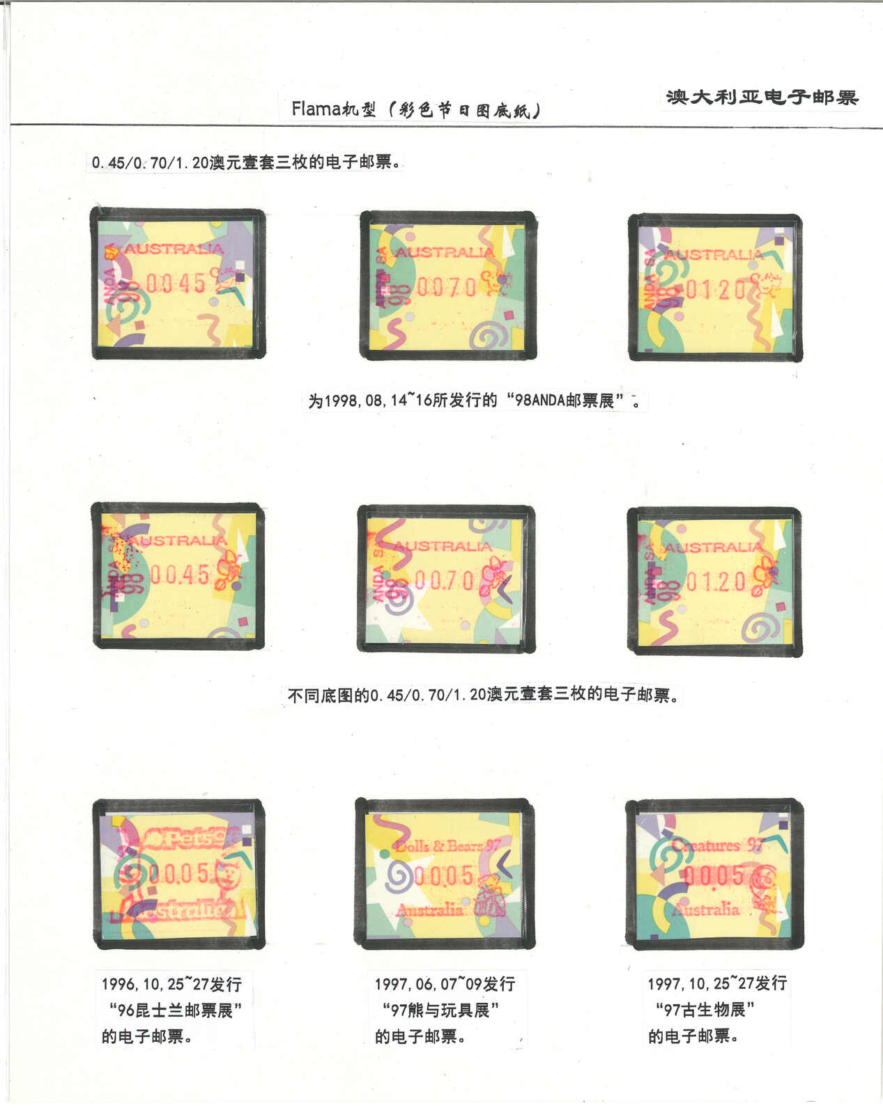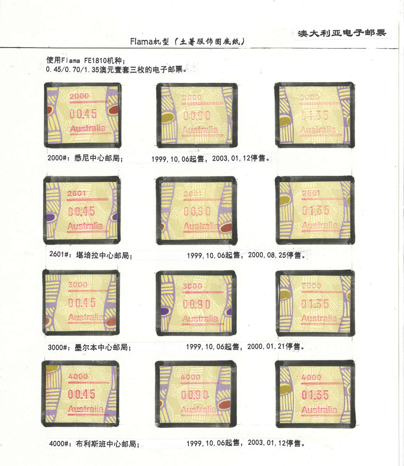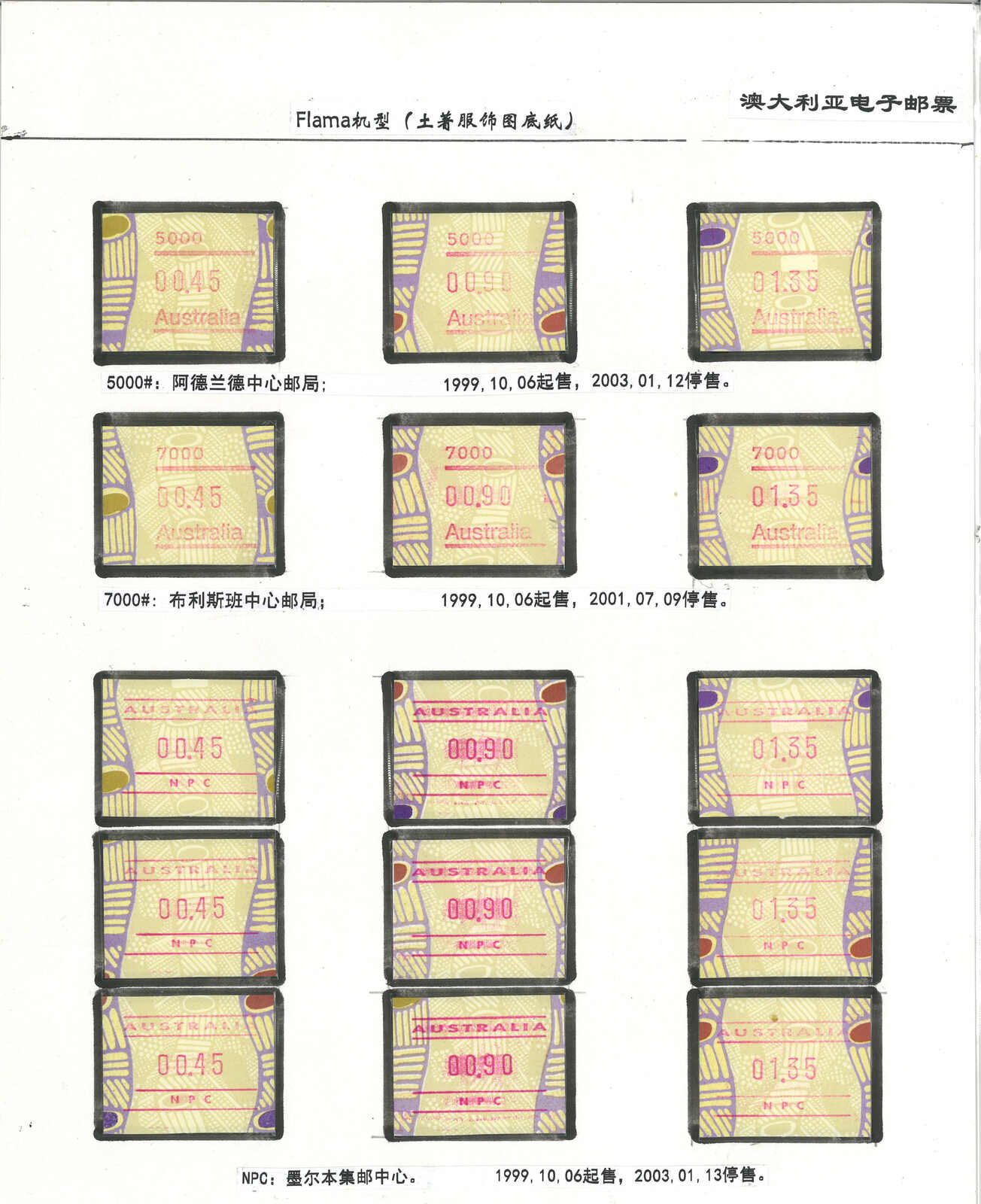 3556 **/cover image1996-2003 a comprehensive collection of Australia Festive Frama, Aboriginal Art and Farewell Frama ATM stamps and covers in 12 exhibit pages (about 100 stamps and 10 covers), showing FDC, mint stamps from Sydney, Brisbane, Canberra, Melbourne and other cities or with stamp exposition printings. A comprehensive and orderly arranged group.