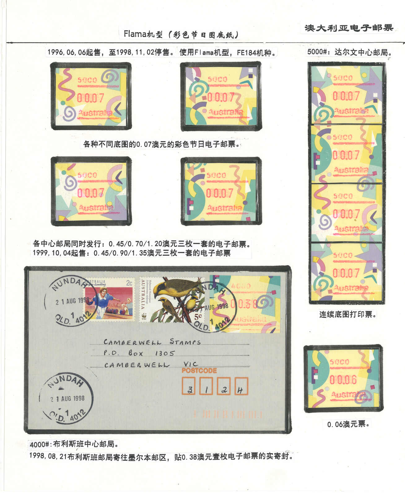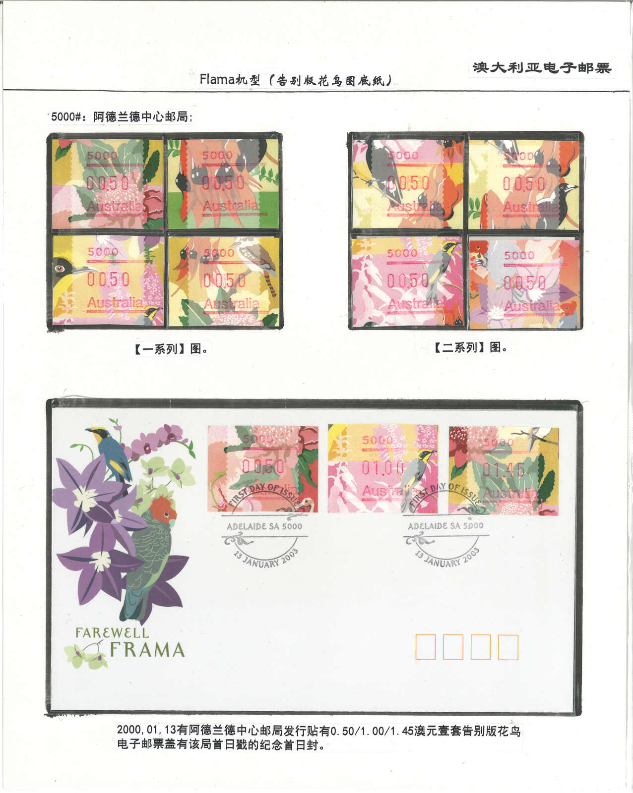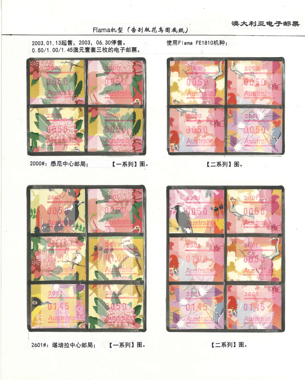 3556 **/cover image1996-2003 a comprehensive collection of Australia Festive Frama, Aboriginal Art and Farewell Frama ATM stamps and covers in 12 exhibit pages (about 100 stamps and 10 covers), showing FDC, mint stamps from Sydney, Brisbane, Canberra, Melbourne and other cities or with stamp exposition printings. A comprehensive and orderly arranged group.