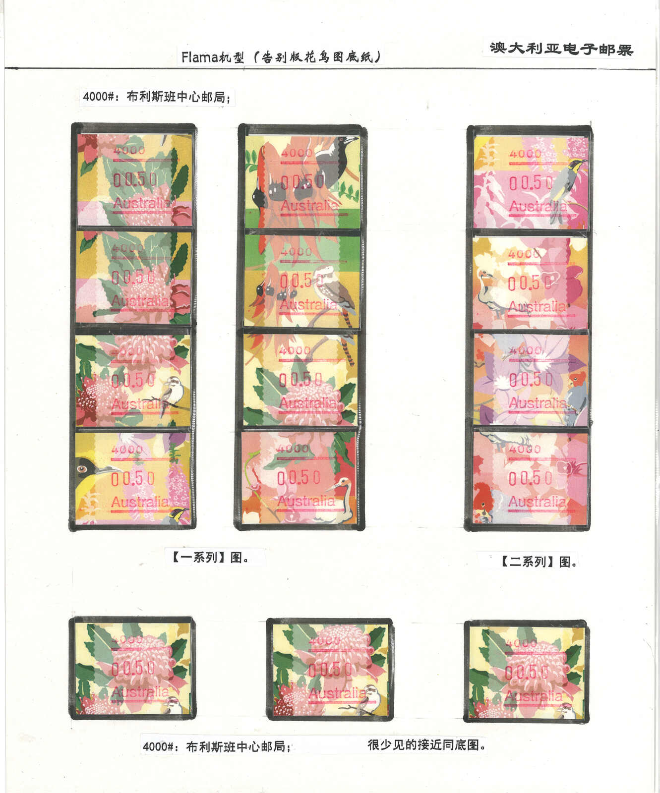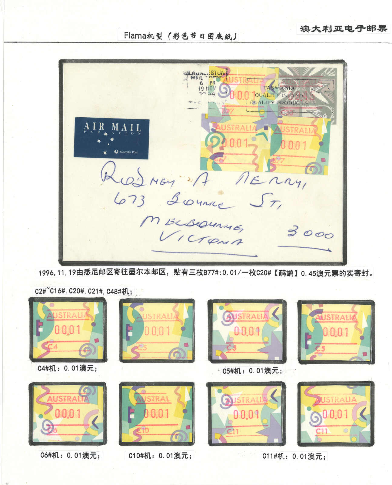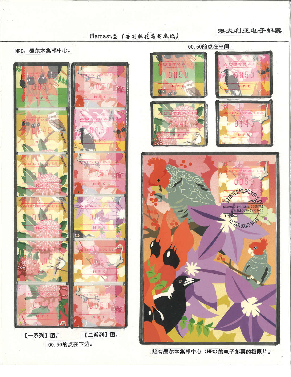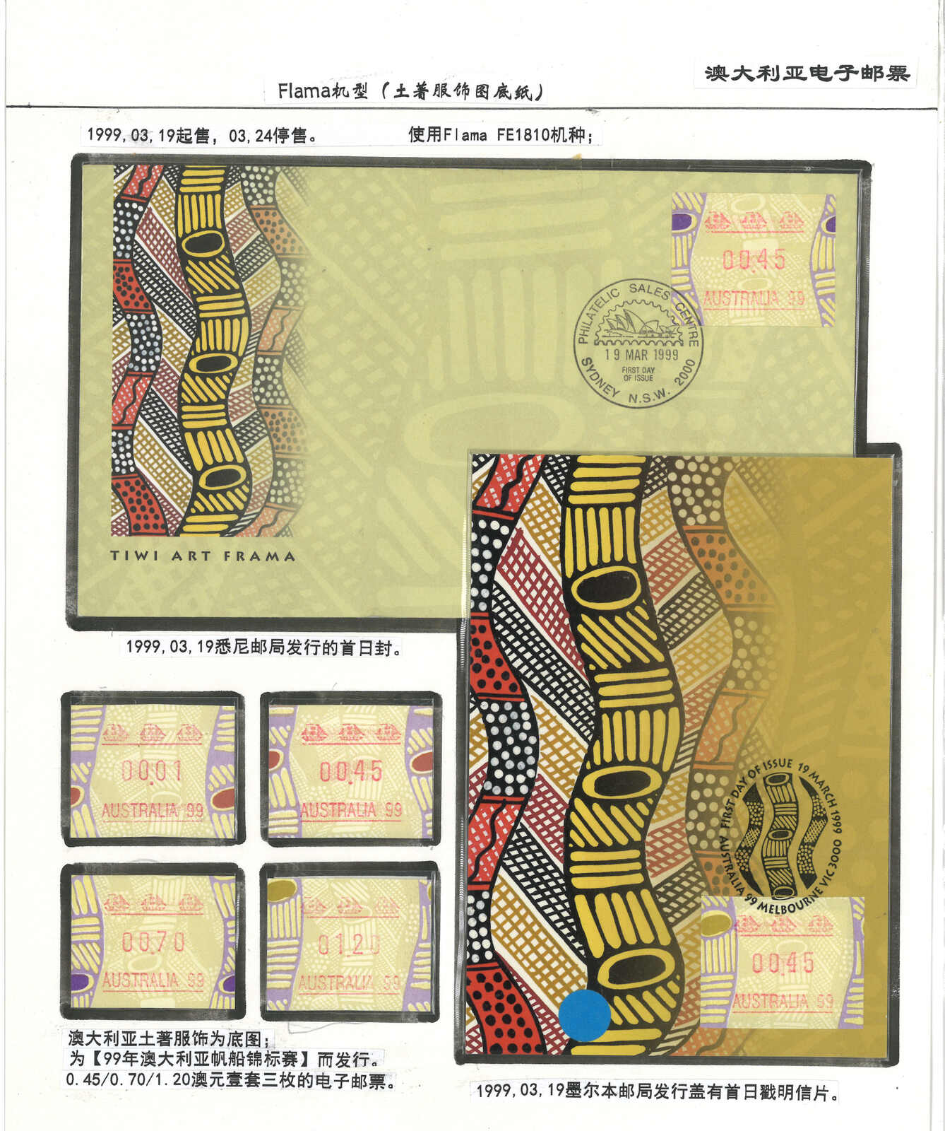 3556 **/cover image1996-2003 a comprehensive collection of Australia Festive Frama, Aboriginal Art and Farewell Frama ATM stamps and covers in 12 exhibit pages (about 100 stamps and 10 covers), showing FDC, mint stamps from Sydney, Brisbane, Canberra, Melbourne and other cities or with stamp exposition printings. A comprehensive and orderly arranged group.