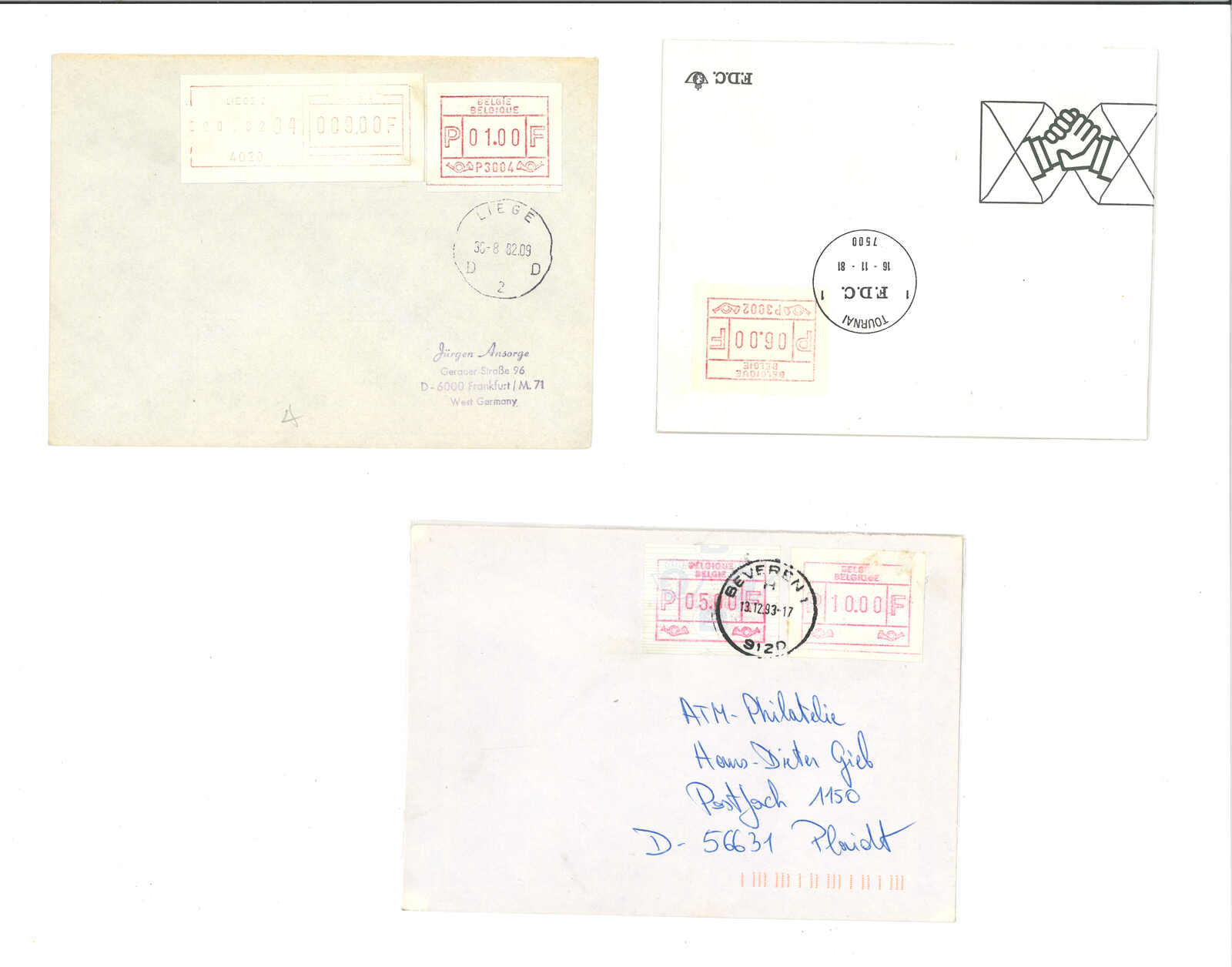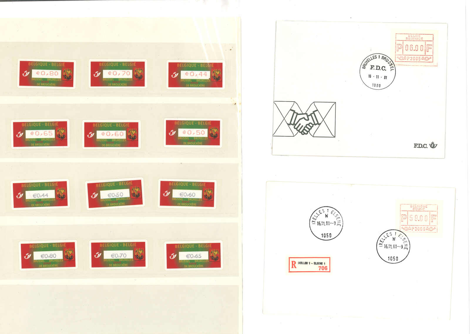 3468 cover image1981 (16 Nov) Belgium 1st Frama issue ATM stamp FDC set of 13. Every cover f.w. 9.00 or 14.00 stamp, tied by Liege, Tournai, Gent, Anterpen, Bruxelles, Elsene cds respectively. Despite being philatelic, still a scarce and beautiful group.