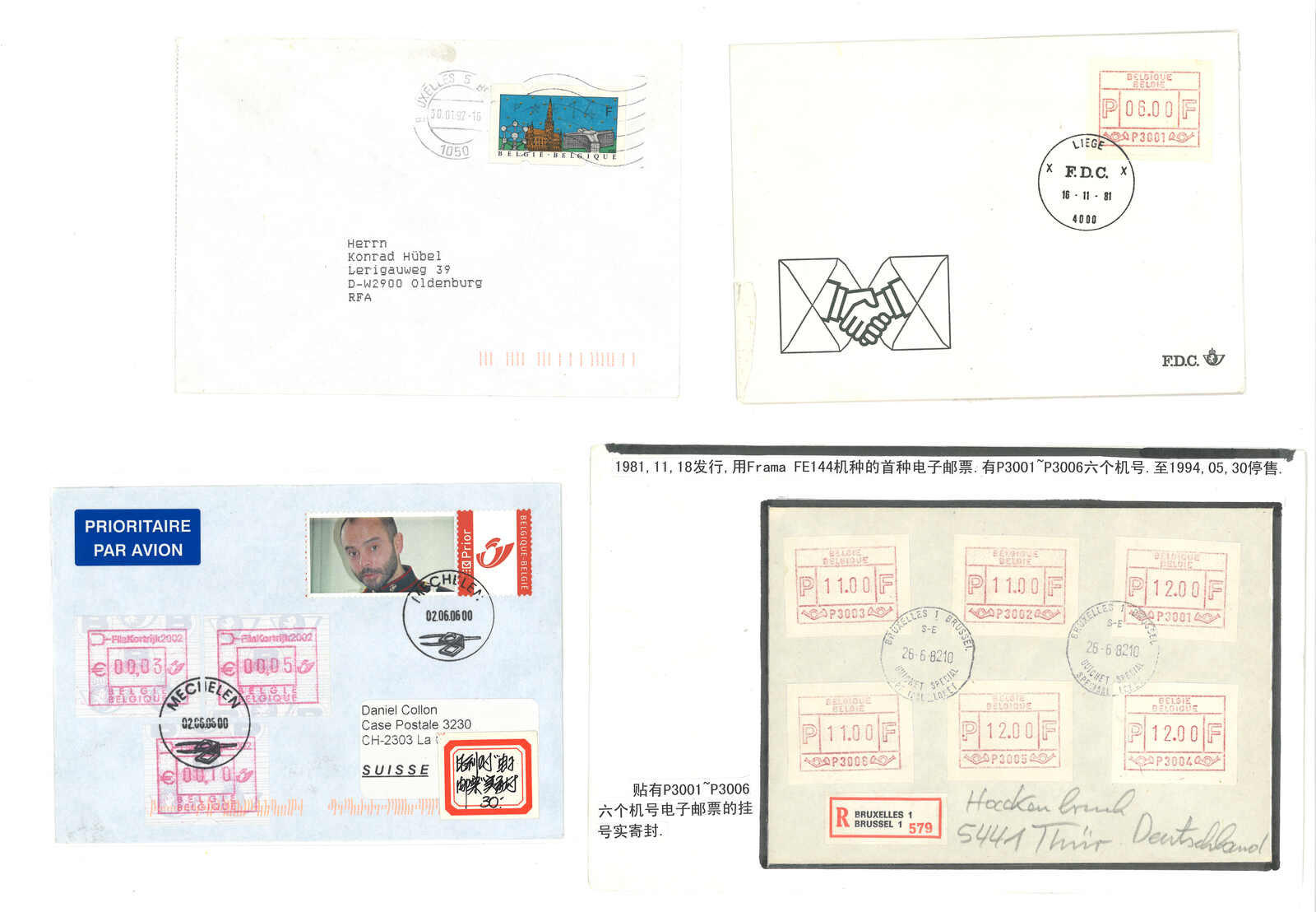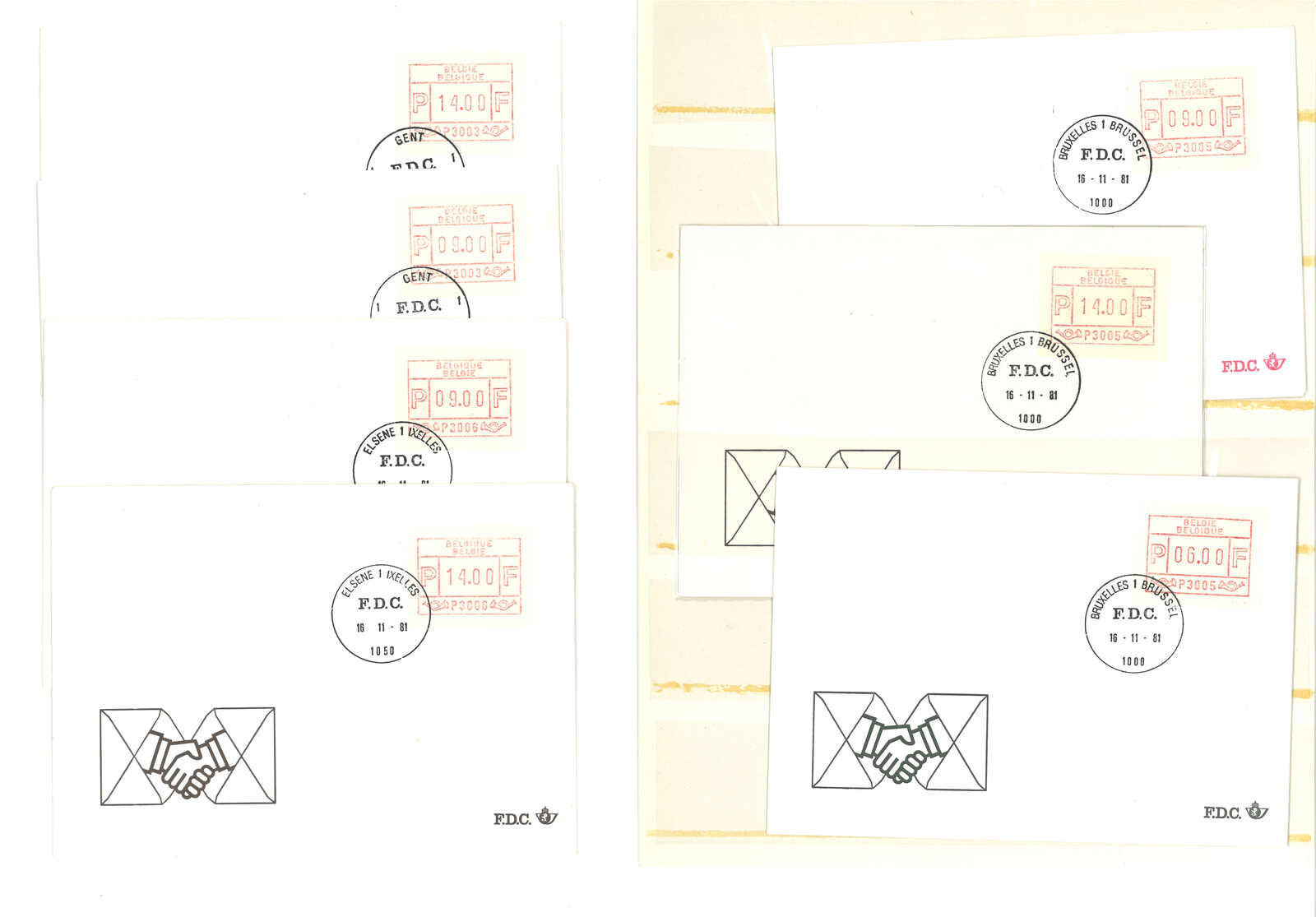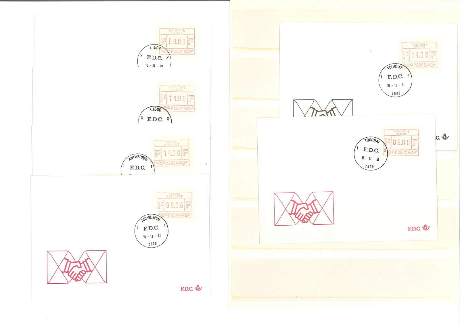 1981.11.16 比利時第一版Frama電子郵票首日封一組十三件,每件都貼9.00或14.00面值票,銷Liege、Tournai、Gent、Anteroen 、Bruzelles等地日戳。雖然為集郵封,但仍十分稀罕漂亮。(Image 1) (Image 2)
