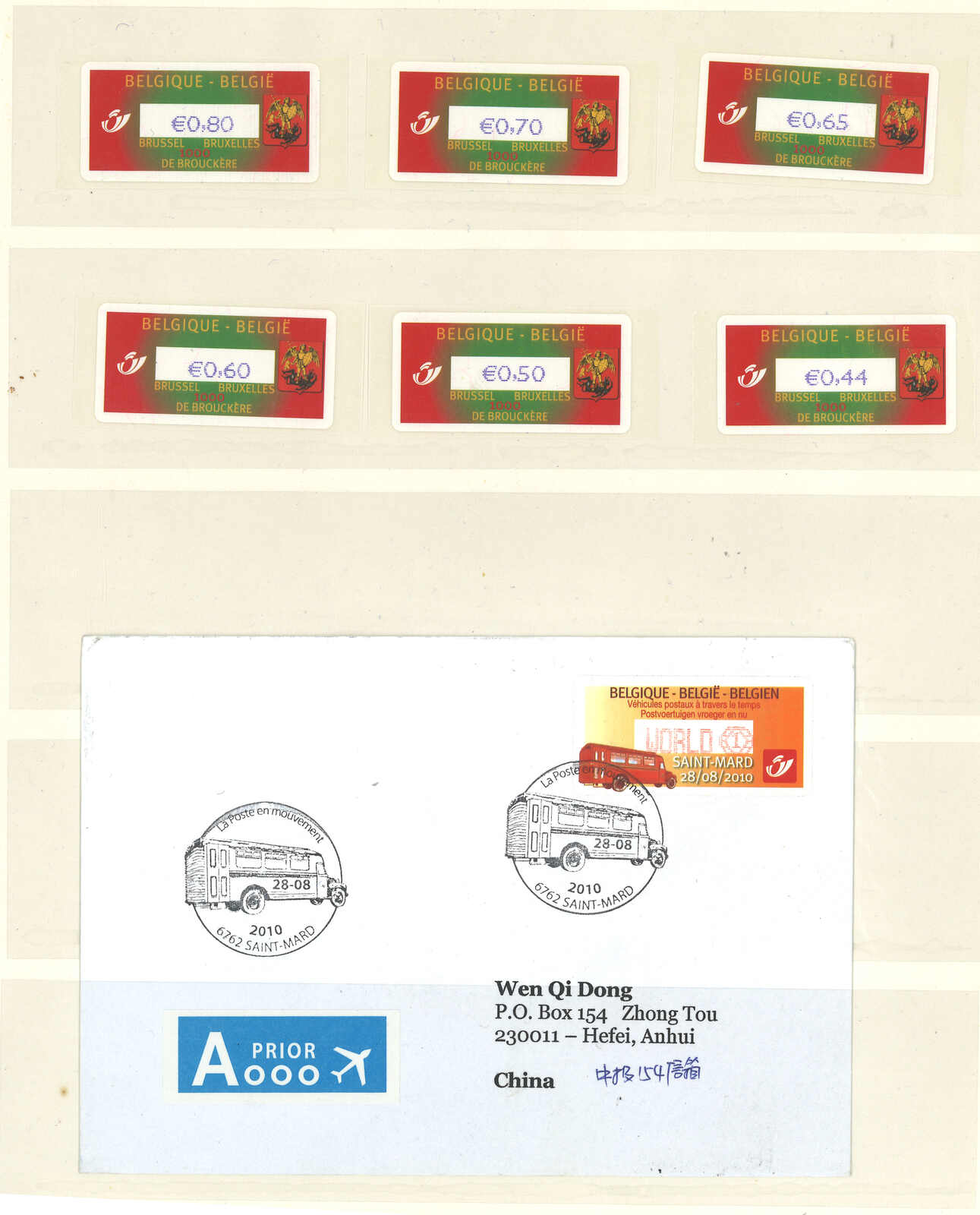 3535 **/cover image1989 Bolivia “Post Emblem” ATM stamp collection (Mi. Nr. 1), containing 10 stamps, 2 FDC and 2 commerically used cover on exhibit page.