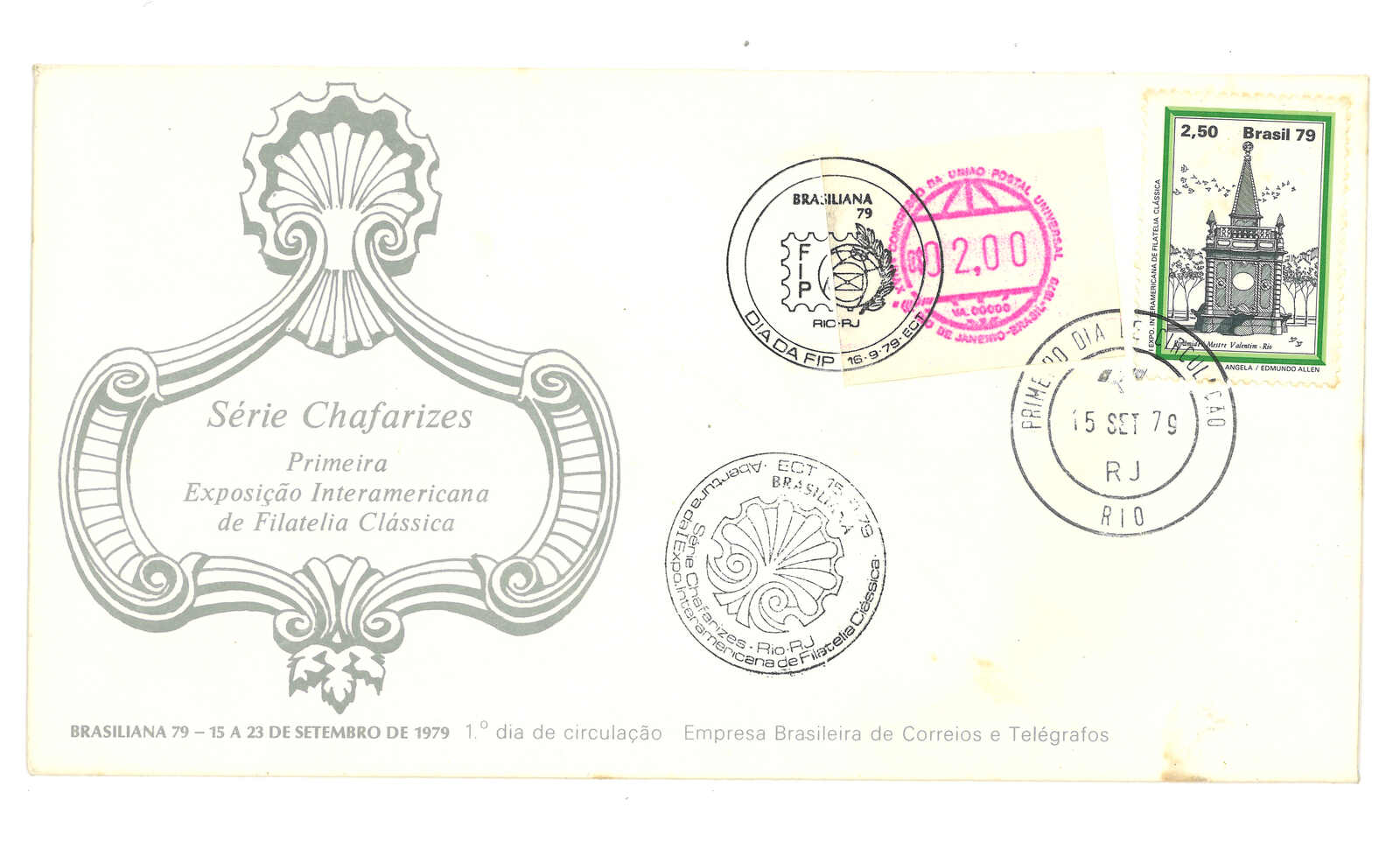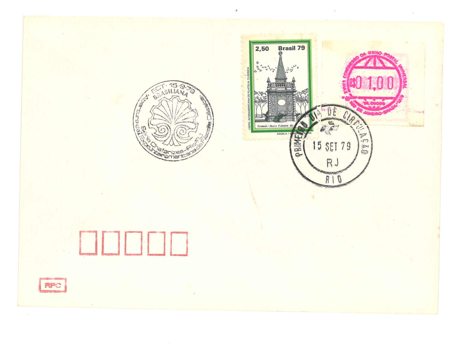 1979.9.15 巴西第十八次萬國郵盟會議2厘士電子郵票首日封(Mi.Nr. 1),加貼2.5里士,銷里約首日日戳,旁 鈐兩款郵展紀念圓戳。 由於海關未有及時批准此票之售賣機,故此票未有按原訂計劃於萬國郵盟會議上投入服務,而是於巴西郵展上亮 相。由於投入服務的首日正好同是調資首日(國內平信3.2厘士),故大多存世例子均未有貼用正確郵資。自動 化郵票之罕品。(Image 1) (Image 2)