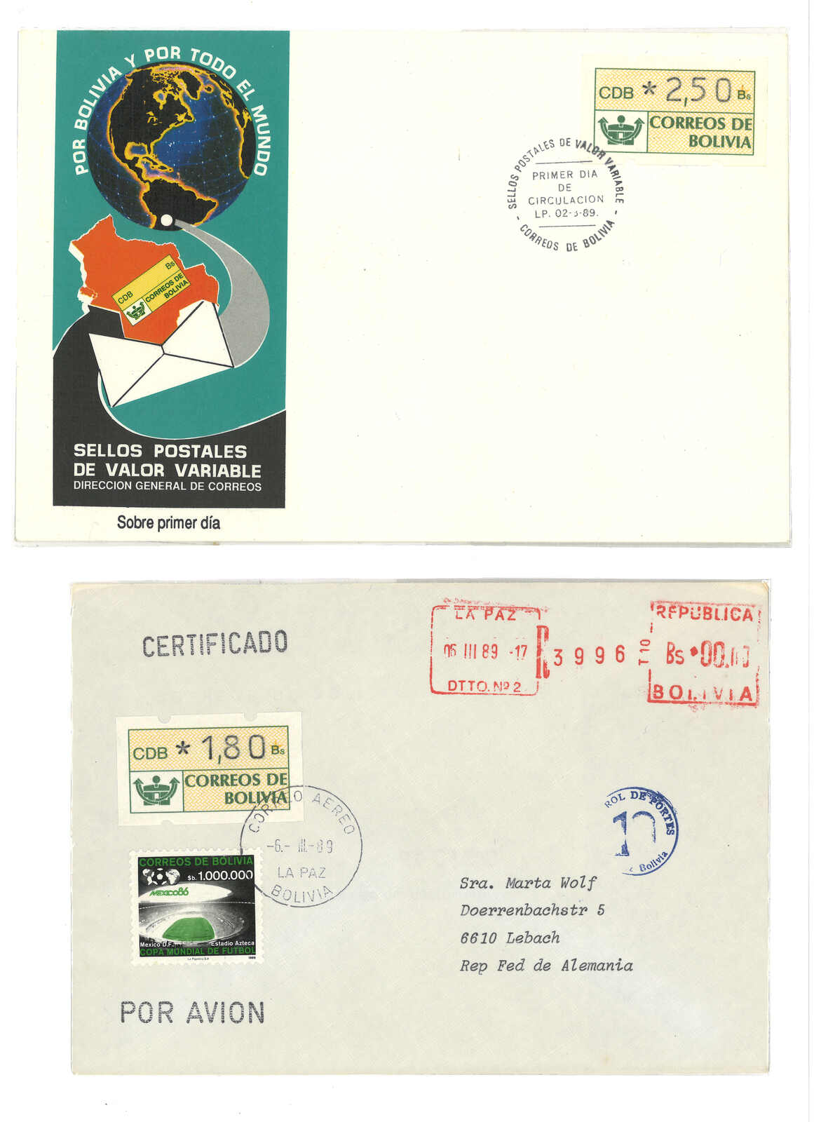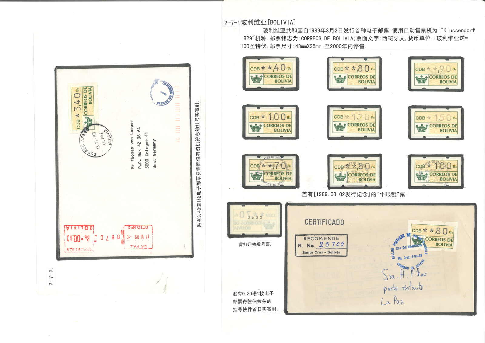 1989年玻利維亞“郵徽”電子郵票集藏(Mi.Nr.1),包含十枚票、兩件首日封及兩件實寄封,置於展頁上。(Image 1) (Image 2)