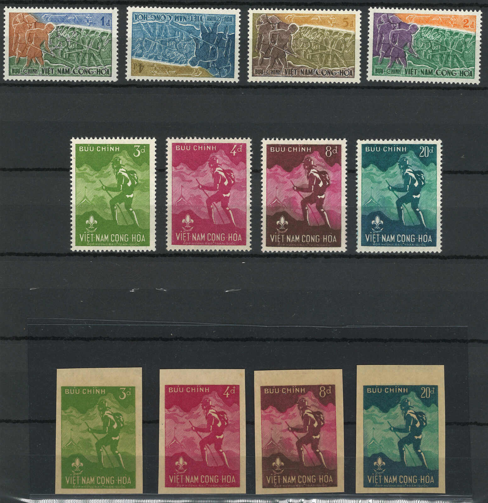 1959年共和國四週年及第一屆童軍大露營豪華試印張新全各一套,童軍大露營再附一套無齒票。無貼上品。(Image 1) (Image 2) (Image 3)